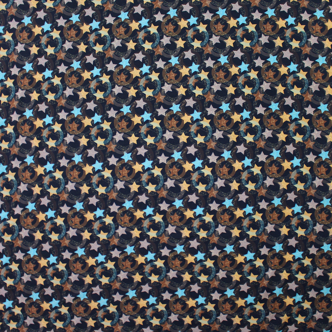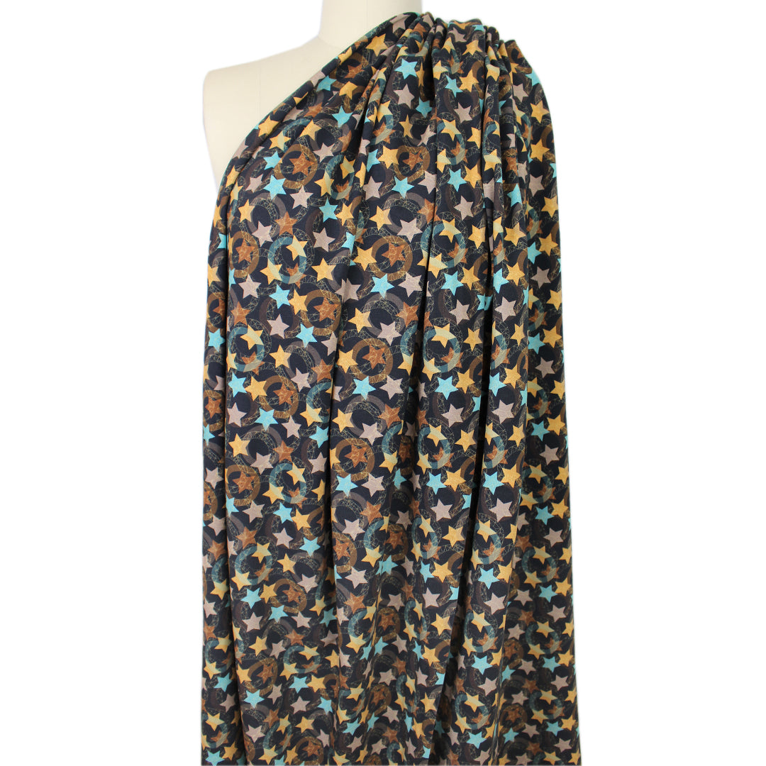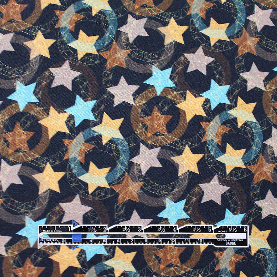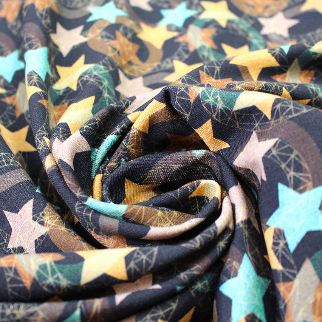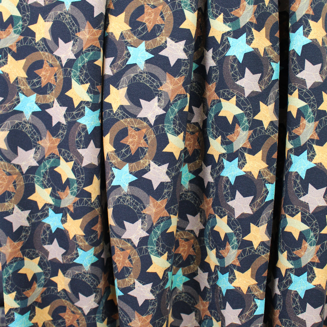 This is a wonderful cotton/spandex French terry knit, imported from The Netherlands. It is opaque with some body in the drape, and is a medium-light weight with a plain knit stitch on the face and a flat terry texture on the back. The fabric is soft and substantial, with about 20% stretch widthwise and lengthwise. It is Oeko-Tex certified for non-toxic chemicals and dyes. The "stamped star" design (5.5" repeat) features aqua, butternut, acorn, soft teal, etc. on a black background (PANTONE 16-5114, 16-1325, 15-1145, 19-4316, etc.). Make a tee, top, hoodie, tunic, skirt, dress, etc. The manufacturer recommends hand or machine wash warm, hang to dry. Please test first.