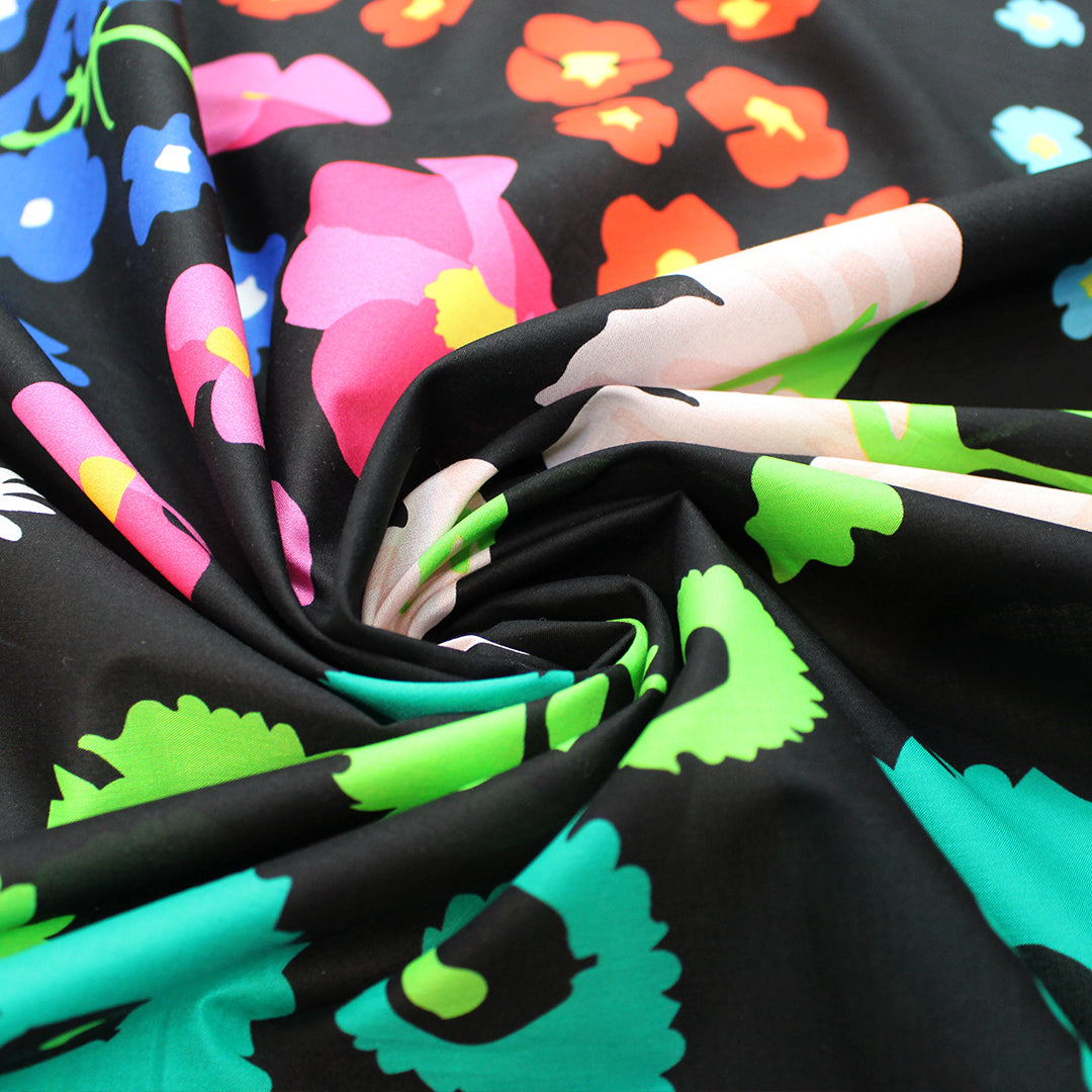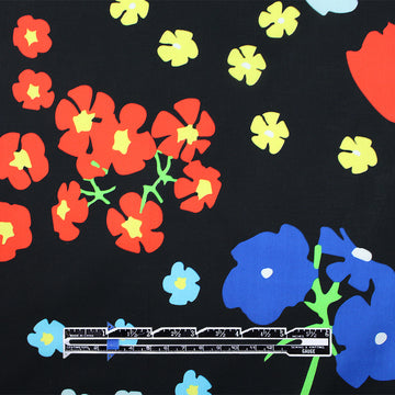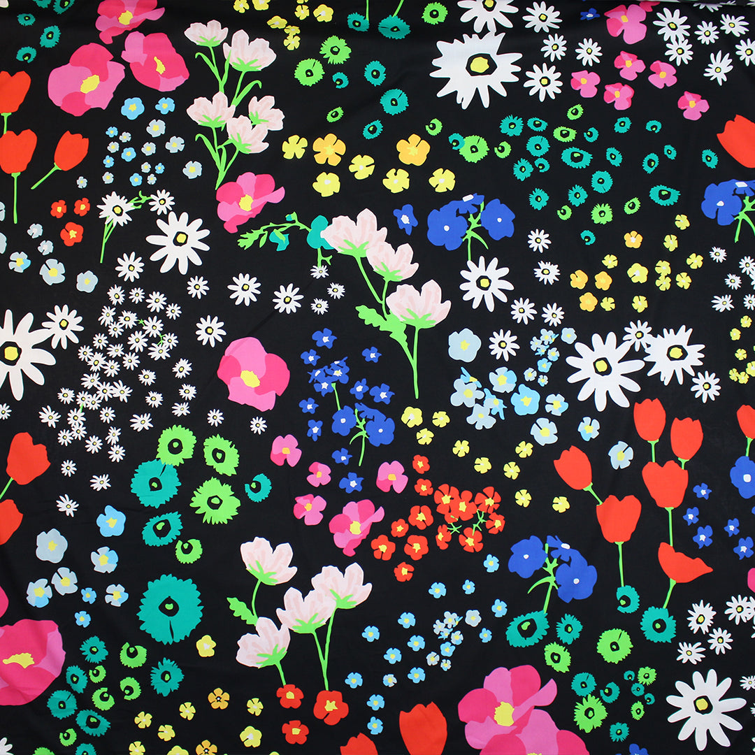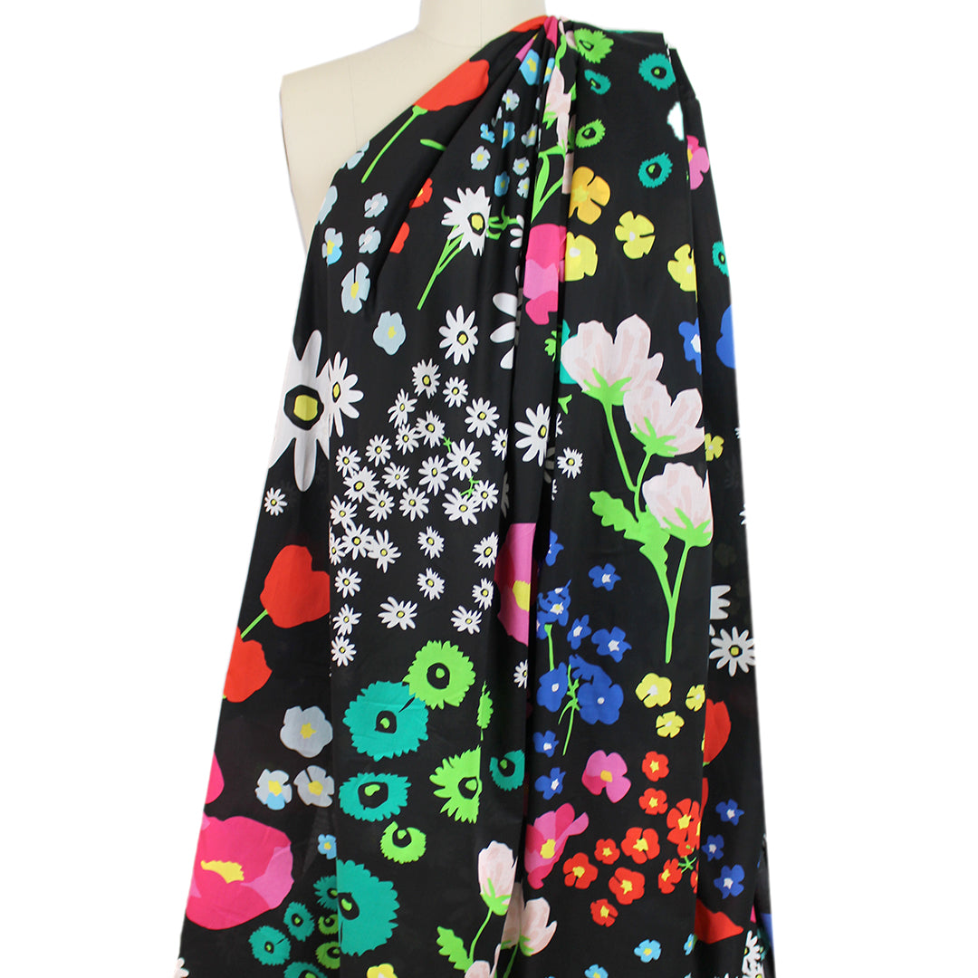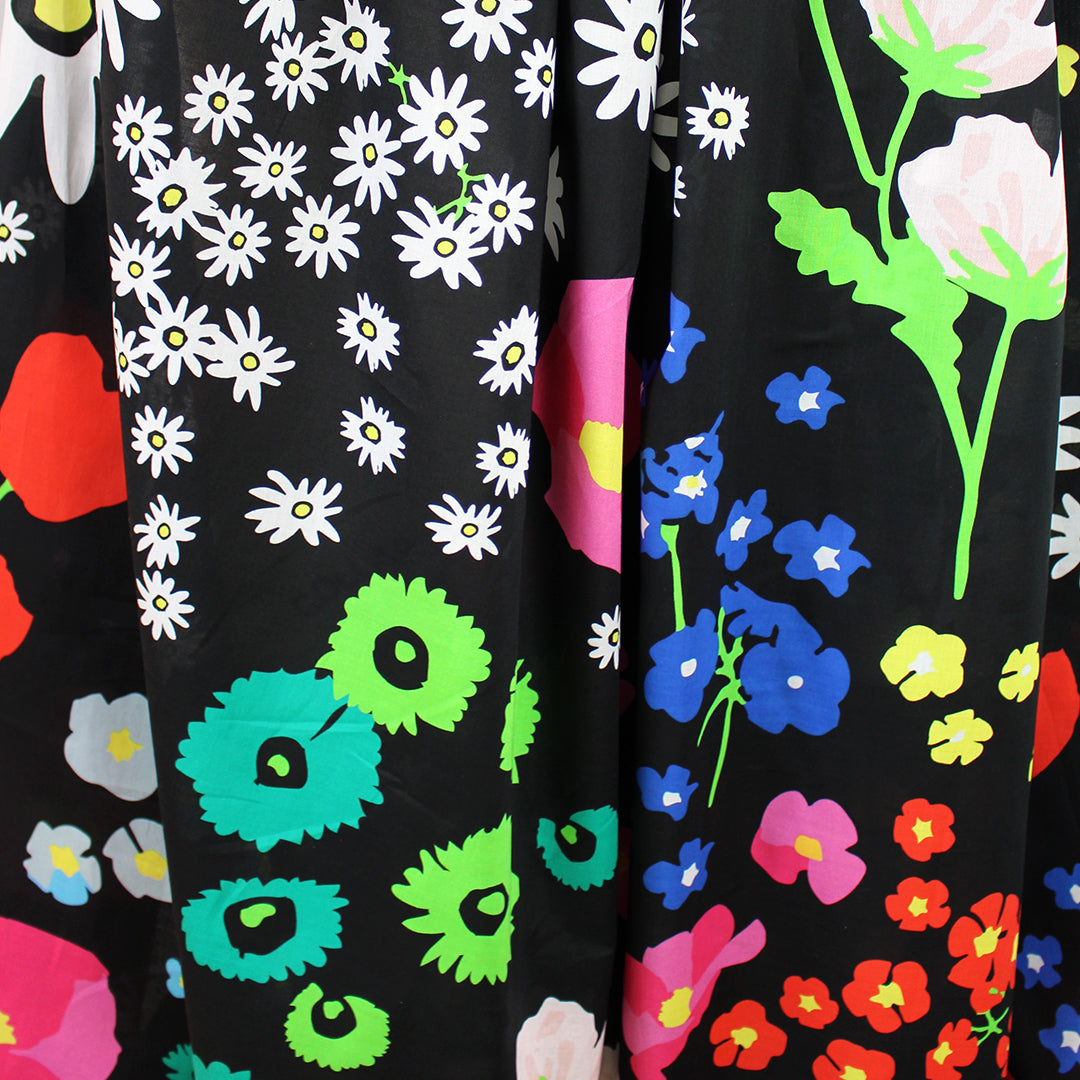 From deadstock of the famous brand named in the title, this is a fine quality printed cotton shirting woven, a light weight that is semi-opaque with a somewhat crisp, cottony drape. The absolutely delightful "flowery personalities" print (52" repeat) features stylized flowers in lemon, azalea, fuchsia, green teal, cherry red, spring green, cobalt, etc. on a jet black background (PANTONE 16-5533, 12-0643, 16-2120, 17-2033, etc.). It has a matte finish and a refined hand with no stretch, and is perfect for shirts, tunics, tops, or line for dresses, skirts, etc! Hand wash, and hang to dry, or test first if you wish to try machine washing.