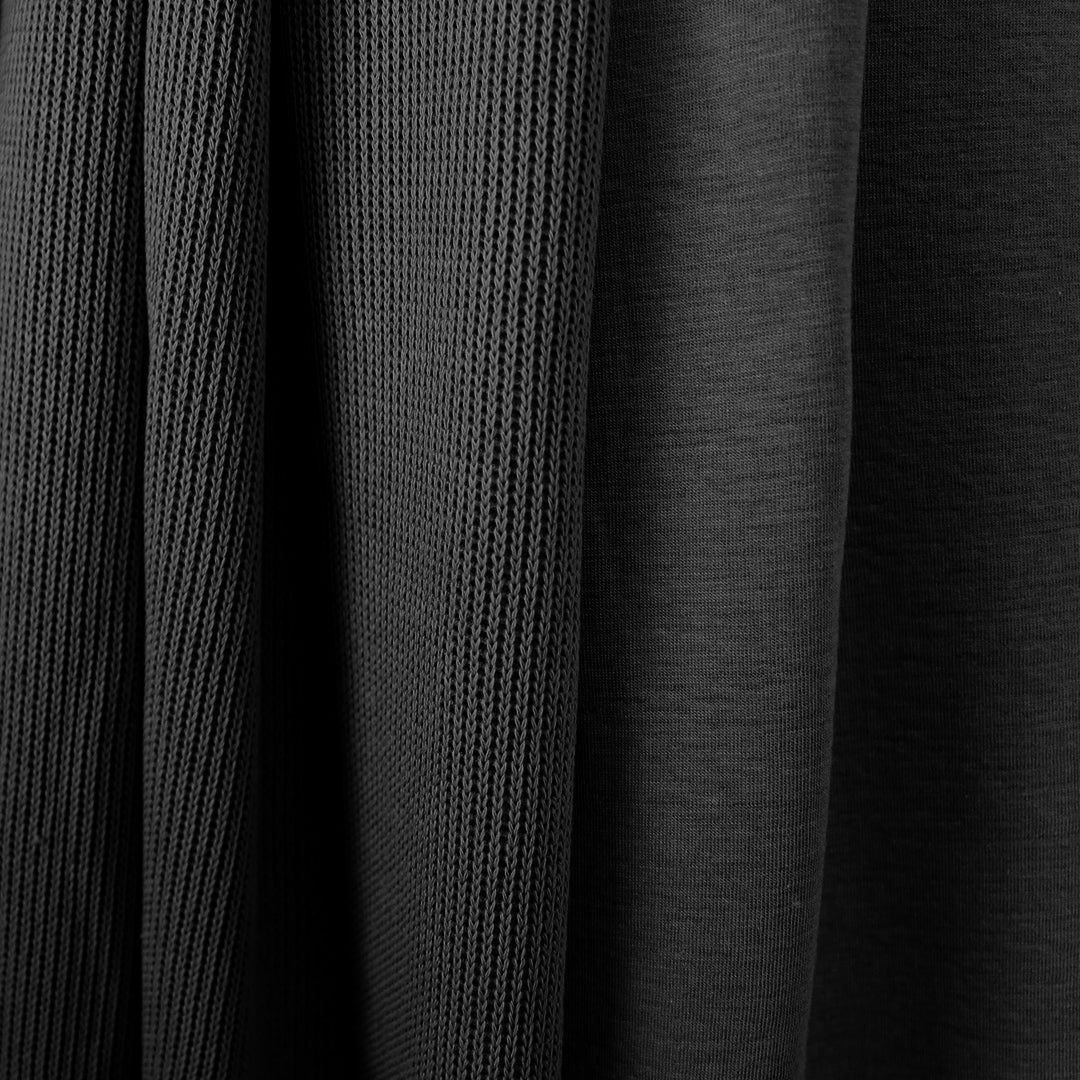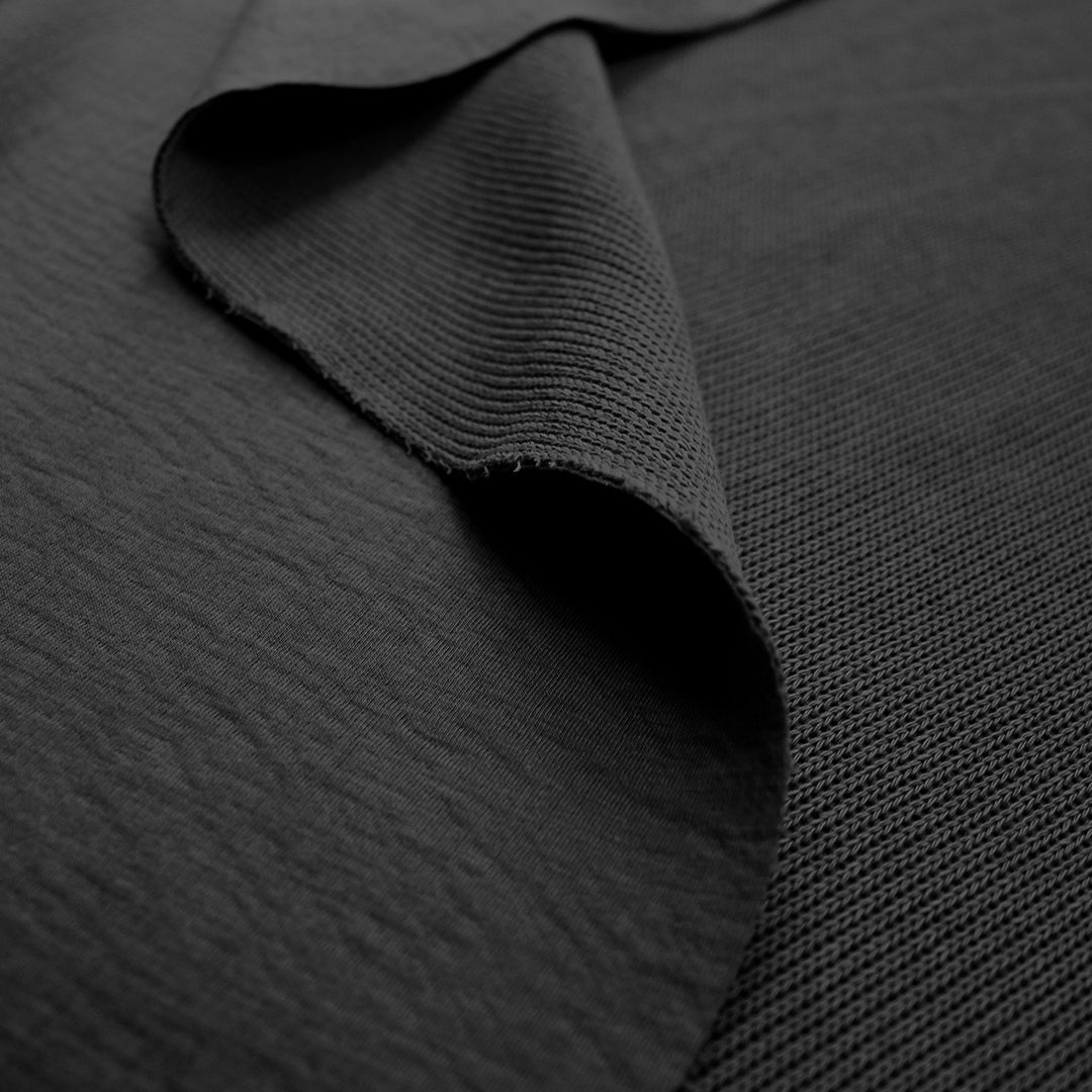 From Mind the Maker of Denmark, this is a fantastic organic cotton blend doubleface with a unique texture on each side, both so wonderful. The right side is a 1x1 ribbed knit stitch, soft and smooth but visually rich with texture. The reverse is a very fine plain knit stitch with an enticing rippled texture, very similar in appearance to a finely woven double gauze. The two layers are knitted together and cannot be separated. This fabric is stable, but has about 10% give in the width only. It is opaque and medium weight with some body in the drape. It has a soft hand and while it is substantial, it is not dense or heavy. The color is a jet black with a matte finish. This fabric is Oeko-Tex certified and uses organic cotton, assuring non-toxic fibers, chemicals and dyes. Perfect for a cardigan, jacket, pullover, tunic, sweater dress or skirt, etc. Hand wash and lay flat to dry. .5 yds.