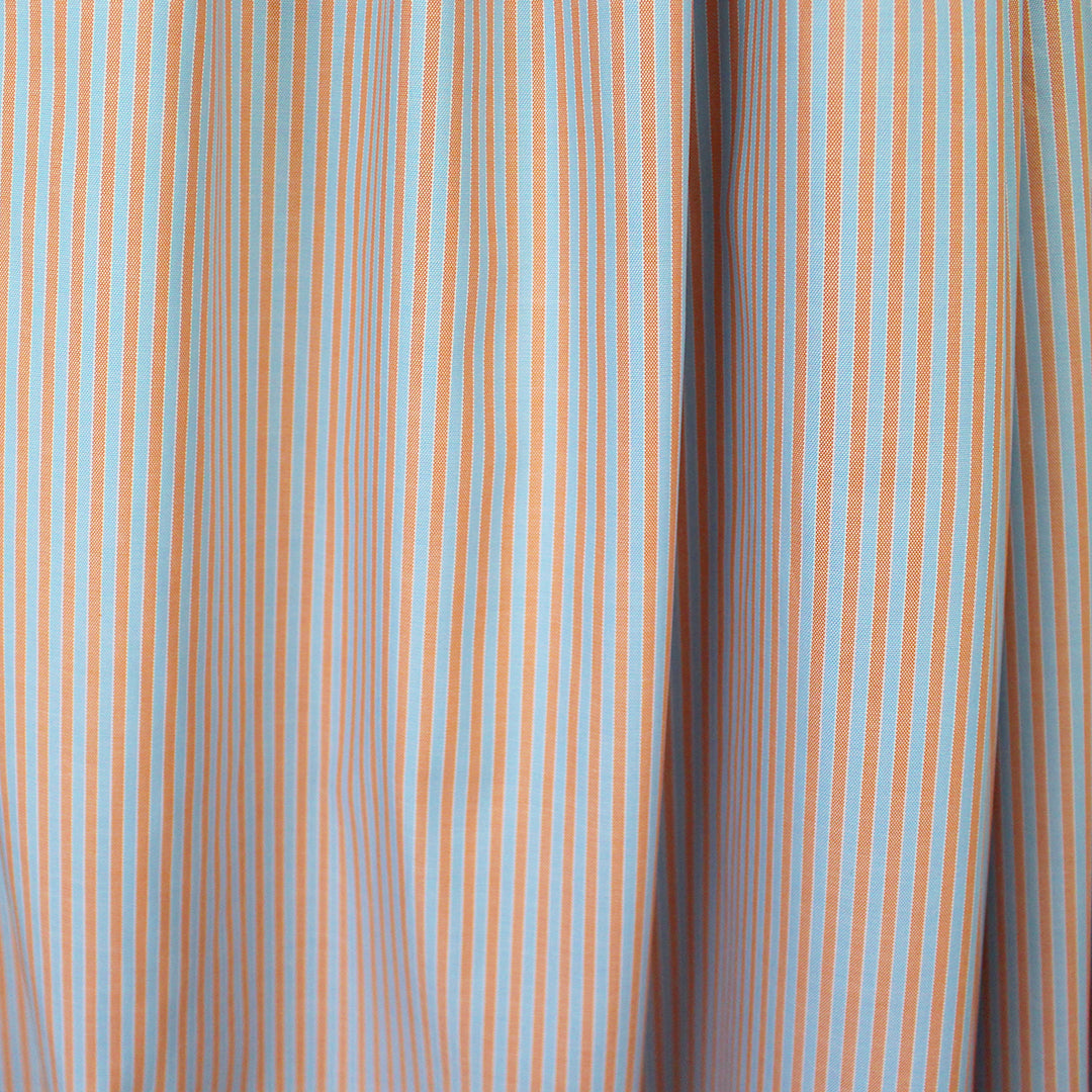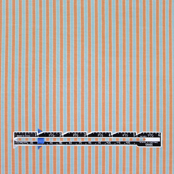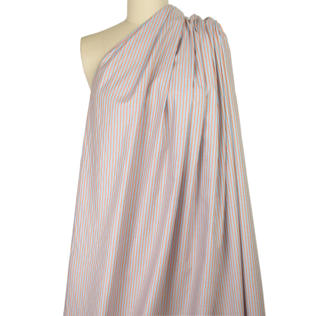 This is an excellent quality yarn-dyed vertical stripe cotton shirting (.75" horizontal repeat) in sky blue and shell coral, softened by a white weft (PANTONE 15-1334, 15-4323, etc.). It is a classic shirting weight, nearly opaque with a tight weave and a cottony-crisp drape, making it perfect for shirting, a shirt dress, tunic, etc. It is stable in both directions, so you may orient your stripes either way. If you wish to hand or machine wash, please test first. Hang to dry. 1.5 yds.