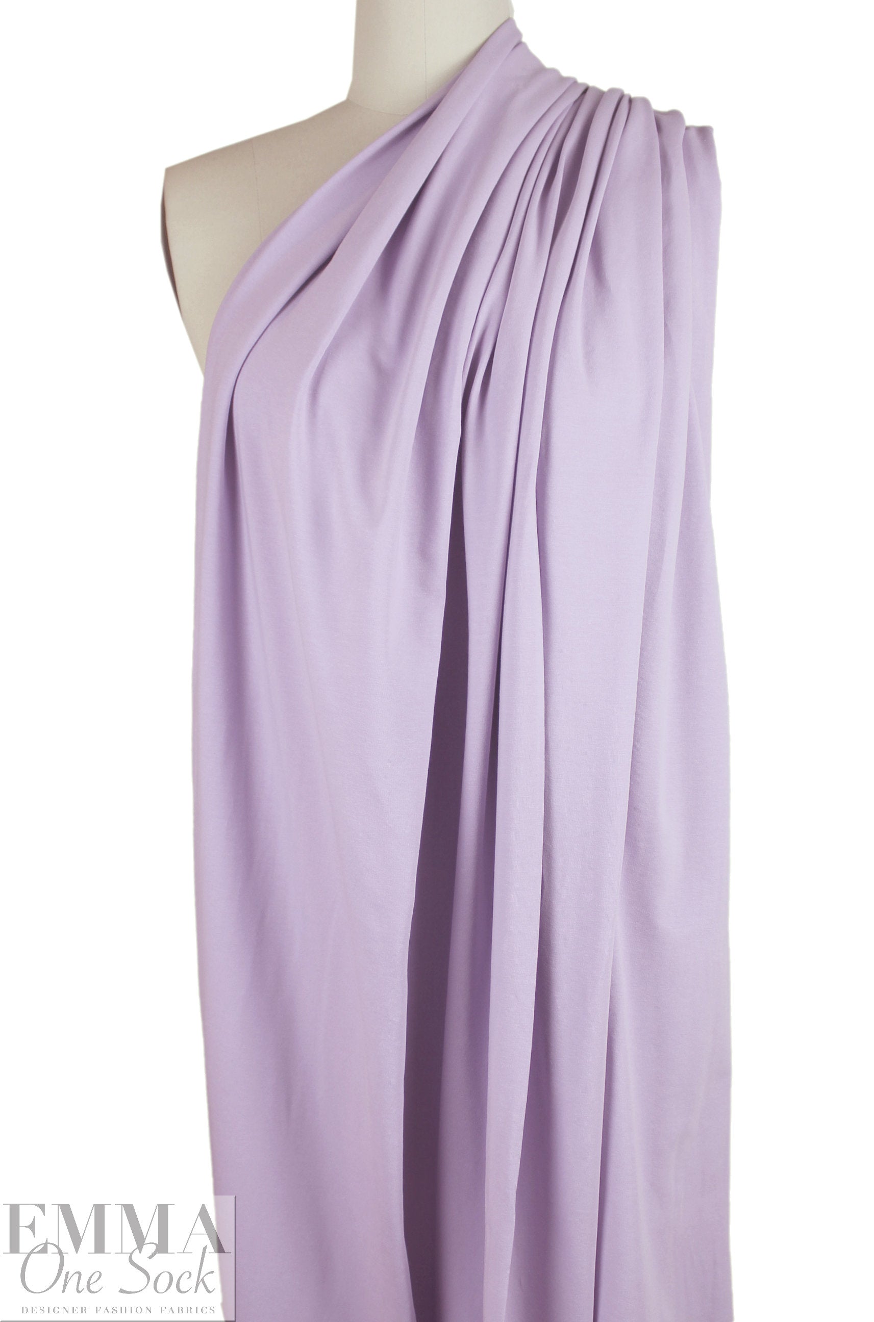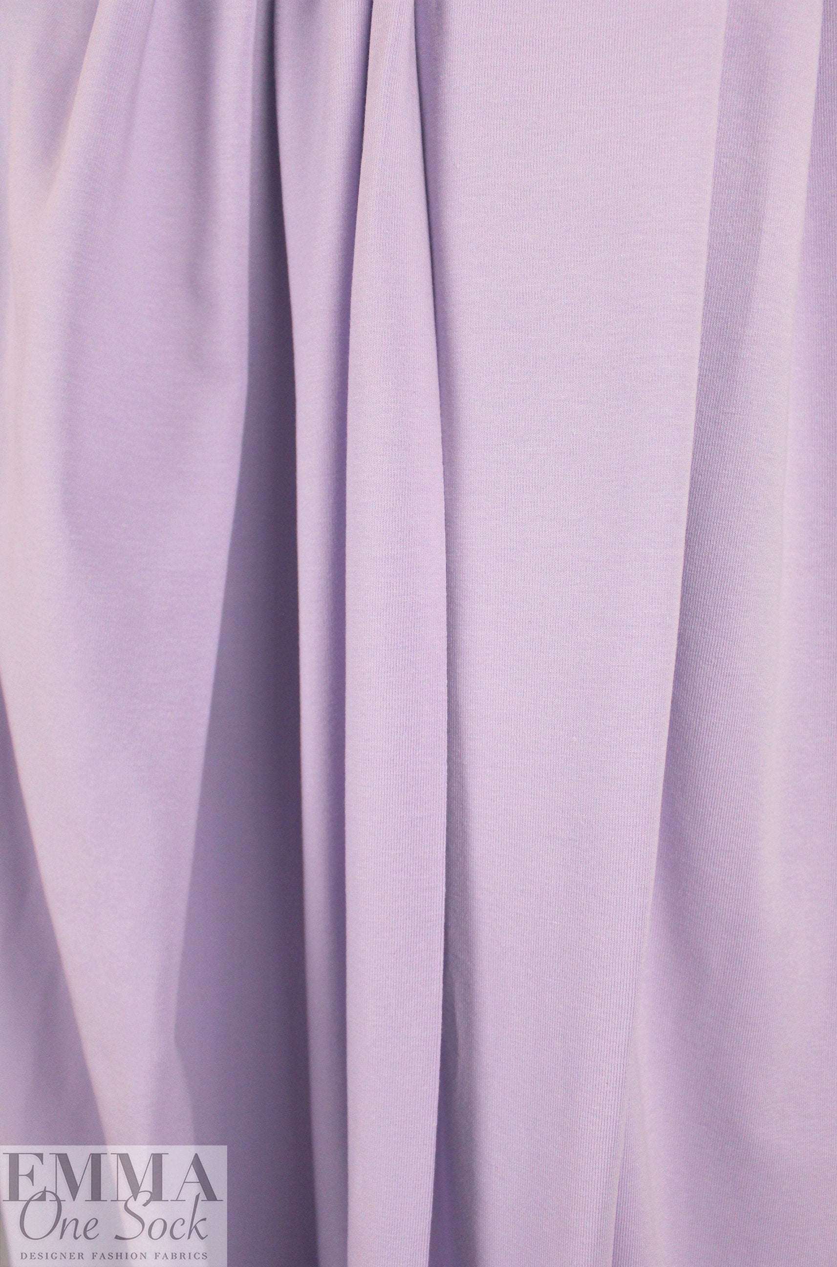 Here is the same quality cotton knit as our wonderful Dutch cotton knit prints in a solid color, imported from The Netherlands! The quality of the fabric is sublime, soft and substantial, with about 50% stretch in both directions. It is opaque and has a luscious hand and drape with body. The color of this one is a lavender tone (PANTONE 14-3812 but a shade lighter). Make a fabulous tee, top, tunic, skirt, dress, tights, etc. The manufacturer recommends hand or machine wash warm, hang to dry. Please test first. Oeko-Tex certified for non-toxic chemicals and dyes. 1.125 yds.