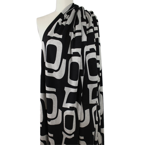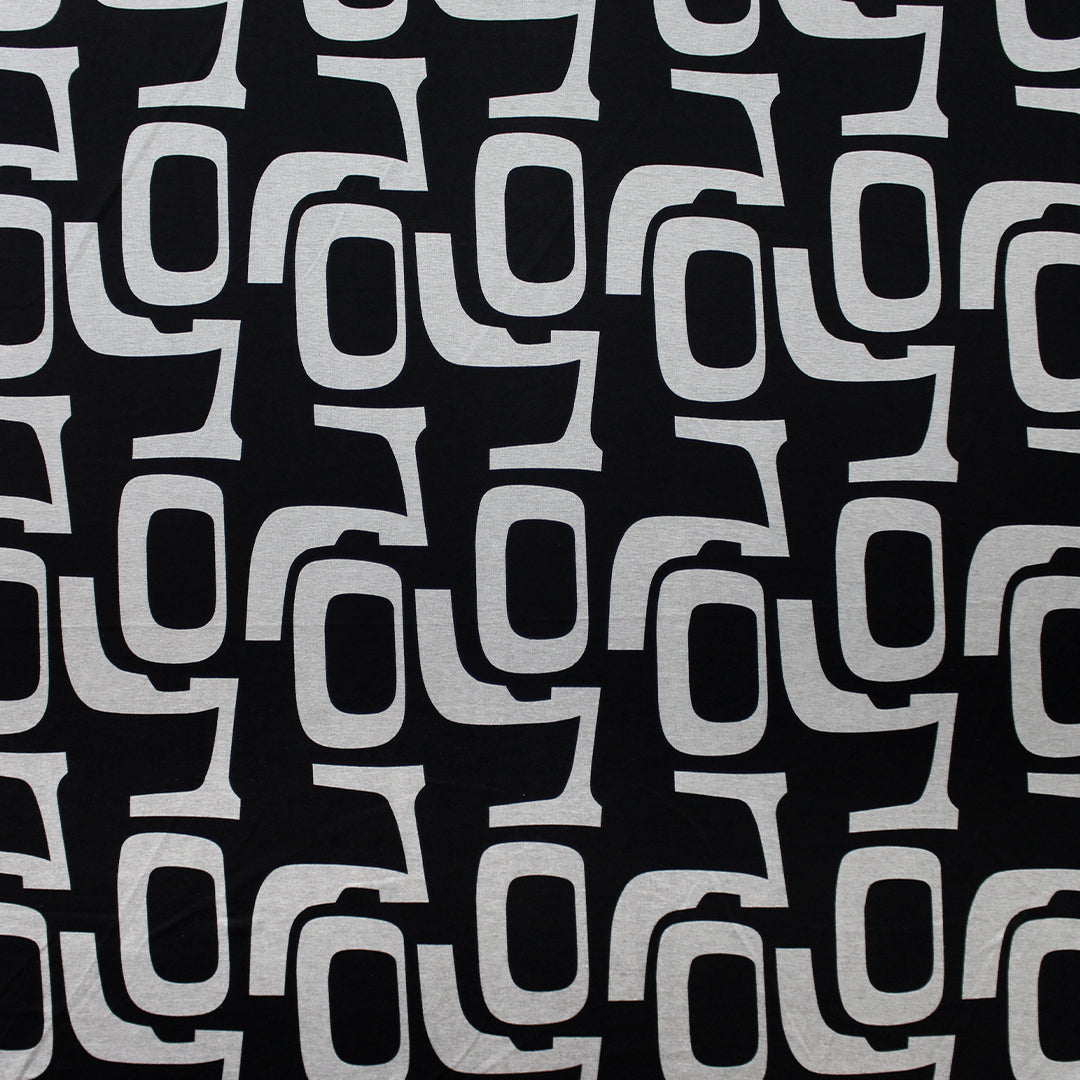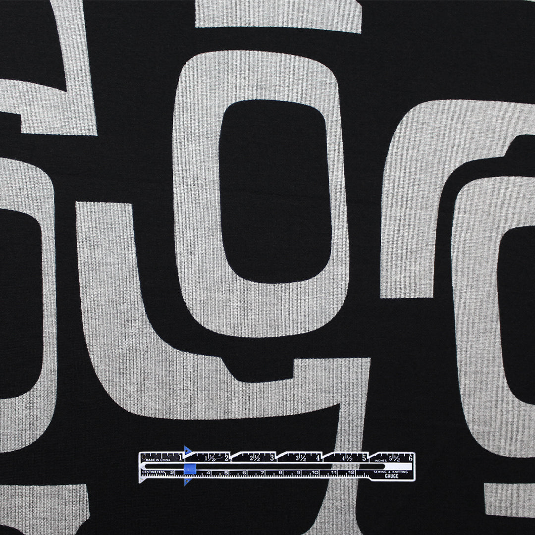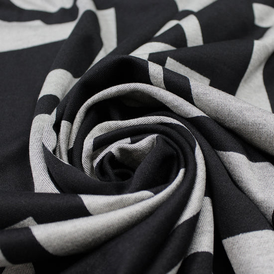 This is a wonderful light-medium weight super soft poly/rayon doubleknit with about 30% stretch in the width only. It has a flat, plain knit stitch on both sides and it's opaque with a sweatery texture and a soft drape. The "character development" design (12.5" vertical repeat) is printed in jet black on a yarn-dyed mottled warm gray base (PANTONE 15-0000 is close, etc.) while the back side is a solid black. It is perfect for tees, tops tunics, dress, luxury leisurewear, skirt, cardigan, etc. Hand wash and hang to dry, iron on low.