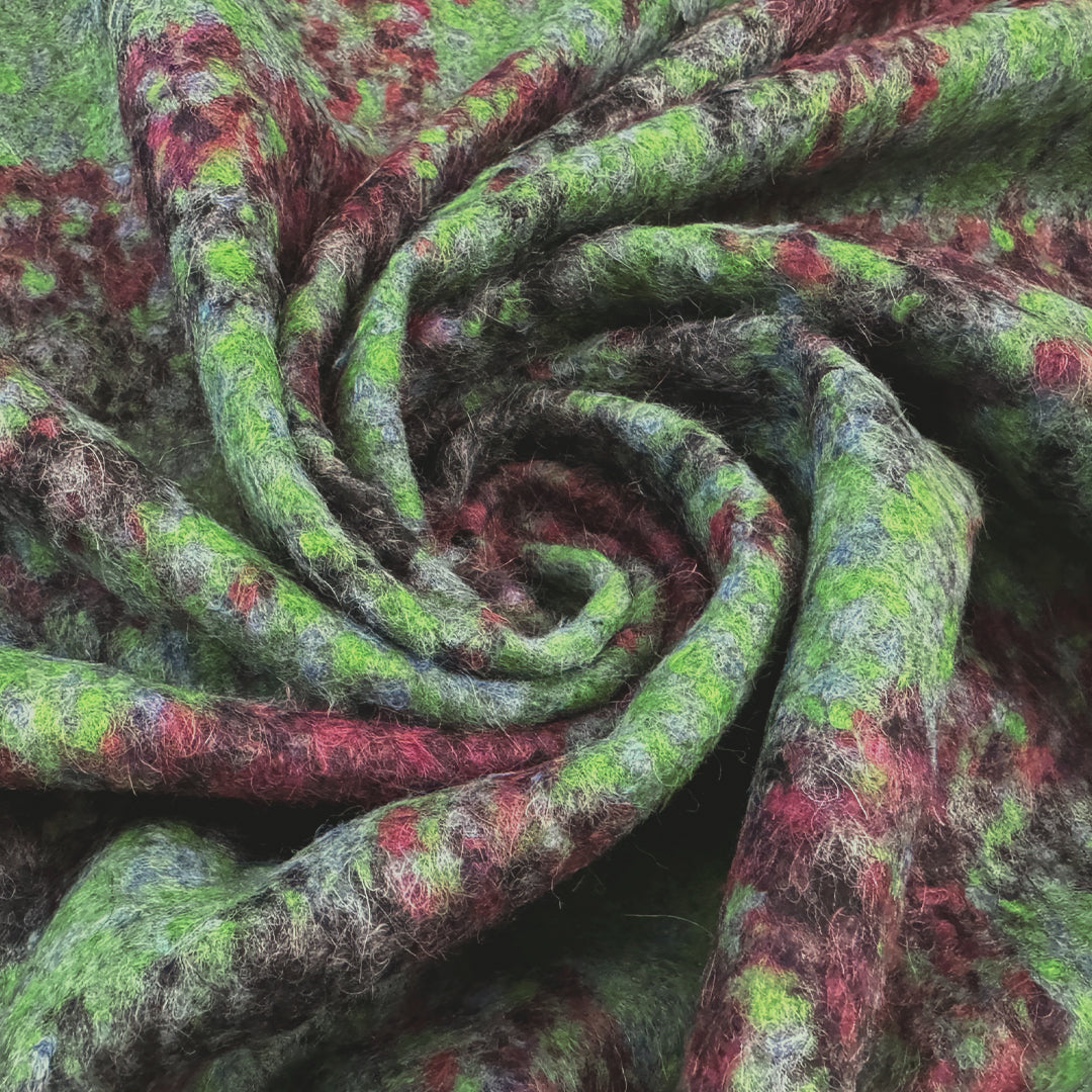From Italian designer deadstock, this is a stunning wool/viscose woven in a medium coating weight. It is a cozy and soft brushed tweed, stable in both directions with body in the drape. It has an obscured plaid look with a 7.5" repeat featuring wasabi, deep berry, charcoal gray, black, smokey blue, etc. (PANTONE 18-1619, 17-0235, 17-3917, etc.). The reverse is also beautiful, with a flatter weave that combines thin and thick yarns. Wonderful quality, beautiful coloring, and it would make a sophisticated and eye-catching Chane1-style or Ba1enciaga-style coat, winter coat or jacket, etc. Dry clean only.