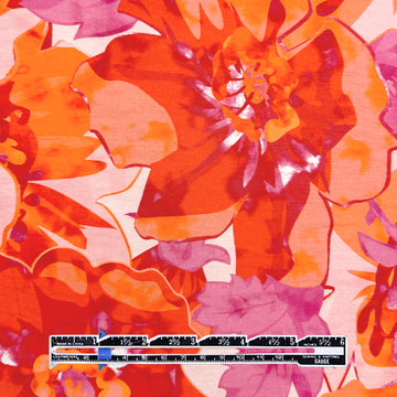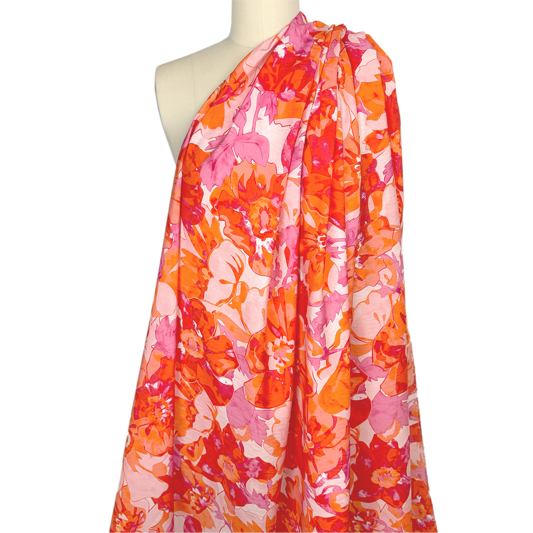 This is a fine quality viscose blend blouseweight, a printed woven that is lightweight and nearly opaque with a touch of body in the drape and smooth hand. The small bit of nylon provides some strength and structure, and the "brilliant floral" design (30" repeat) features blood orange, daylily, orchid, crimson, whisper pink, etc. (PANTONE 16-1451, 17-2520, 12-1706, 18-1662, etc.). It is perfect for blouses, tunics, tops, dresses, skirts, etc! Hand wash, and hang to dry. Please test first if you wish to try machine washing.