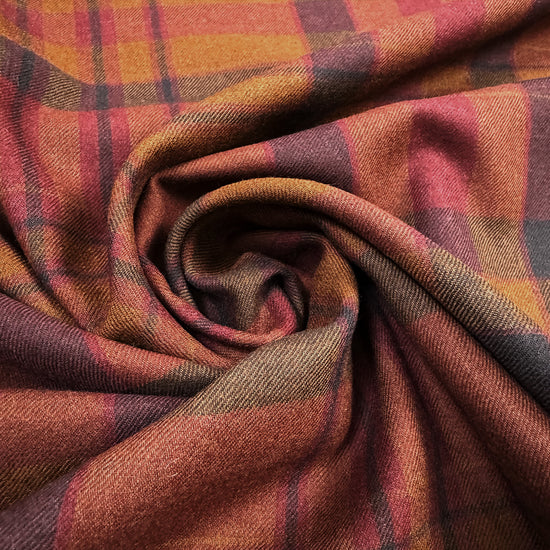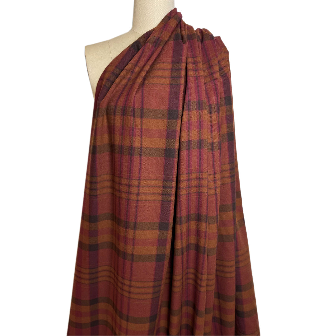 From Italian designer deadstock, this is gorgeous all-wool dress weight woven, a medium-light weight that is opaque with a soft drape that has a bit of body. The twill weave runs through the yarn dyed plaid design (11.25" repeat), which features cinnamon, sangria, dark sap green and a near-black slate brown color (PANTONE 19-1314, 17-1044, 19-1650 ish, 18-0928, etc.). Beautiful, classic coloring and exceptional quality. A versatile weight that is perfect for a winter shirt, dress, skirt, slacks, etc. Dry clean, or hand wash with mild soap and hang or lay flat to dry.