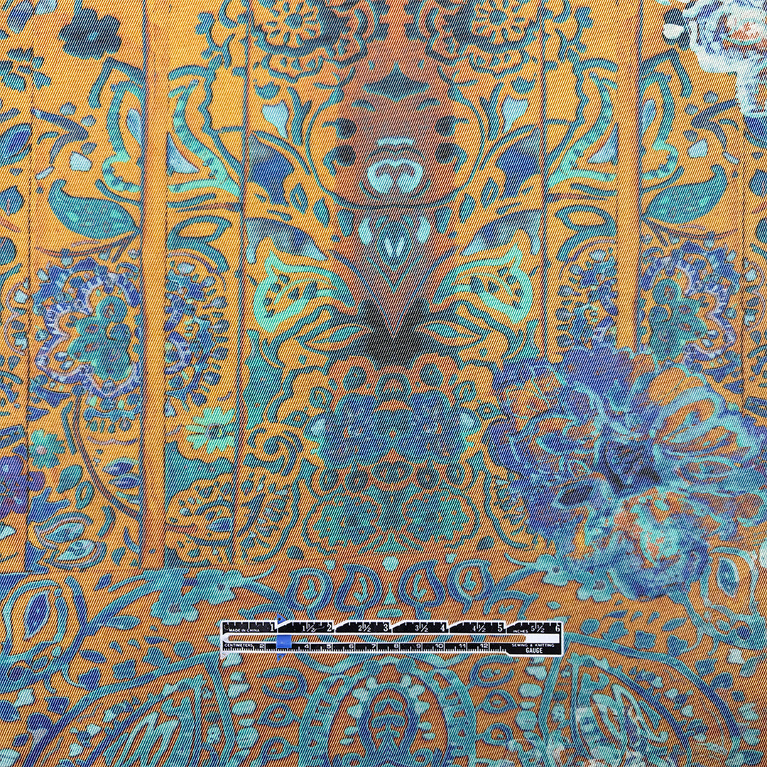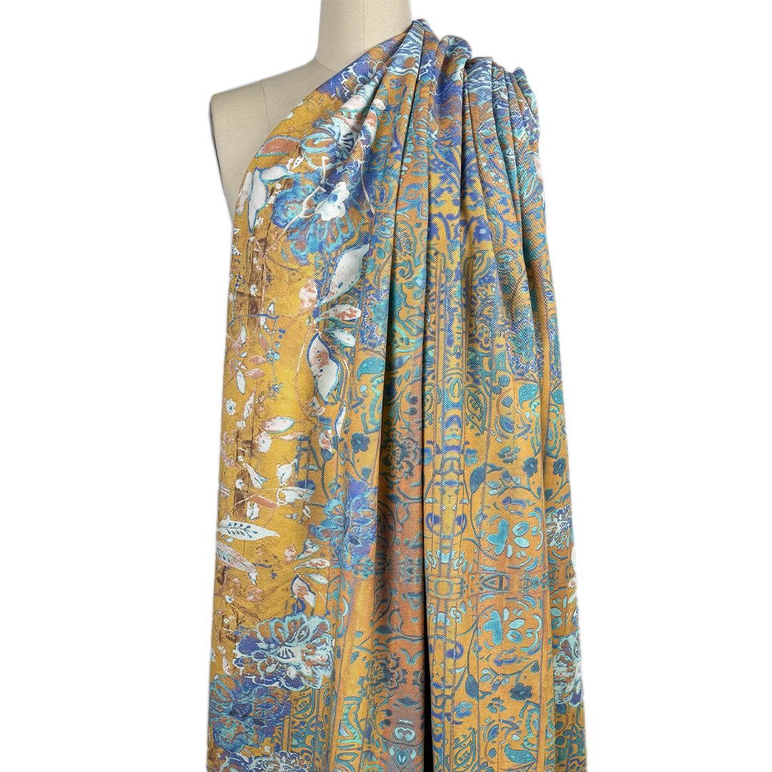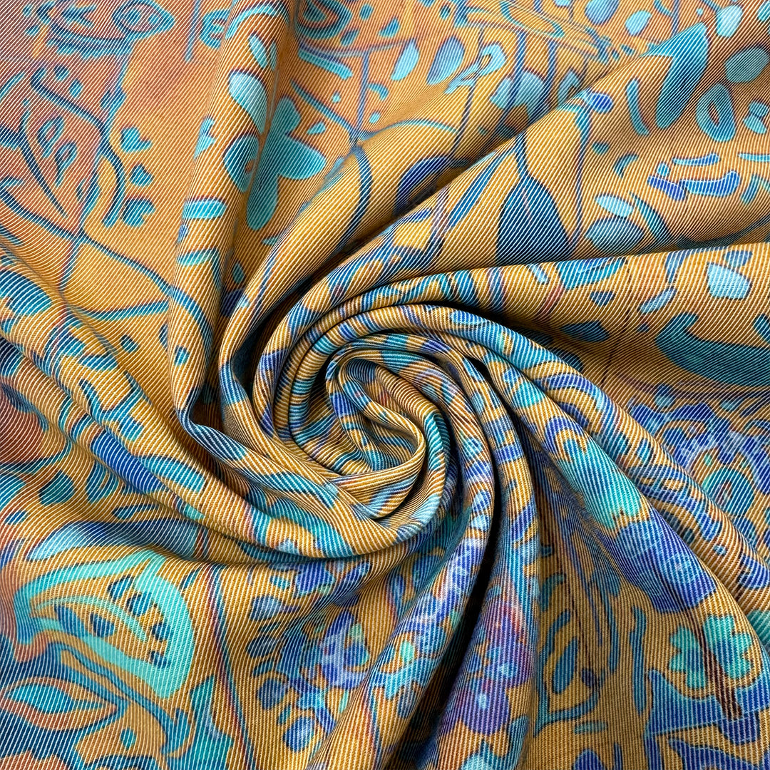 This is a spectacular printed stretch twill (10% stretch in the width only) with a beautiful "caramel garden" print (53" repeat) in a range of colors including caramel, mauve rose, violet, light jade, soft turquoise, tinted white, etc. (PANTONE 18-1421, 15-1049, 17-3924, 13-5714). Medium weight, soft and malleable (feels pre-washed), with a twill weave and a cottony drape. Perfect for jeans, denim-style jacket, fitted dress, capris, skirt, topper coat, etc. Machine wash cool, hang to dry (please test first), or dry clean.