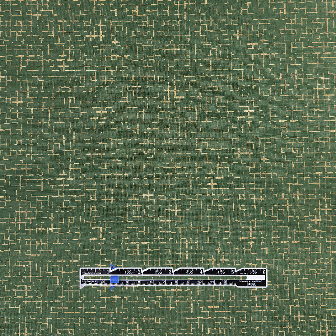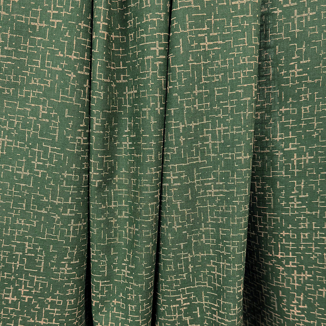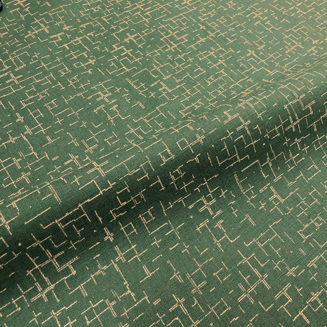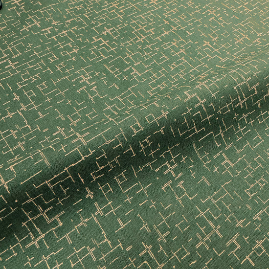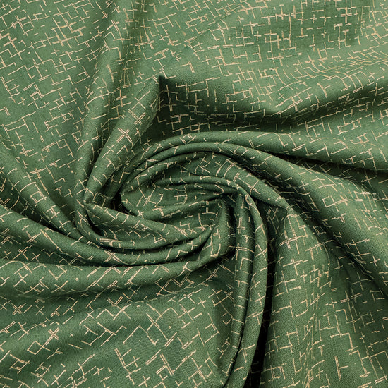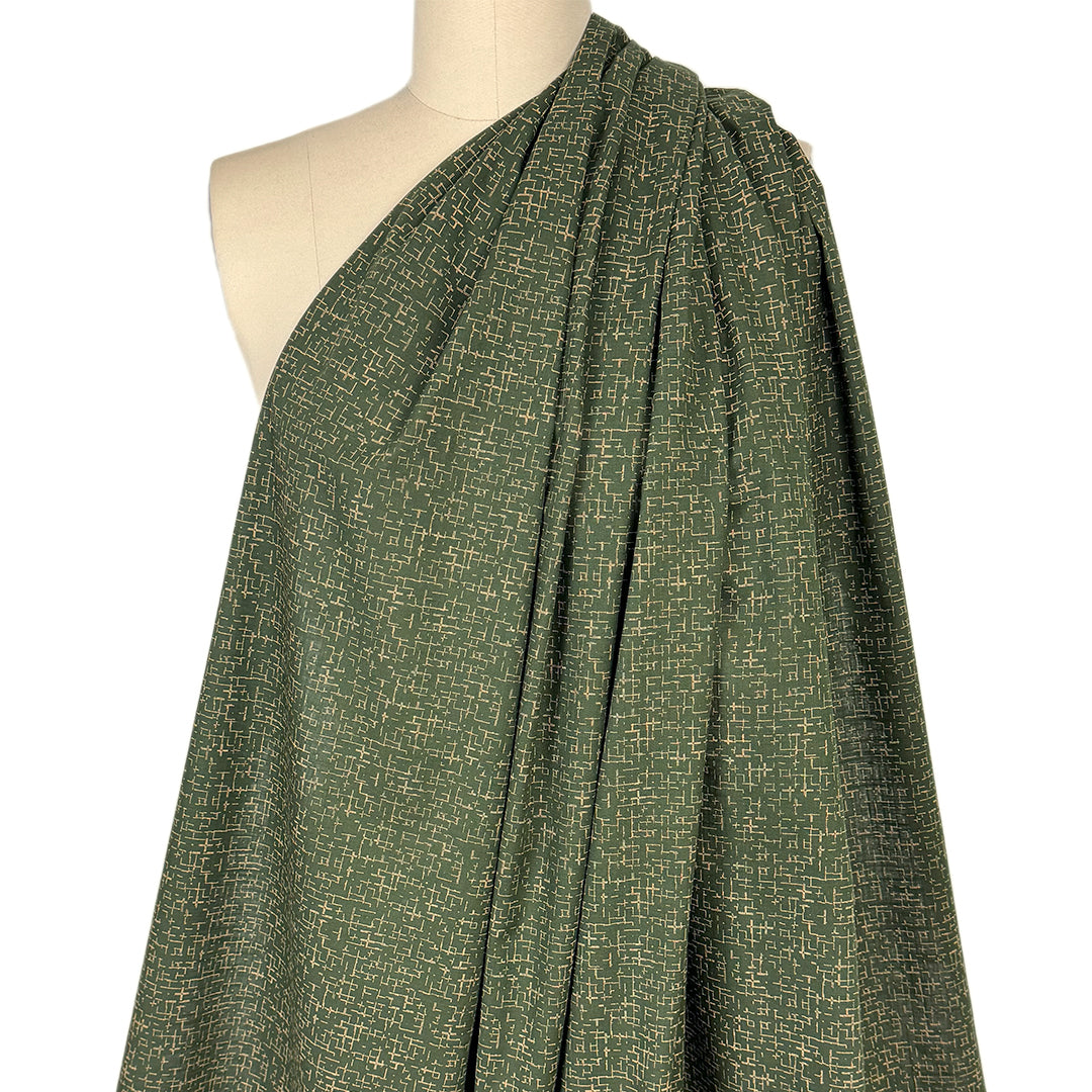 This is a lovely cotton woven shirting, lightweight and nearly opaque with a bit of cottony crispness in the drape. The small-scale "tiny hatch" print (4" repeat) features a pattern of lines in wheat on a cypress green background (PANTONE 13-1016, 18-0322). It is stable in both directions and the reverse is solid cypress green, which could be used for contrast. Perfect for a shirt, top, tunic, dress, skirt, pajamas, etc. Some styles may need lining. Hand or machine wash, hang to dry or tumble low (please test first).
