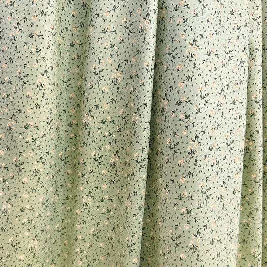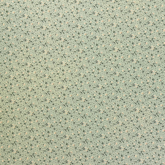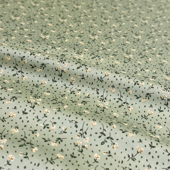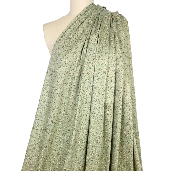 This is a lovely quality cotton woven, a shirting weight that is opaque with a cottony drape and a lovely, very subtle sheen. The small-scale "petite floral" print (3.5" repeat) features parchment, cocoa and dark sap green on a sage green background (PANTONE 15-6310, 13-1011, 16-1334, 18-0317, etc.). It is stable in both directions and is perfect for a shirt, top, tunic, dress, skirt, pajamas, etc. Some styles may need lining. Hand or machine wash, hang to dry or tumble low (please test first). LAST PIECE, 1.25 yds.