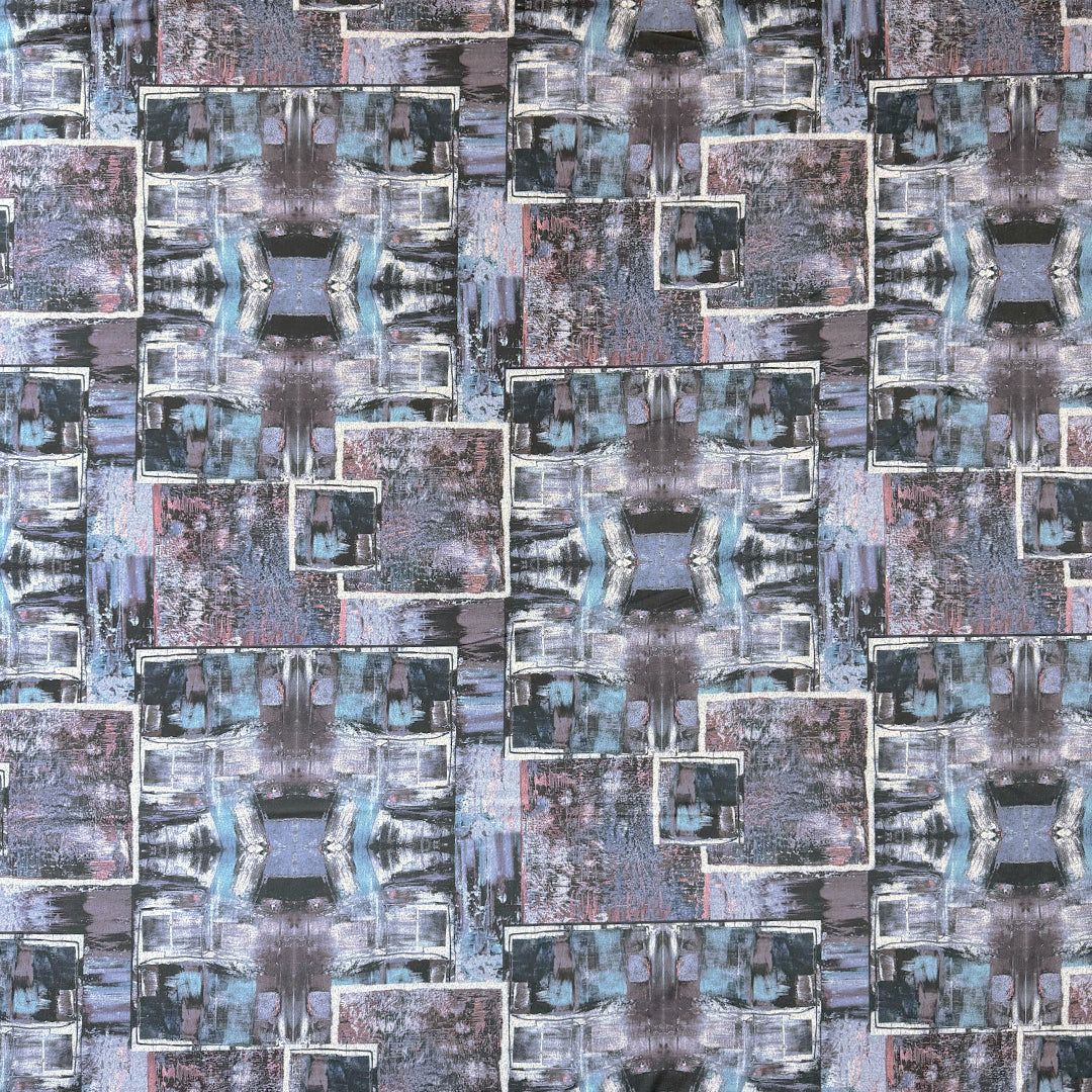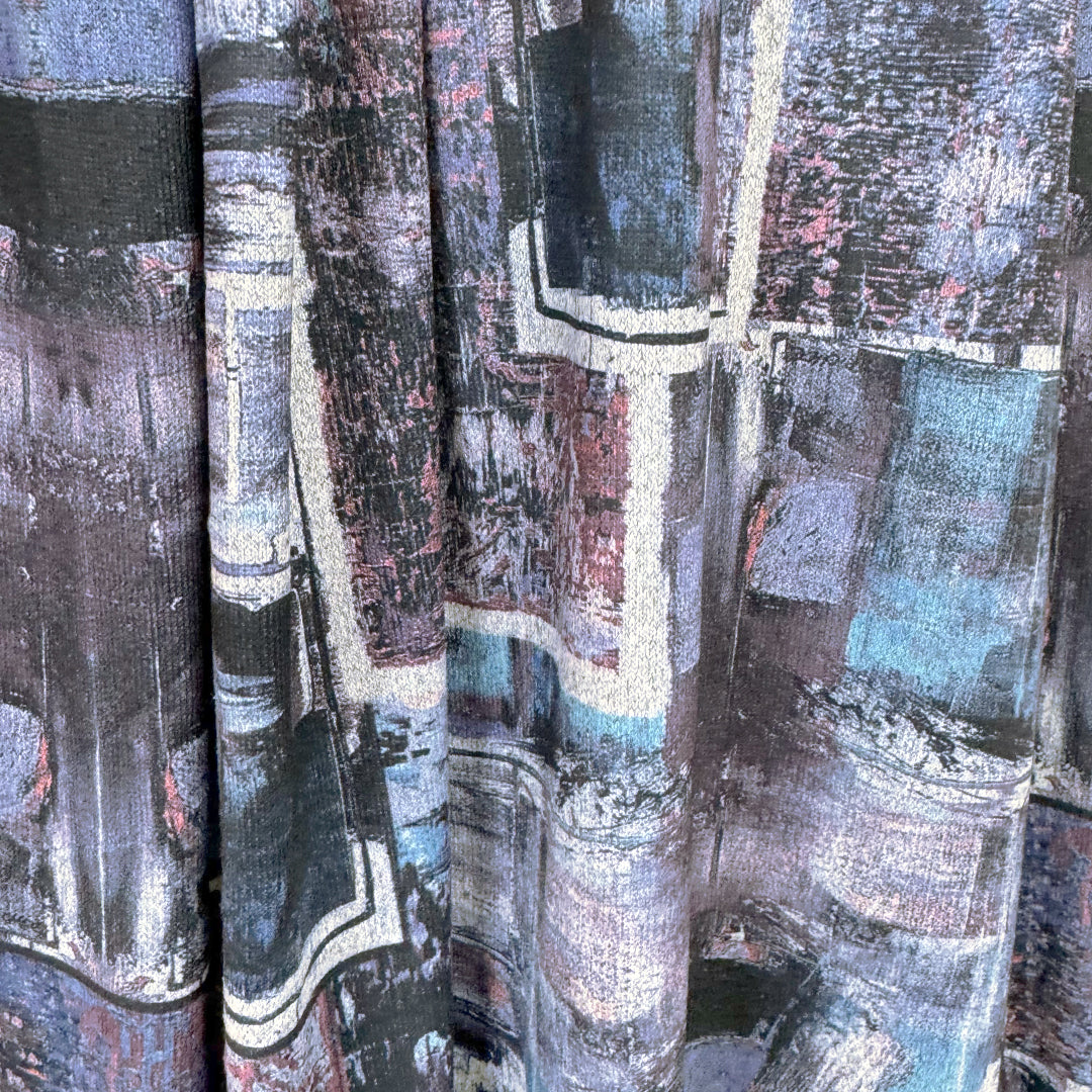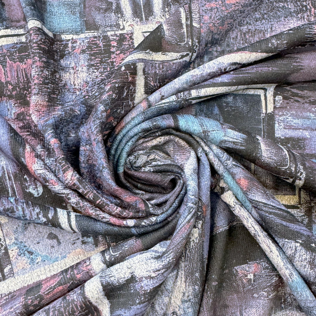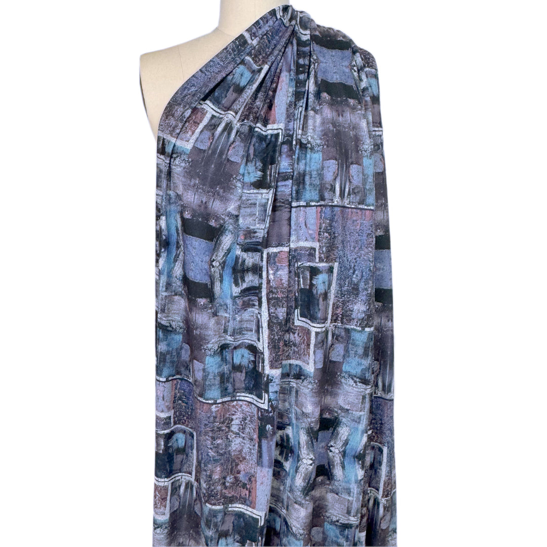 This is a lovely printed medium-light weight sweater knit, opaque and drapey with 30% widthwise and 20% lengthwise stretch. It has a very soft and sweatery hand with a plain knit stitch. The beautiful "memento" design (24" repeat) features an intriguing abstract scene in dusky lavender, sky blue, dusky ultramarine, black, dusty rose, etc. (PANTONE 15-1611 ish, 17-2601, 11-4301, 18-0937, 17-1524, etc.) and is printed on a heathered white and gray base. It is perfect for drapey tops, tunics, cardigans, sweater dress, etc. The manufacturer recommends hand wash in cool water, lay flat or hang to dry.