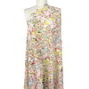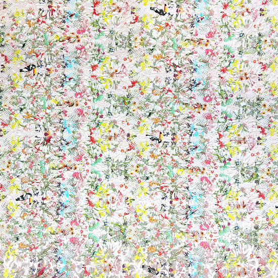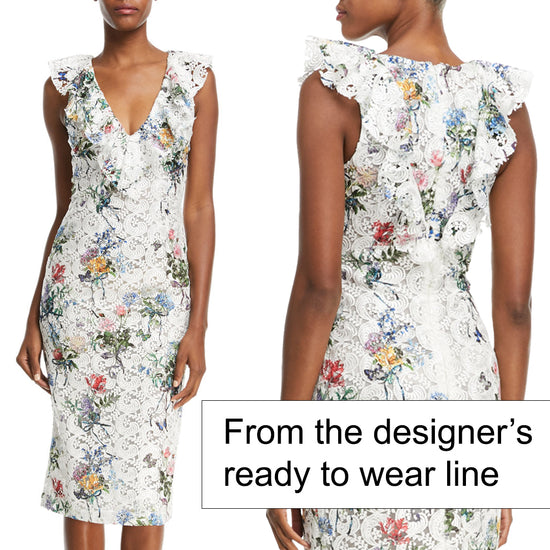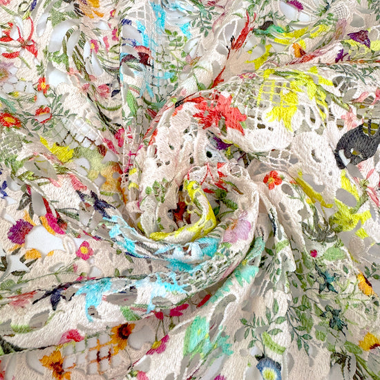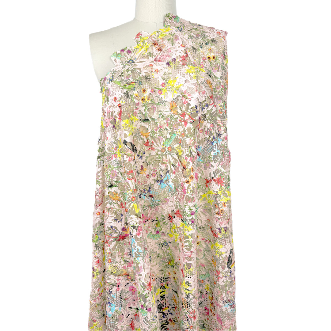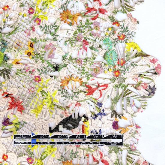 From the famous LA-based design house, this over-printed guipure lace is vibrant, elegant and feminine. The base fabric is a medium weight white lace which is woven into a pretty flower pattern. The over-printed 'floral paradise' design (6" vertical repeat, 18.5" horizontal) has a tropical motif featuring flowers and birds in lemon yellow, flamingo pink, coral red, sunny orange, Caribbean blue, deep purple, leaf green, etc. on a rosy ivory background (PANTONE 14-4816, 15-6432, 12-0643, 11-1404, 17-1658, etc.). It has a cottony drape with some body and no stretch, and is semi-transparent due to the open weave (we photographed this on a white background). It has beautiful, scalloped selvages on both sides, providing many design possibilities at the hem, sleeves and neckline. Perfect for a tunic, scallop-edged separates, skirt, sheath dress, special occasion gown, etc. Some styles may need lining or layering. Dry cleaning recommended.