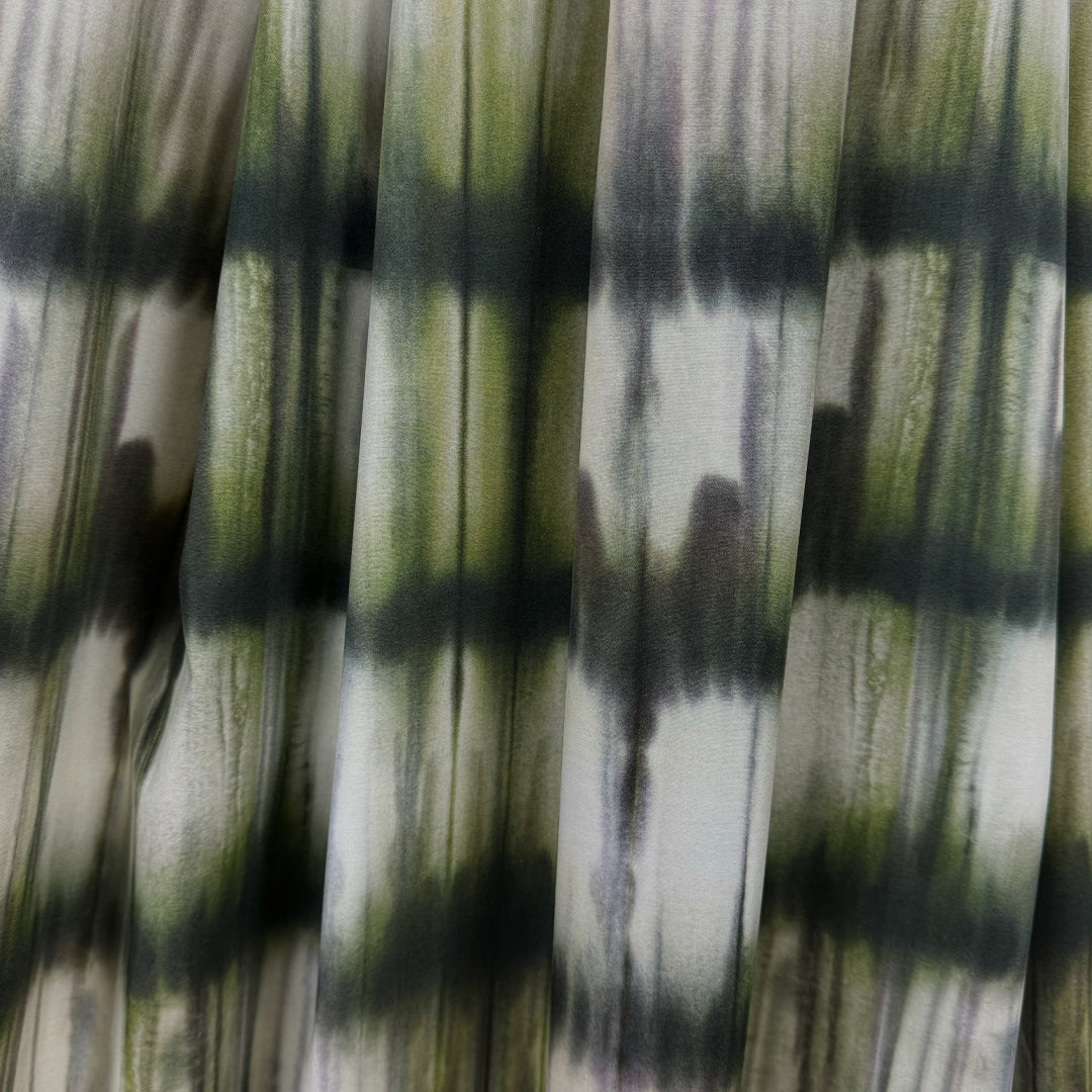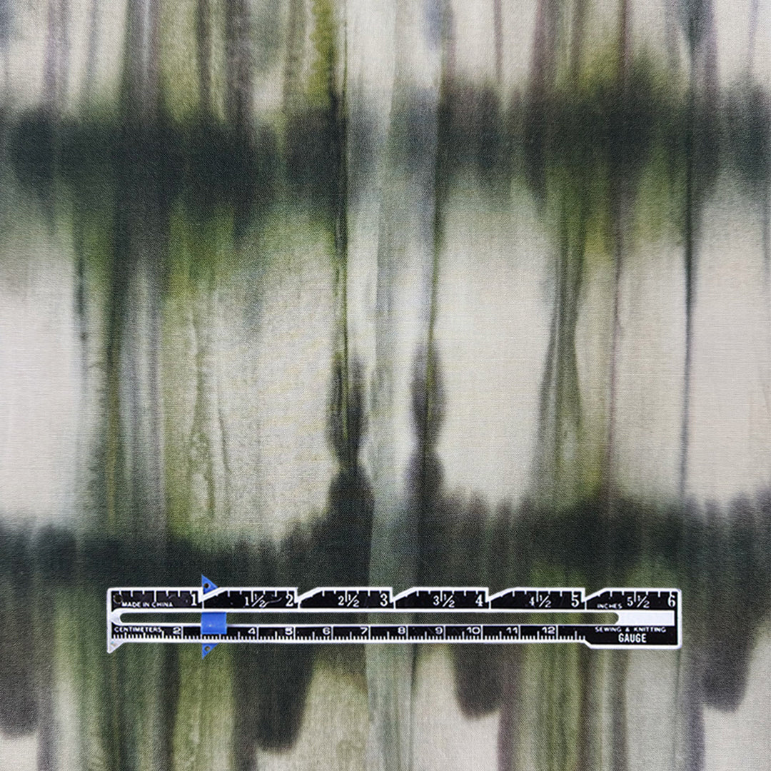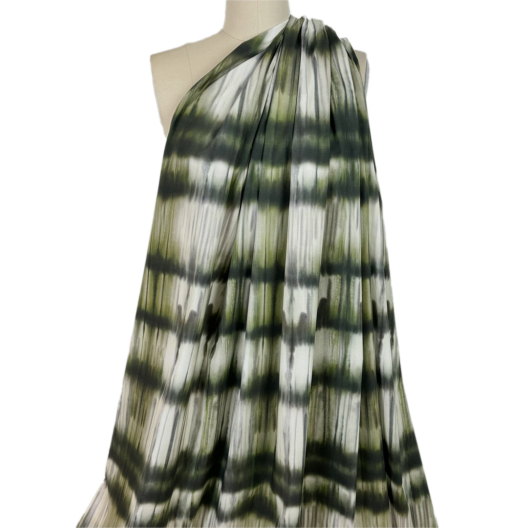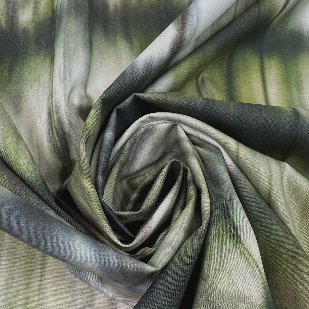 This is a lovely quality Italian cotton stretch woven, a shirting weight that is nearly opaque with a bit of cottony crispness in the soft drape and 15% stretch in the width only. The 'grasshopper' print (24" repeat) resembles shibori-style tie dye in shades of grass, olive, whisper lime, dark loden, etc. (PANTONE 12-5201, 18-0332, 19-0618, etc.). Perfect for a shirt, top, tunic, dress, skirt, etc. Hand or machine wash, hang to dry or tumble low (please test first).