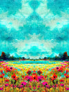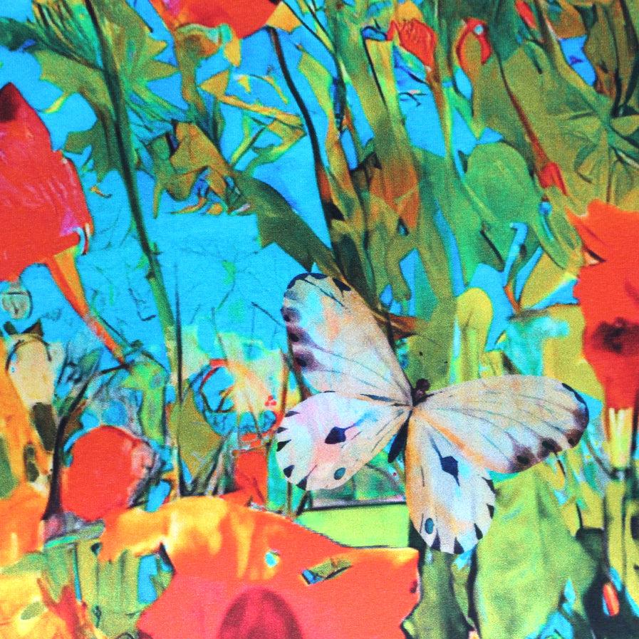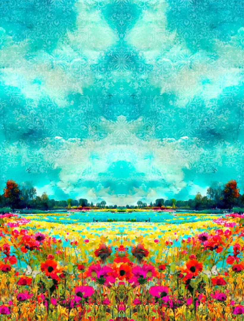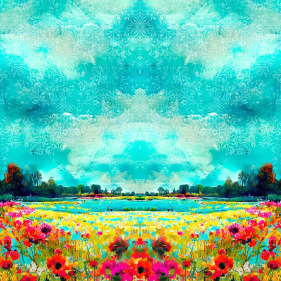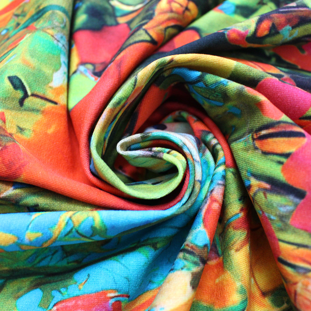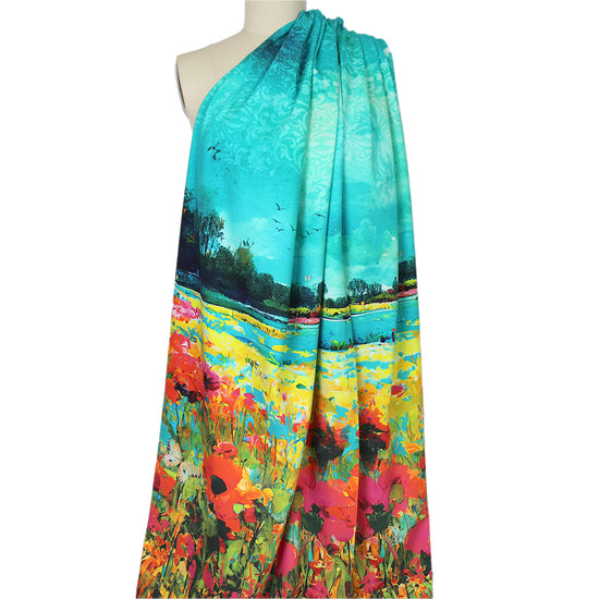 This wonderful cotton/spandex print is imported from The Netherlands, and the quality of the fabric is sublime. The digitally printed "sunrise vista" design has a 77" repeat, featuring shades of sky blue, turquoise, lemon, spring green, poppy, raspberry, etc. (PANTONE 16-5422, 16-4728, 14-0760, 17-1562, 15-0538, 17-2031, etc.). Soft and substantial, it has about 50% stretch in both directions, and is opaque with a bit of body in the drape. It is Oeko-Tex certified for non-toxic chemicals and dyes. Make a great tee, top, dress, tunic, dress or skirt, fun leggings, etc. The manufacturer recommends hand or machine wash warm, hang to dry. Please test first.