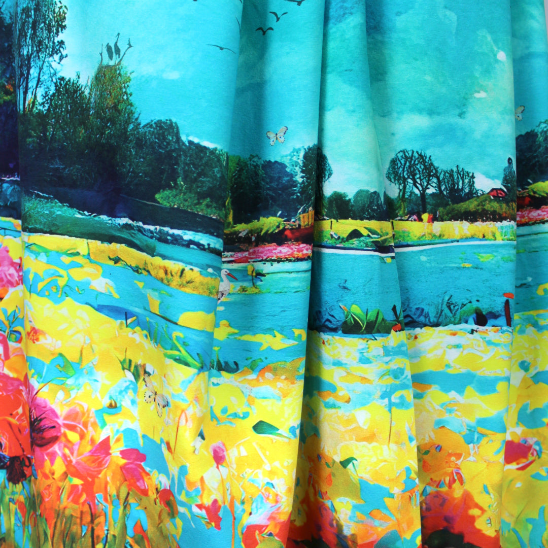 Dutch digital 'sunrise vista' cotton knit panel, Oeko-Tex