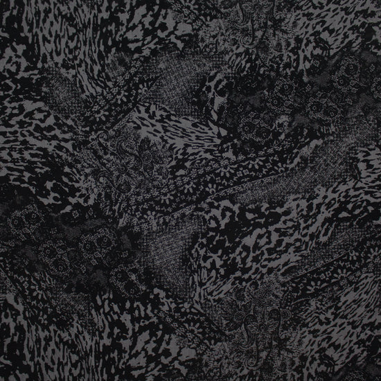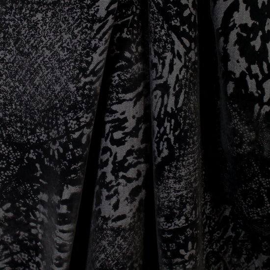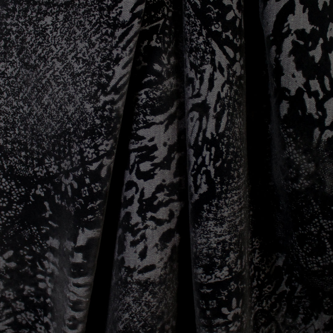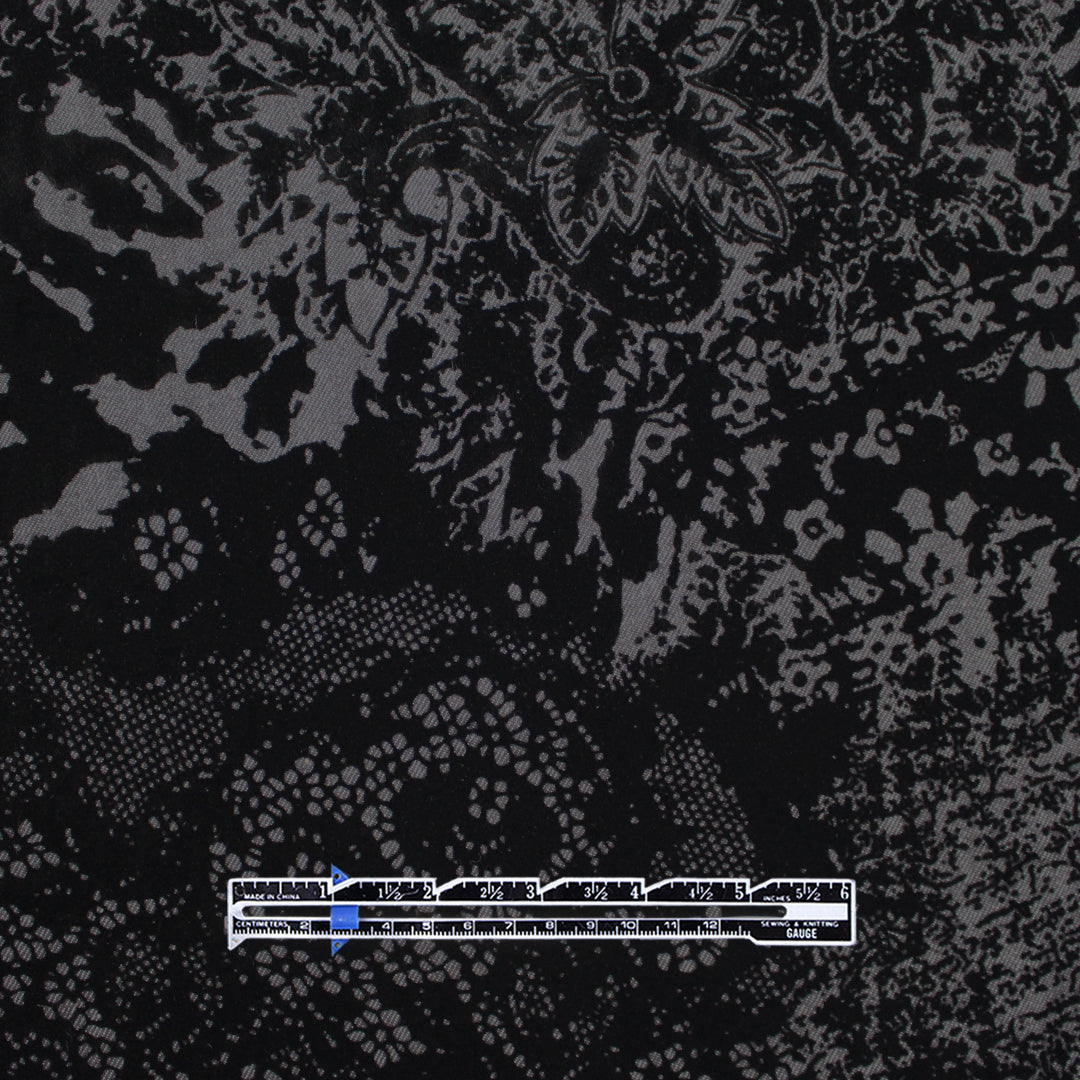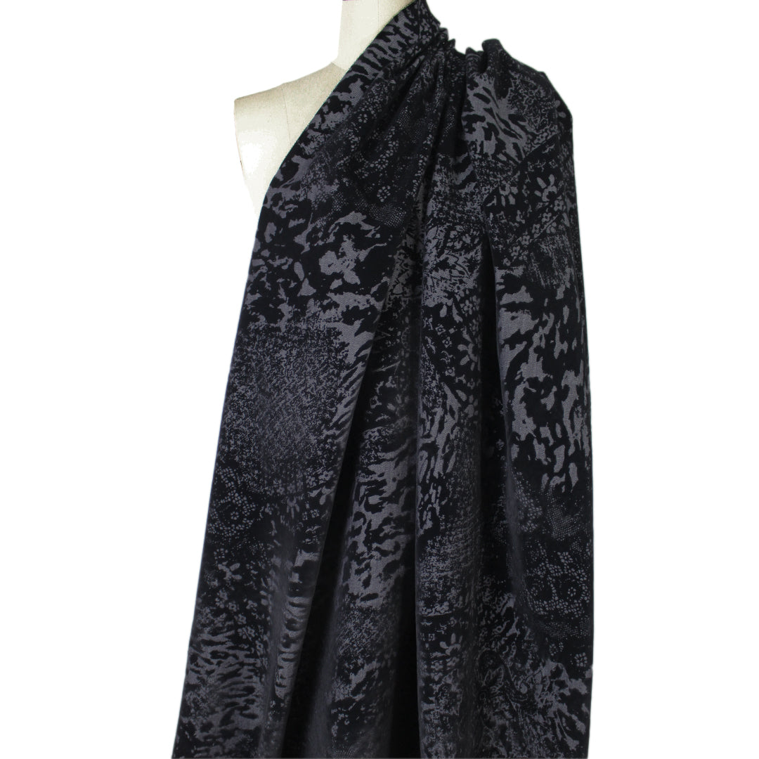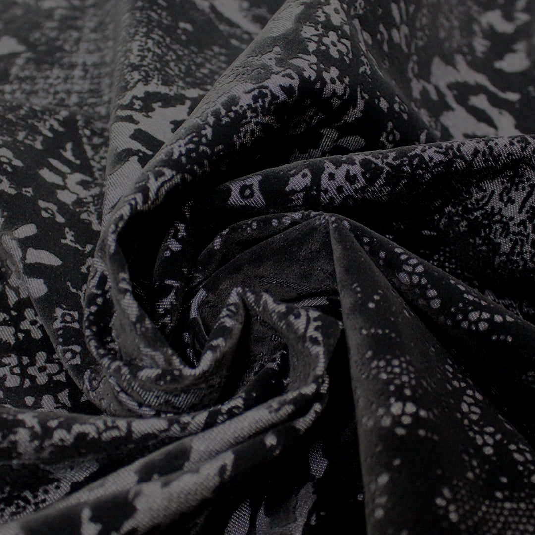 From Italian designer deadstock, this is an absolutely gorgeous flocked stretch cotton denim. The base fabric is a soft and smooth, mid-to-heavy weight dark indigo twill with white crossthreads (PANTONE 18-3905 is similar), and it has about 10% stretch in the width only. The flocked 'lacey floral' design (33" repeat), in a blue-black color, is dimensional with a lovely velveteen texture. This would make a fabulous jacket, coat, vest, jeans, etc. Dry cleaning recommended; test first if you wish to try machine washing.