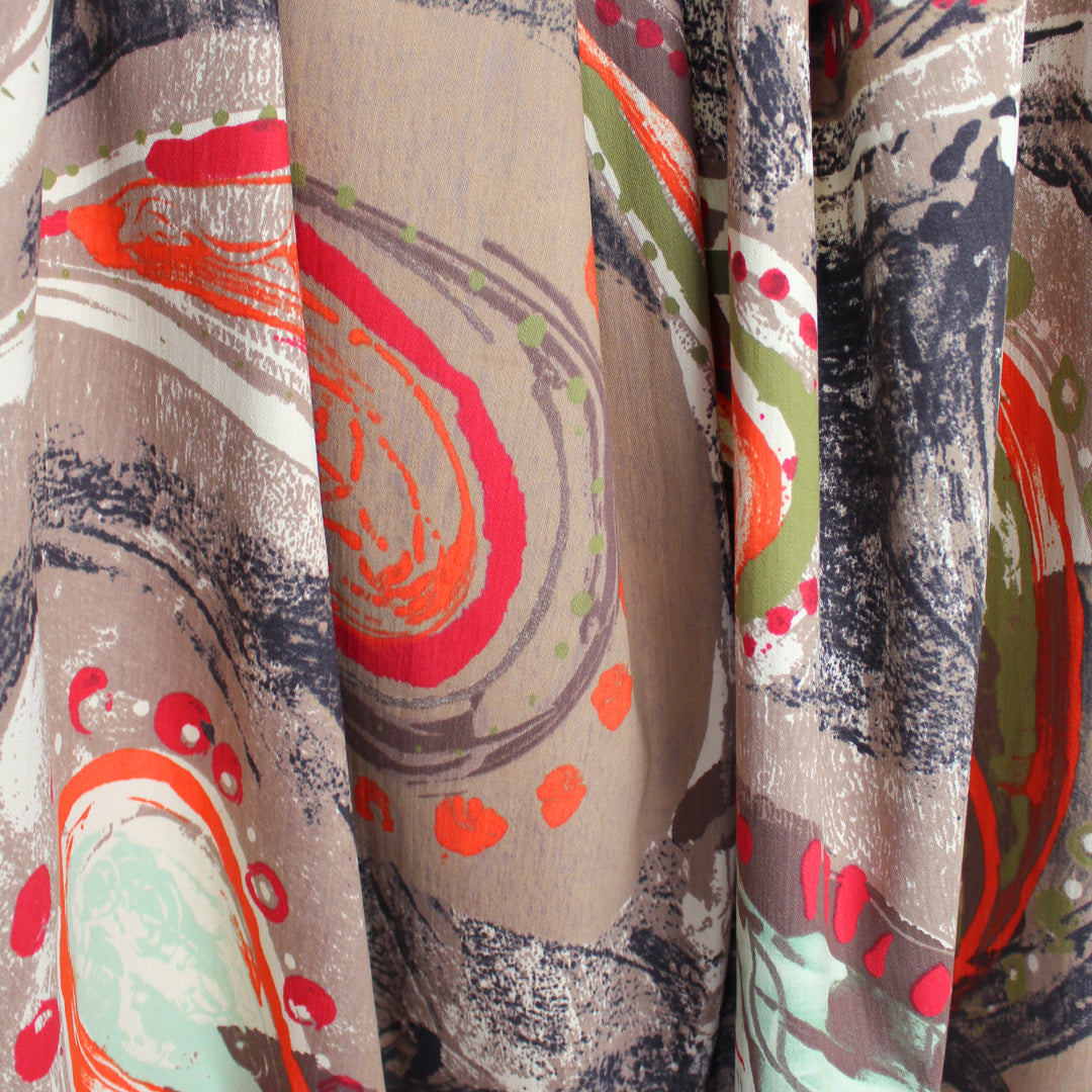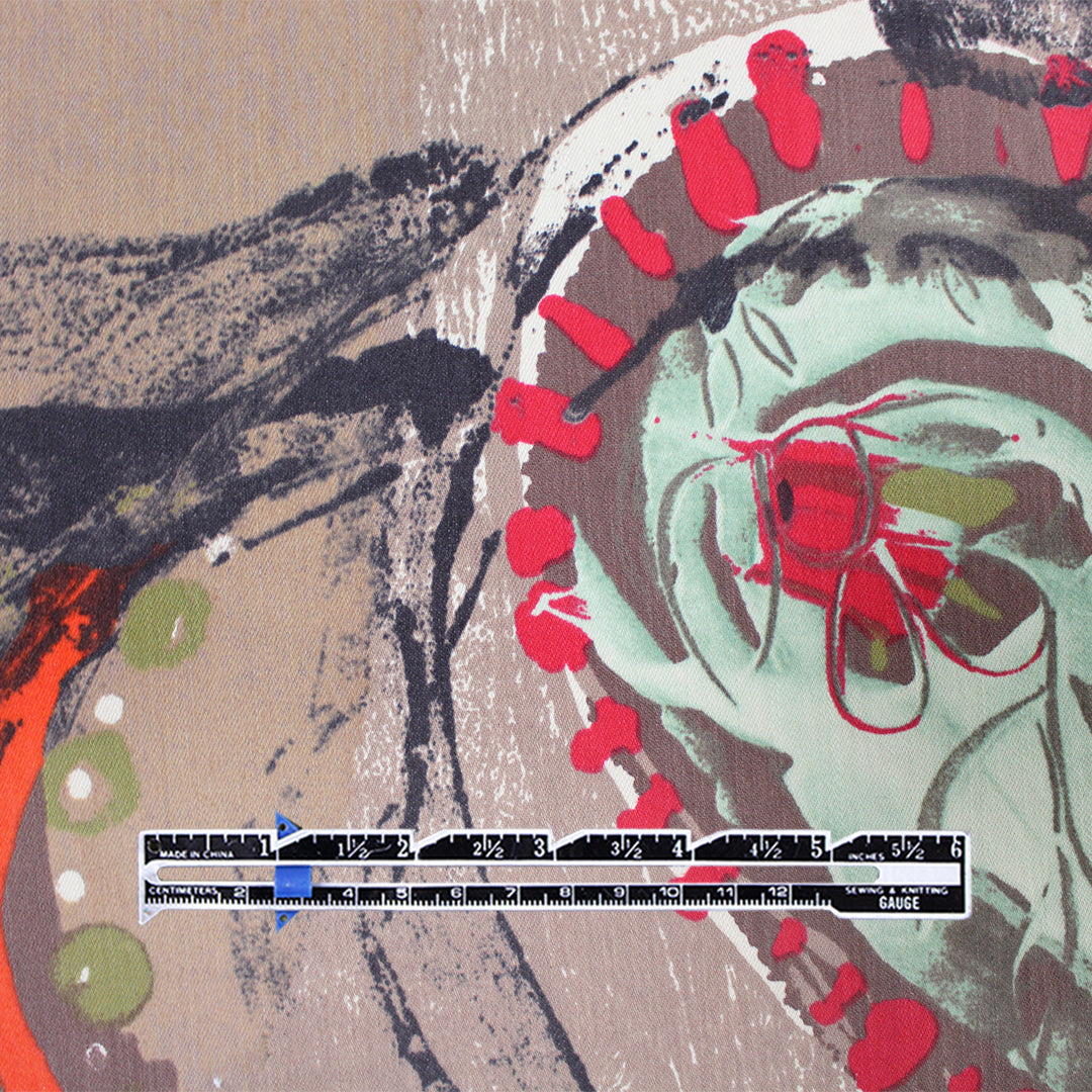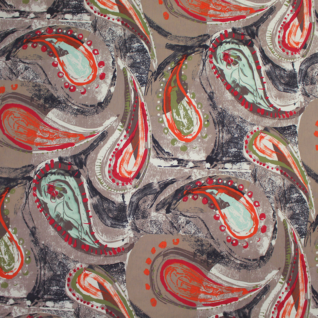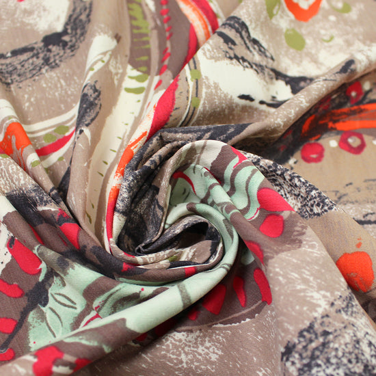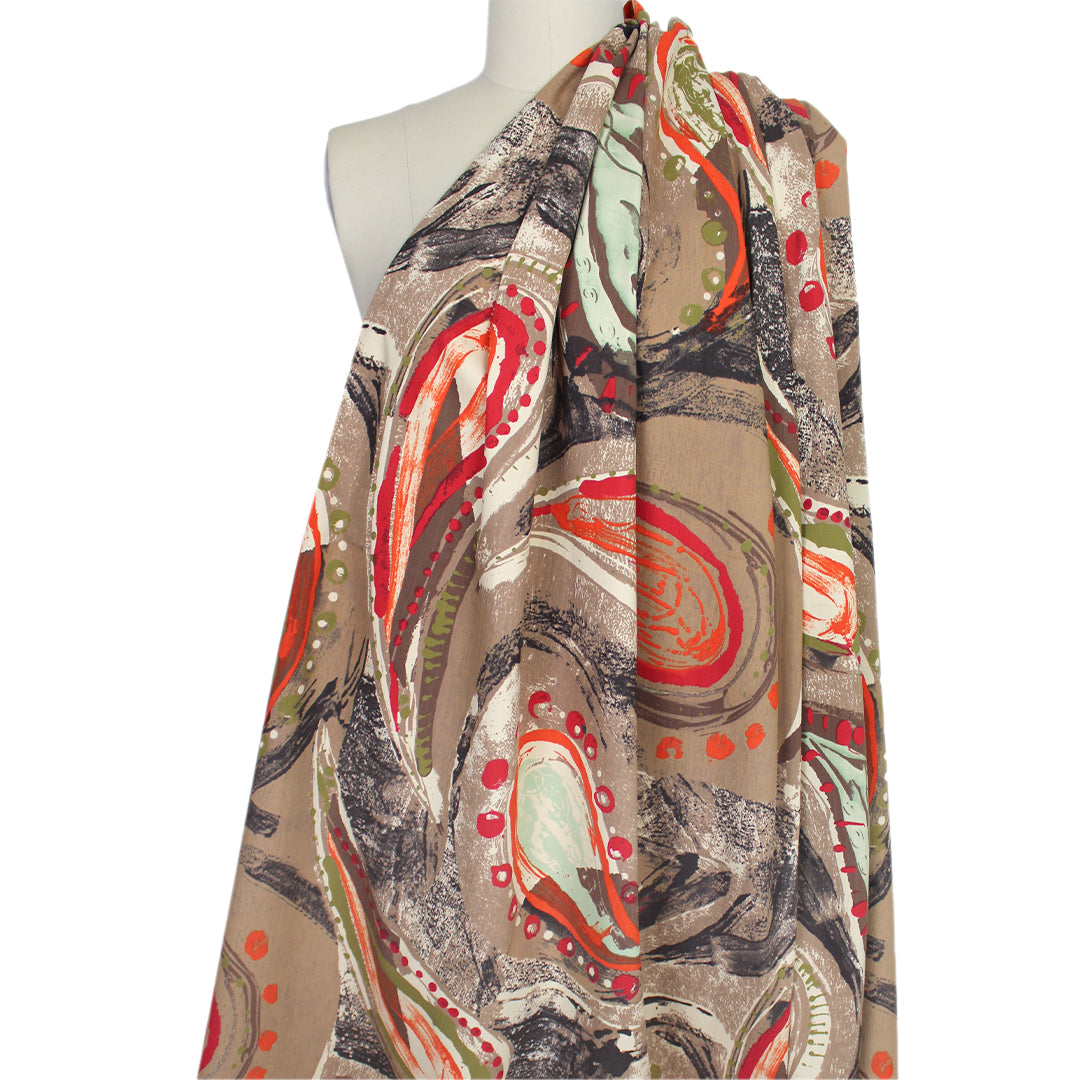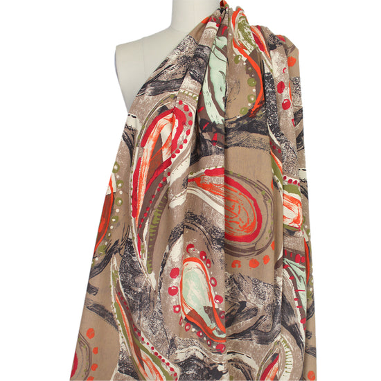 From Italian designer deadstock, this is a uniquely beautiful printed stretch denim, a lighter medium weight twill that is opaque with some cottony firmness in the drape and 15% stretch in the width only. The "marbled paisley" print (36" repeat) features shades of putty, mocha, French roast, celadon green, bright crimson, avocado, etc. (PANTONE 12-0910, 16-1310, 18-1661, 19-0912, etc.). The print has a wonderful sketchy quality that gives the design an artistic impression. Perfect for jeans, denim-style jacket, fitted dress, capris, skirt, topper coat, etc. Machine wash cool (please test first), hang to dry, or dry clean.
