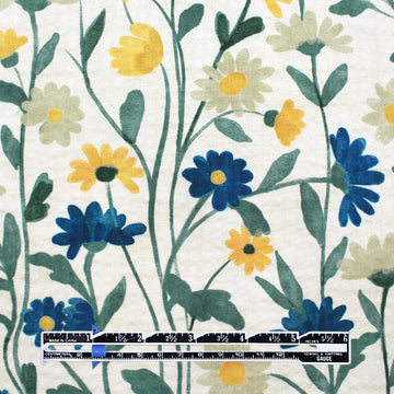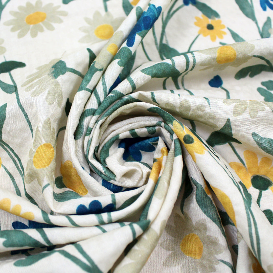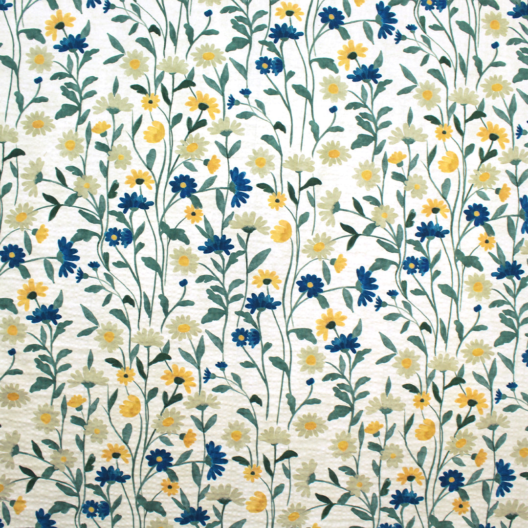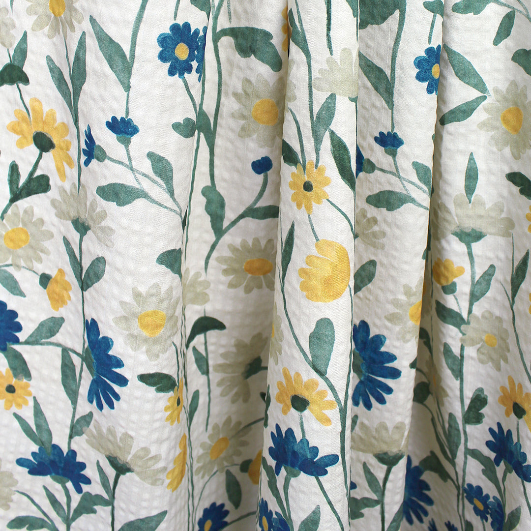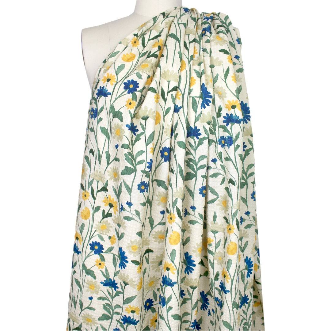 From designer deadstock and made in Italy, this is a light weight textured cotton woven, nearly opaque with a soft drape that has some cottony body and no stretch. The weave has a a seersucker texture and the lovely "painted daisies" design (14" repeat) features shades of butter, basil, light taupe and ocean blue on a light buttercream background (PANTONE 18-4023, 13-0935, 17-6323, 12-0712 but lighter, etc.). Make a beautiful shirt, tunic, dress or skirt, shorts, etc. Hand wash and hang or lay flat to dry (please test first).