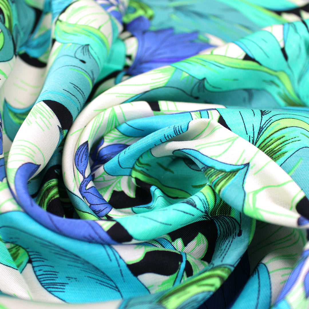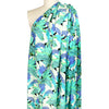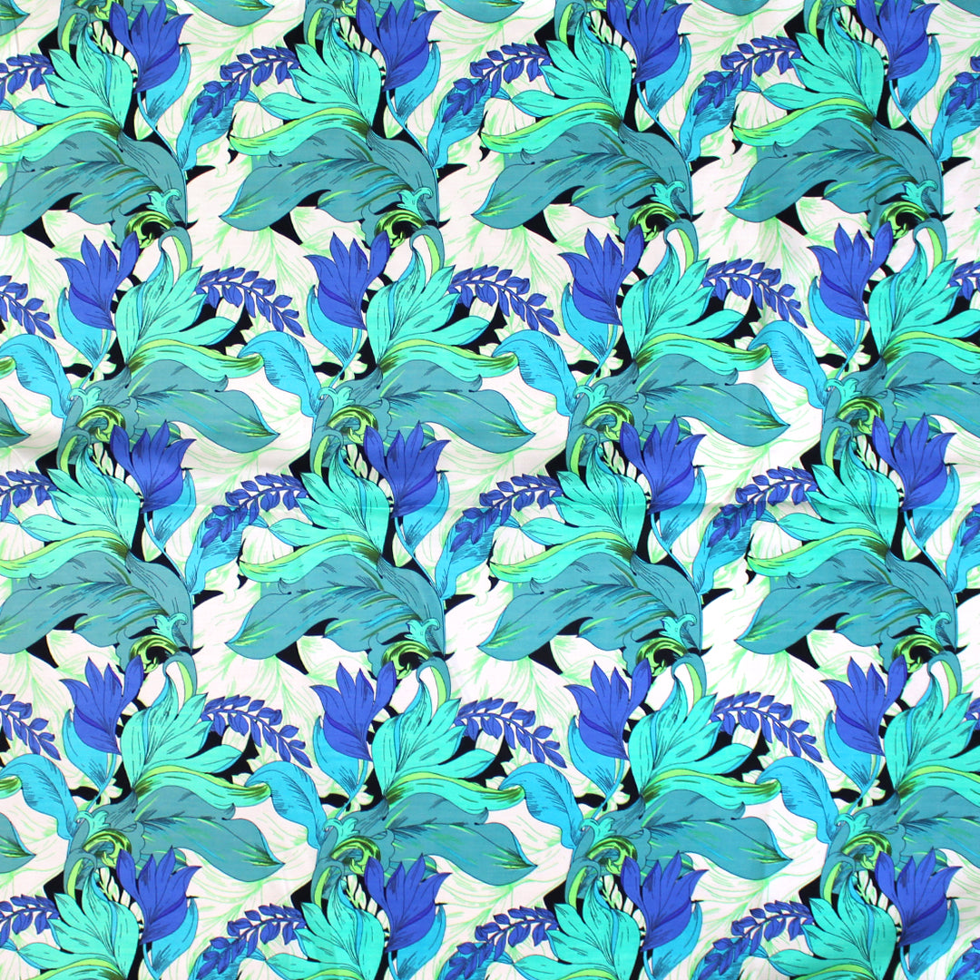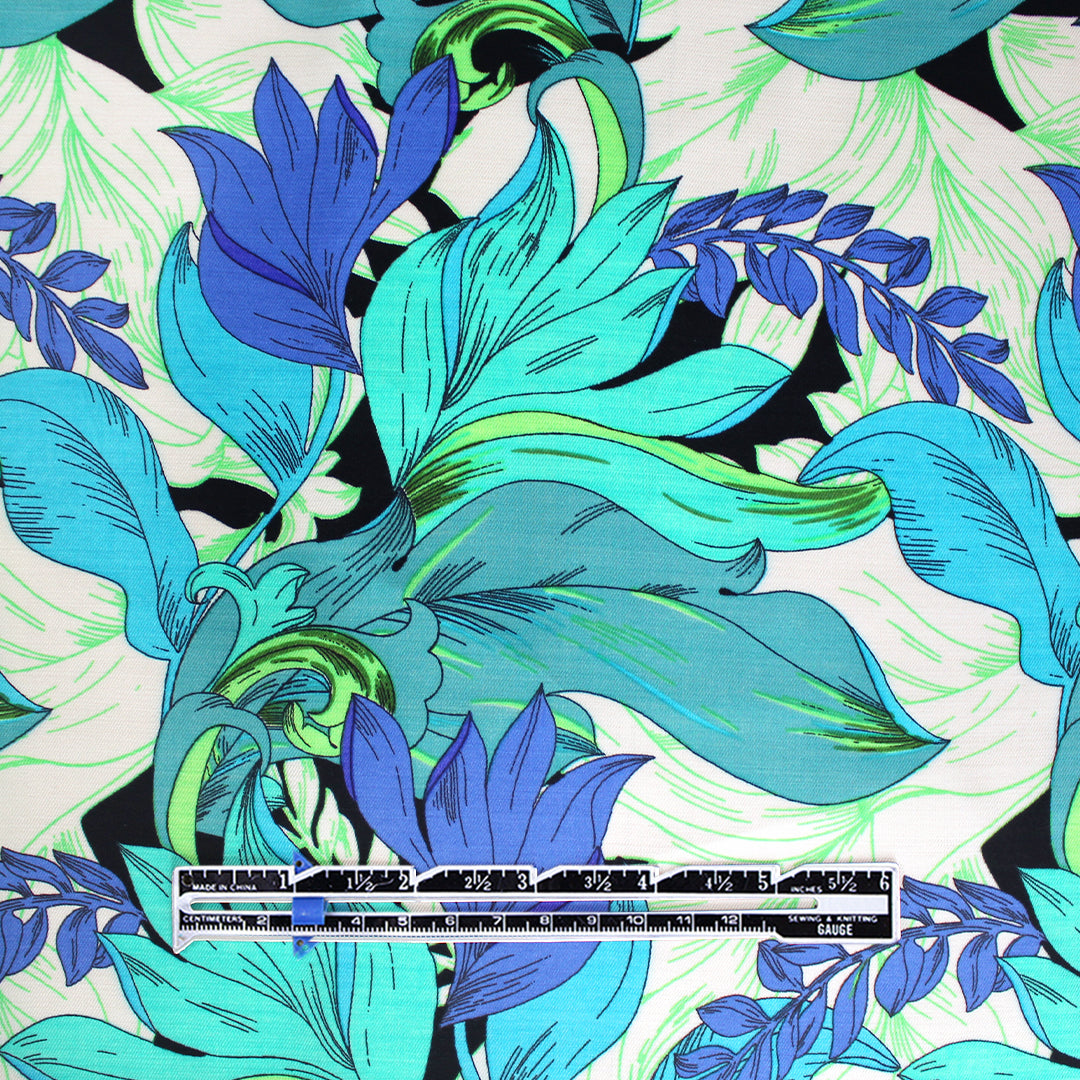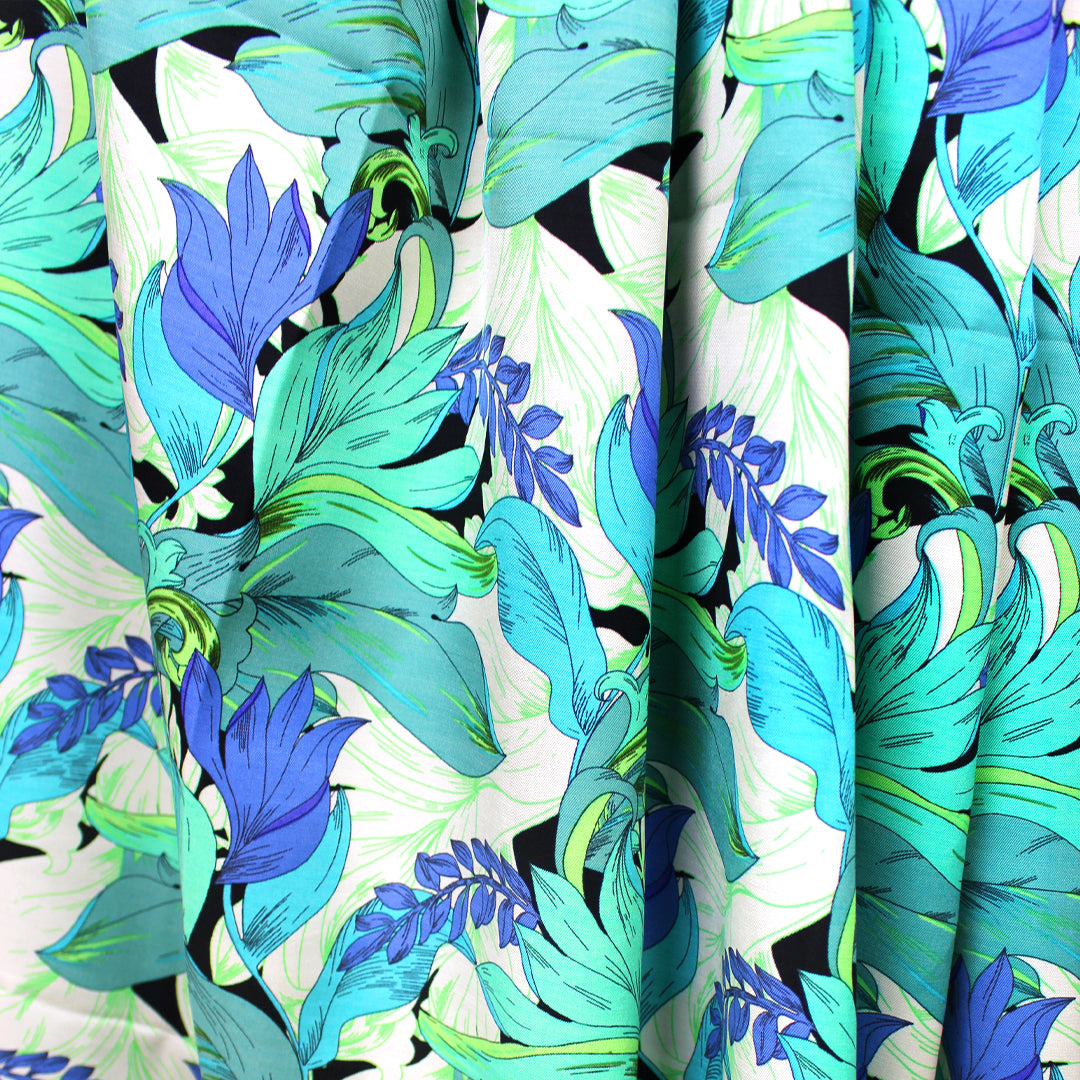 From French designer deadstock, this is a lovely quality viscose twill. It is an opaque light weight woven that is smooth and drapey, with no stretch. The beautiful "graceful floral" graphic (12" repeat) is printed in shades of teal, French blue, baja blue, black, lime, etc. on a papyrus background (PANTONE 11-0107, 18-3935 ish, 16-4712, 16-4725, 15-0545, etc.). Make a blouse, shirt, top, tunic, dress, etc. Dry clean or please test first if you want to hand wash, and hang to dry.
