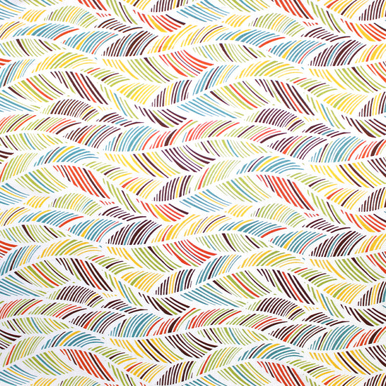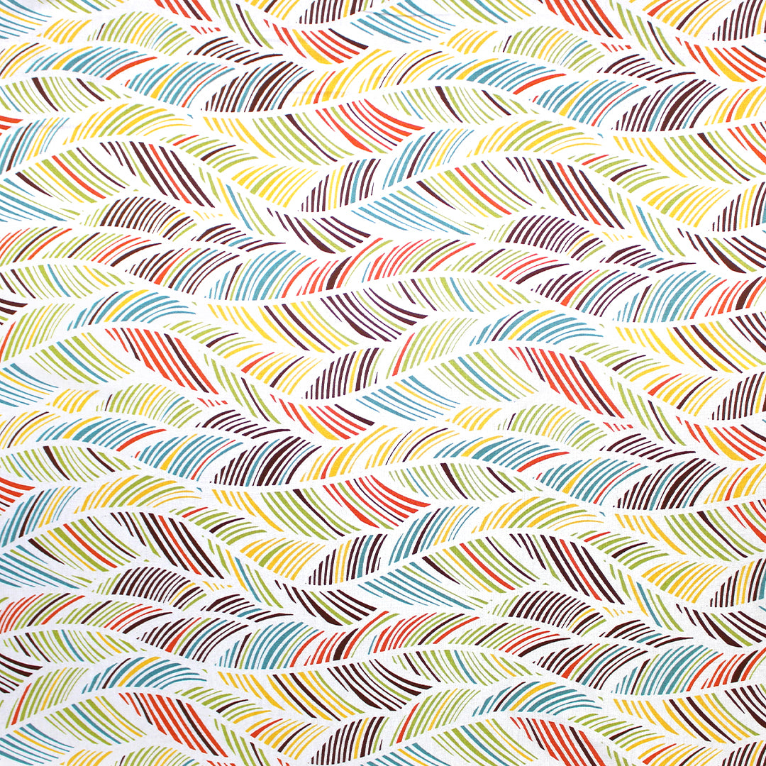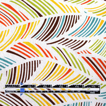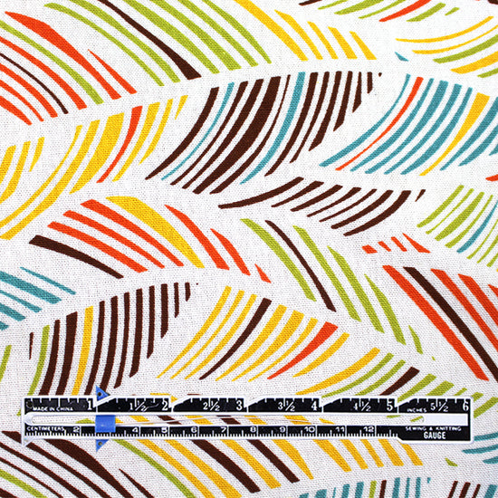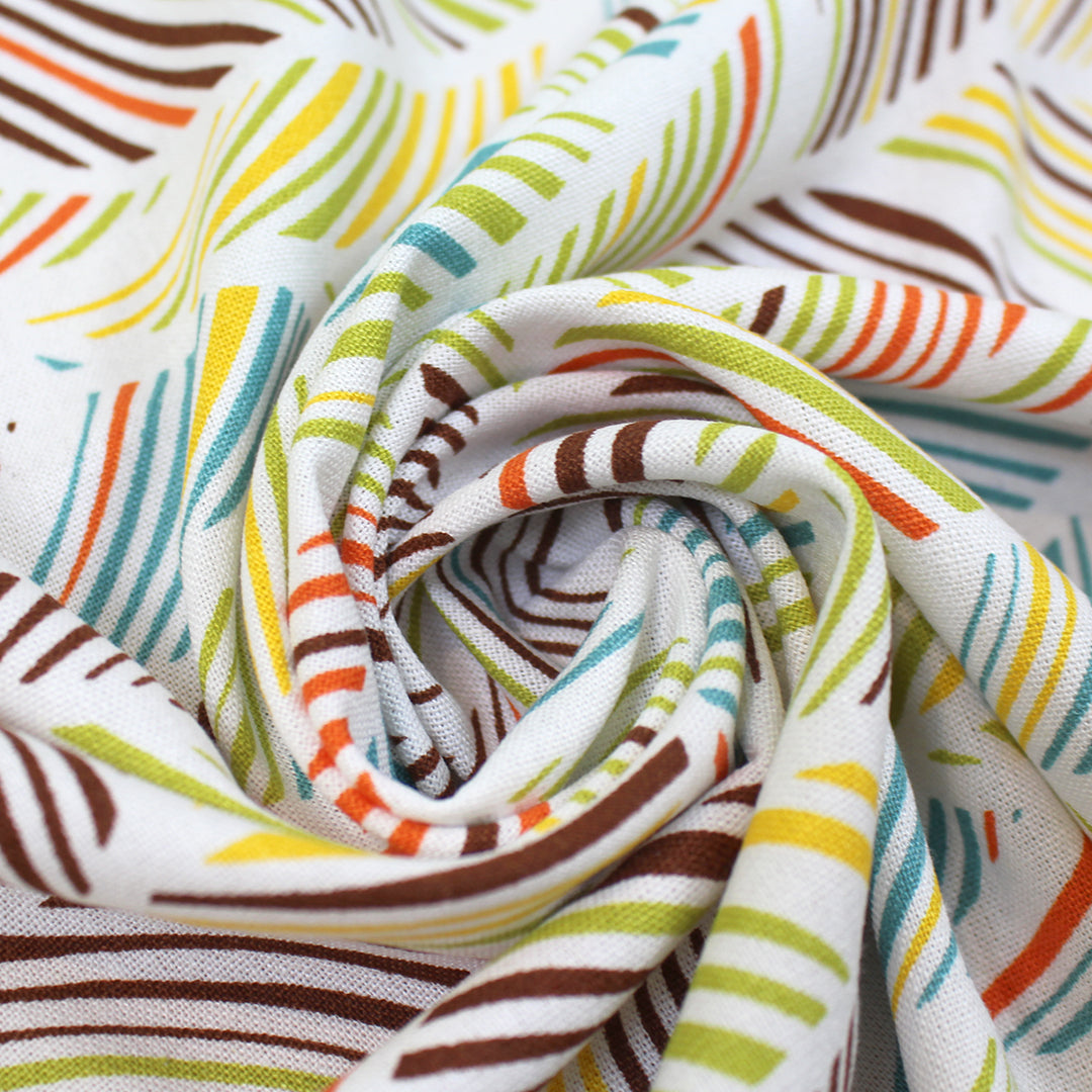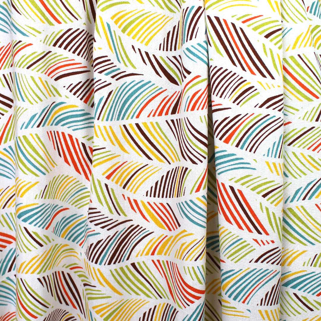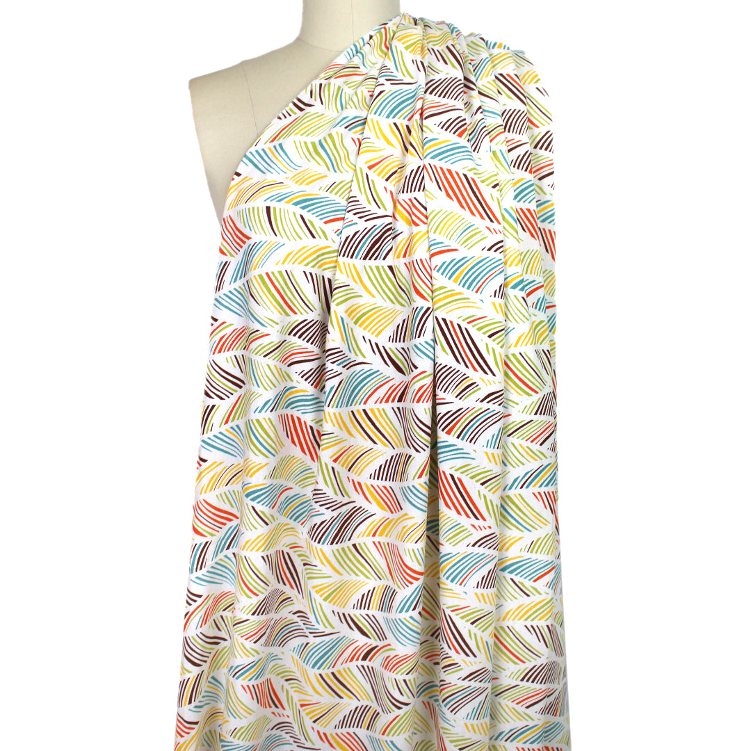 This is a delightful rayon/linen woven, lightweight yet nearly opaque with a soft drape. While the weave is visible, giving it a linen look, the hand is smooth and soft. The "leaf motif" print (11.75" repeat) features avocado, teal blue, sunny yellow, carrot, chocolate, etc. on a soft white background (PANTONE 17-1464, 15-0535, 15-1062, 16-5123, etc.). Since it is stable in both directions, you may cut your garment oriented either way. Perfect for breezy separates and warmer weather garments: pants, tops, dresses, skirts, overshirts, jumpsuits, etc. Pants and skirts may need lining. Hand wash on warm or cold, hang or lay flat to dry, or dry clean. Do not bleach and iron on low.