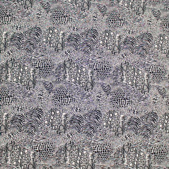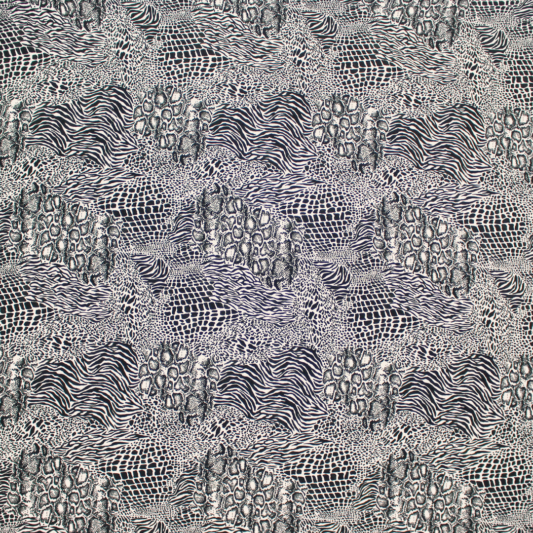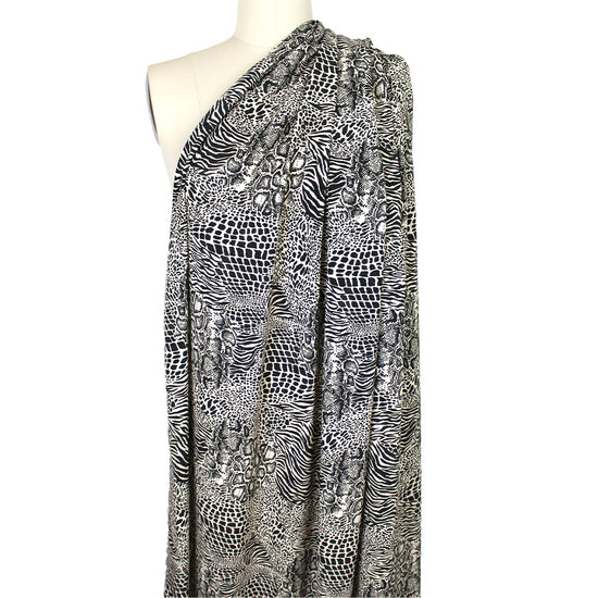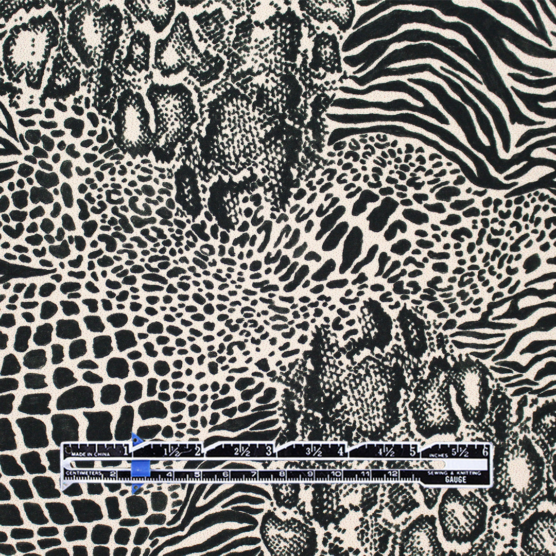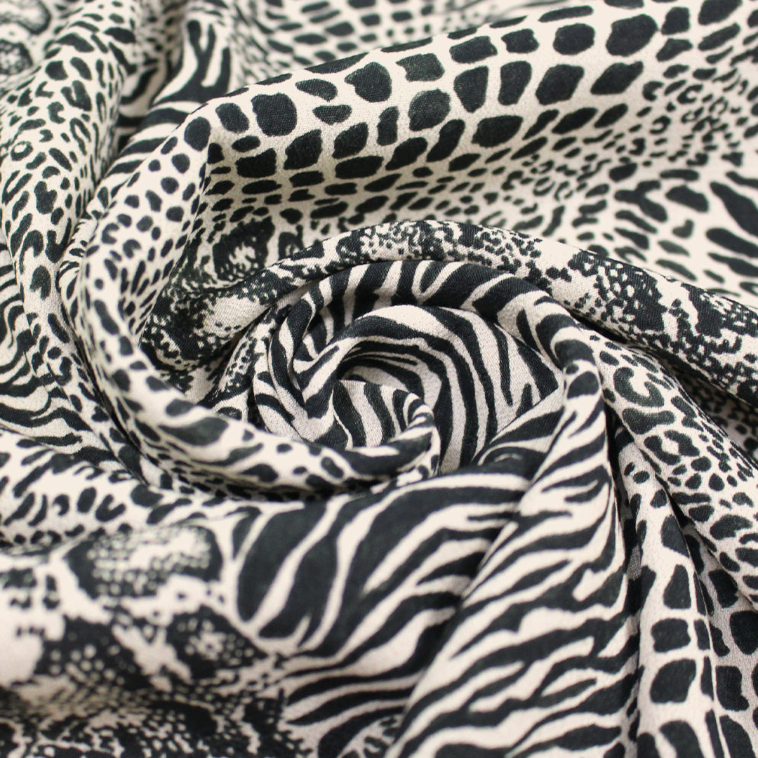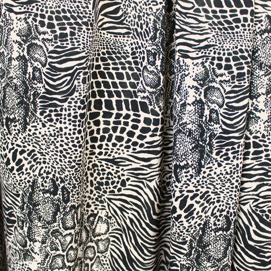 From Italian designer deadstock, this is a fine quality printed viscose crepe woven, a blouse weight that is lightweight and nearly opaque with a flowing drape and subtle surface texture. The 'savannah safari' design (7" repeat) has an animal print theme in black and almond (PANTONE 12-0704, etc.). It has a matte finish and bit of give in the width only. Perfect for blouses, tunics, tops, dresses and skirts, etc. Some styles may need lining or layering. Hand wash, hang to dry (please test first), or dry clean.