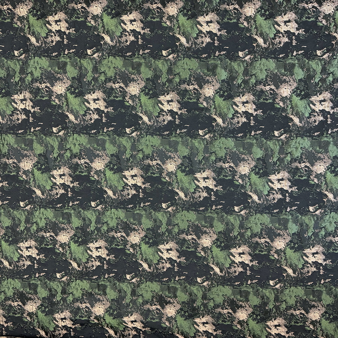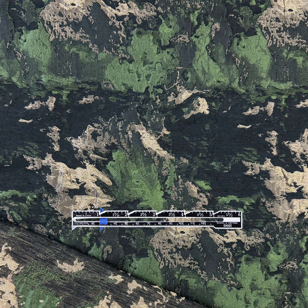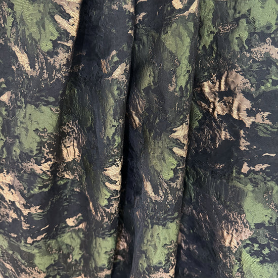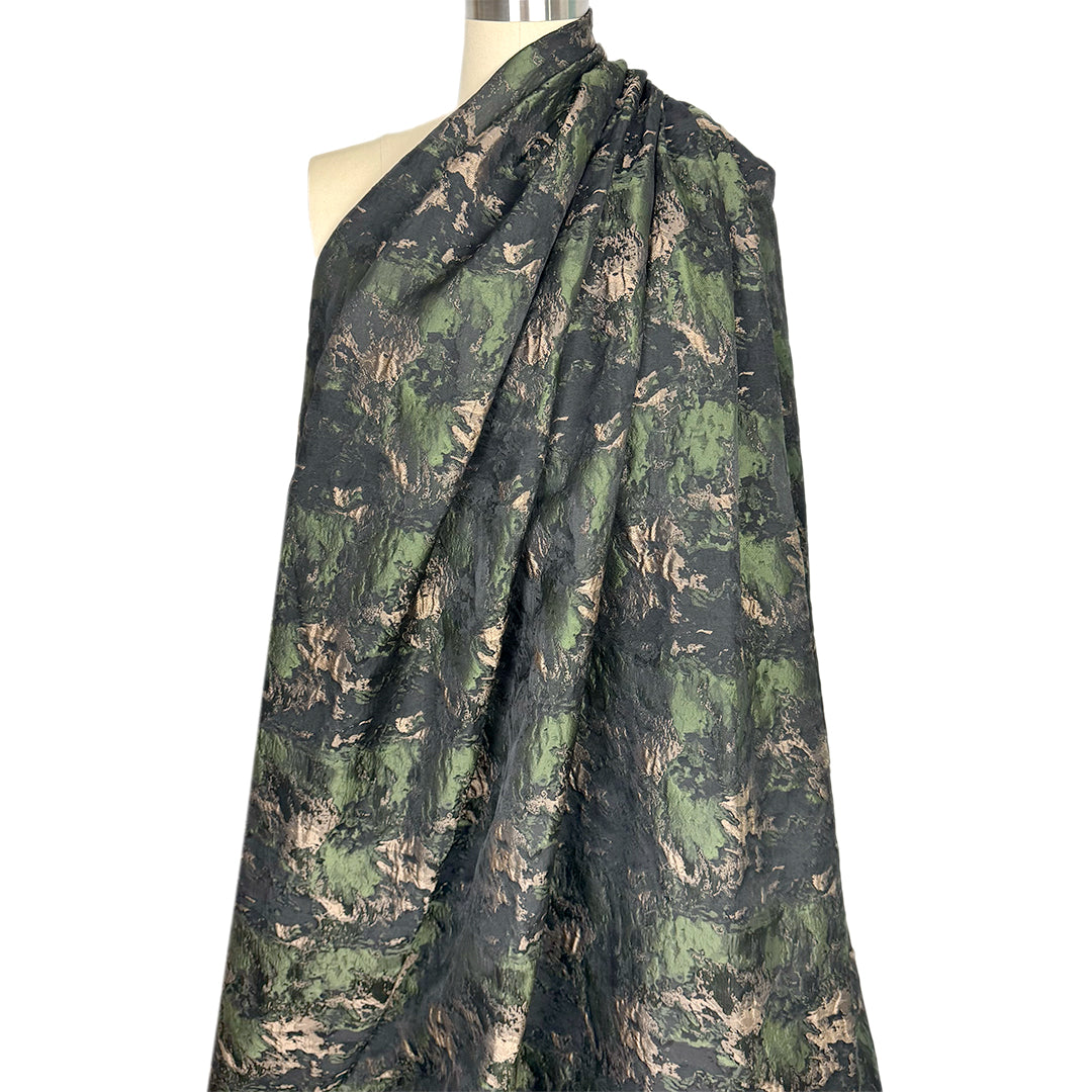 This is a wonderful jacquard brocade woven, a medium suiting weight in a high-quality polyester that has a more firm, yet very malleable (not "crunchy"!) drape and no stretch. The earthy green abstract design (16.5" repeat) features thyme green, frapp� and black (PANTONE 18-0228, 14-1212, etc.) with differing levels of luster throughout for an eye-catching sense of dimension. Make a tailored suit, jacket, sheath dress, topper coat, vest, skirt, fitted dress pants, etc. Dry cleaning is best; please test first if you wish to try another method. 1.75 yds.