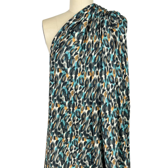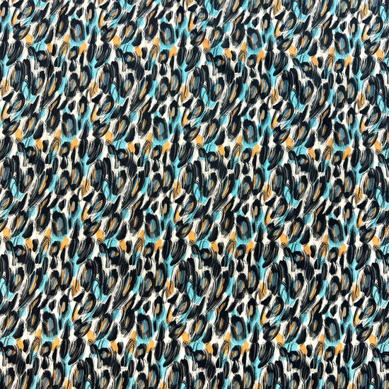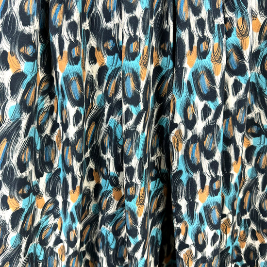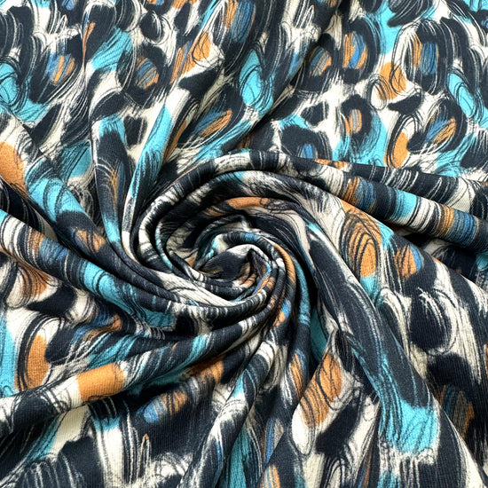 This wonderful cotton/spandex print is imported from The Netherlands, and the quality of the fabric is sublime. The digitally printed "scribble study" print has a 6" repeat, featuring caramel, sky and black on a warm vanilla background (PANTONE 14-4816, 16-1333, 11-0107 is close, etc.). Soft and substantial, it has about 50% stretch in both directions, and is opaque with a bit of body in the drape. It is Oeko-Tex certified for non-toxic chemicals and dyes. Make a great tee, top, dress, tunic, dress or skirt, fun leggings, etc. The manufacturer recommends hand or machine wash warm, hang to dry. Please test first. 2.25 yds.