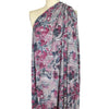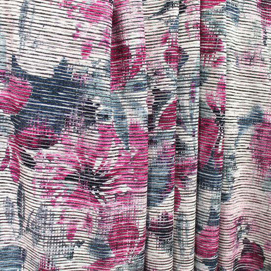 This is an intriguing viscose blend knit, light weight yet opaque with lots of drape and about 30% stretch in the width and 20% in the length. The "fuchsia flowers" pattern has a 23" vertical repeat and is printed in fuchsia, indigo, black, soft white, etc. (PANTONE 18-2328, 19-4110, etc.). A black and white yarn-dyed variegated striping is knitted-in to the base fabric with alternating viscose and poly fibers. The overprinted design is picked up on the viscose fibers only, which creates lots of visual interest with its venetian blind effect. The back side shows the unprinted striping. Great for tees, tops, tunics, dresses and skirts, leggings, etc. Note that this fabric is extra wide! Hand or machine wash, cold, and hang to dry, or dry clean. 1.875 yds.