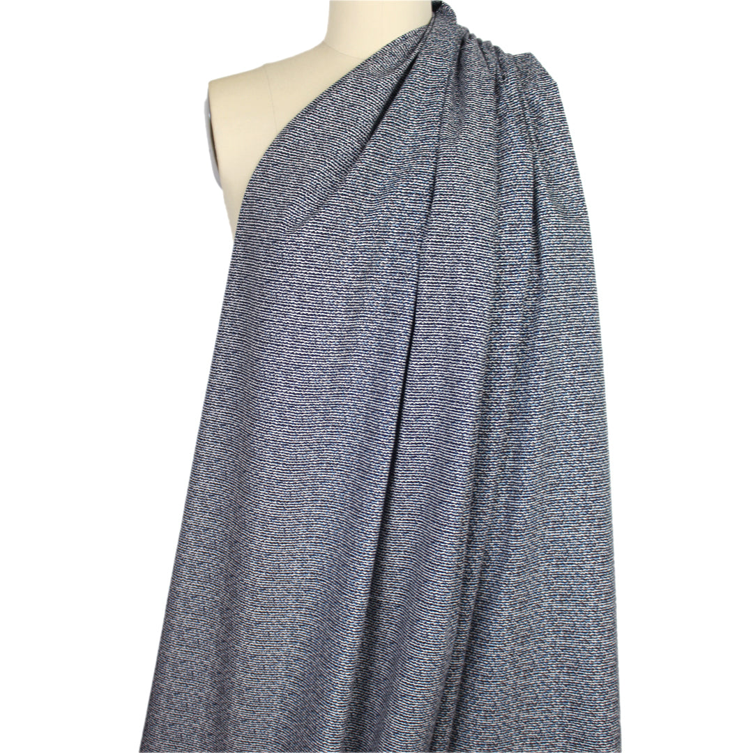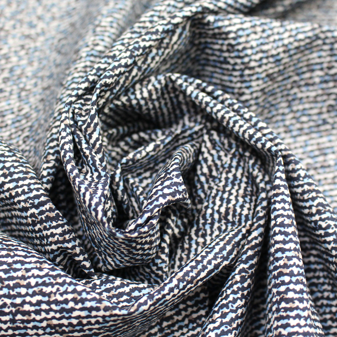 This is a beautiful quality printed cotton shirting, lightweight and nearly opaque with a cottony drape and no stretch. The small-scale "jazzy jot" design (striping has about 1/8" repeat) is printed in dark indigo, light sky blue, alabaster and taupey gray (PANTONE 19-3908, 16-4132, 16-0806, etc.). A very versatile, unisex aesthetic for shirts, tunics, tops, dresses, skirts, etc! Hand or machine wash cold and hang to dry, iron on low.