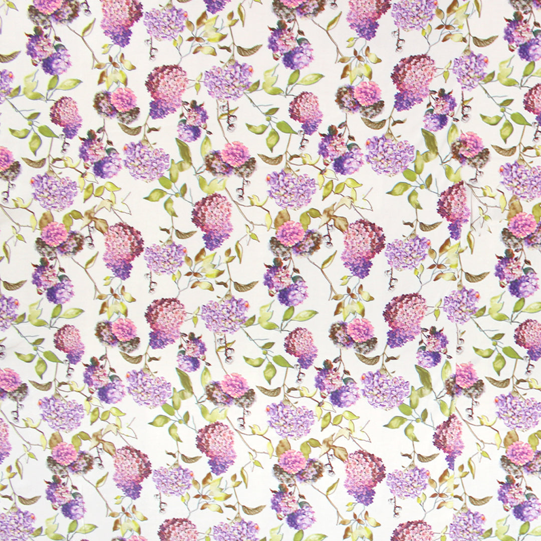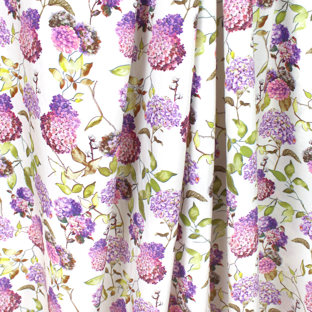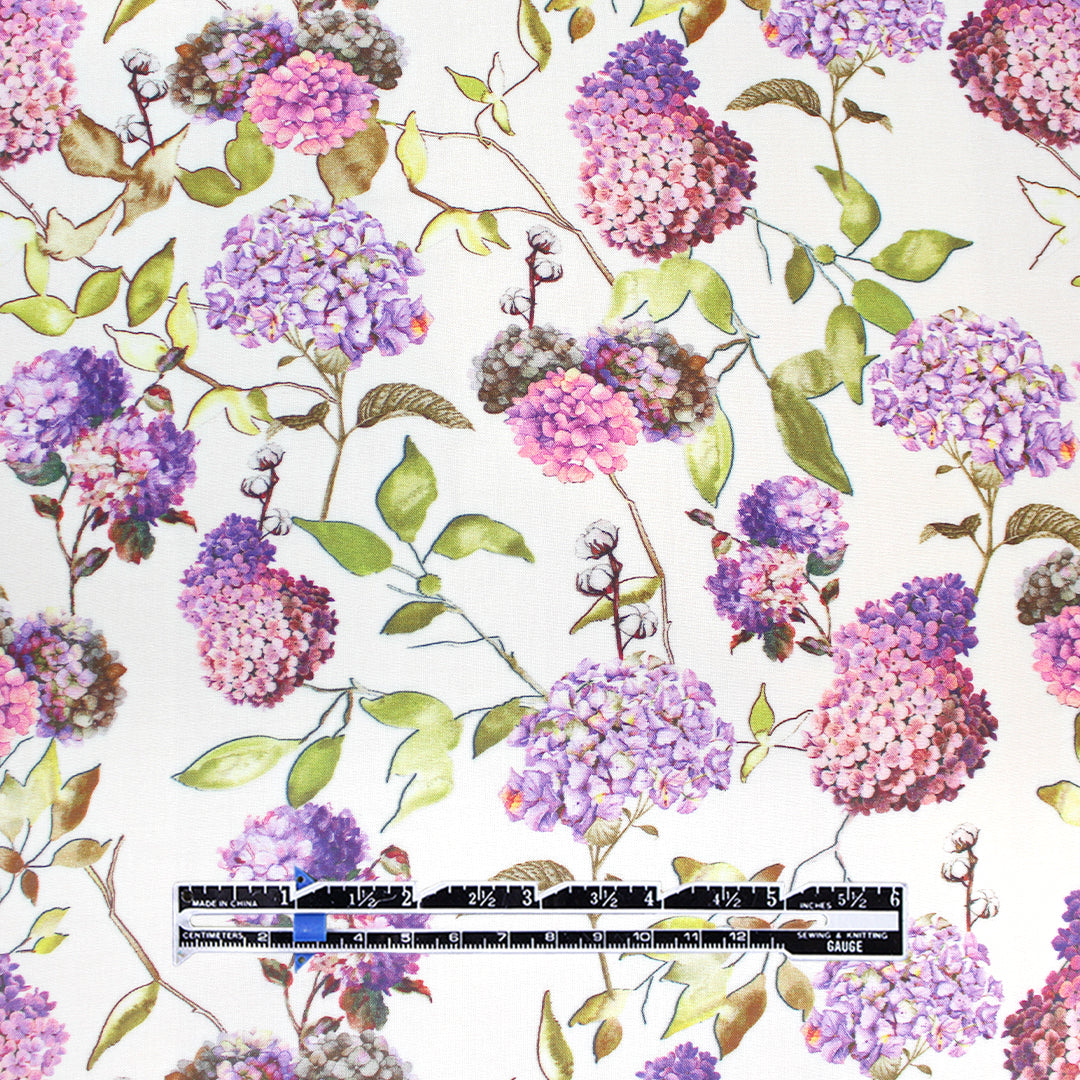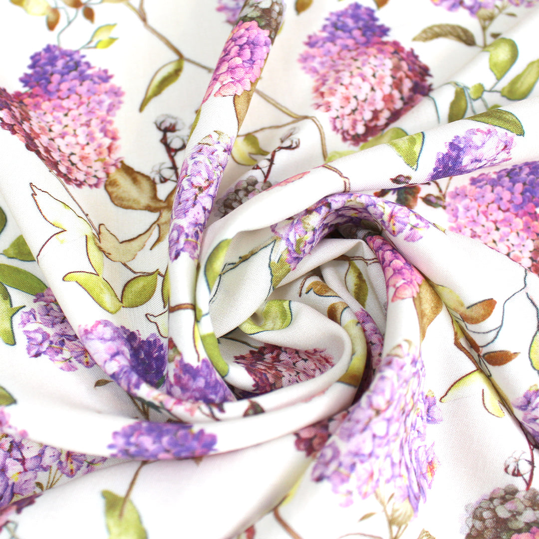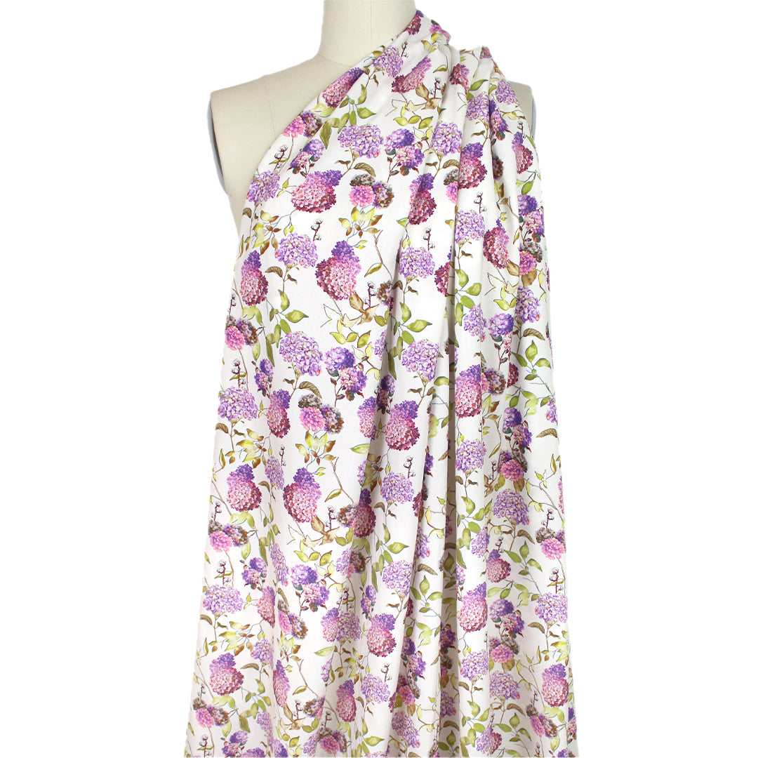 This is a wonderful viscose woven, a dressweight that is nearly opaque with a smooth hand and soft drape. The "hydrangeas and cotton" design (9.5" repeat) features grape, plum and pomegranate tones along with yellow, olive and earth tones on a creamy white background (PANTONE 19-3542, 16-2111, 19-1934, 16-0532, etc.). Perfect for a shirt, blouse, tunic, top, dress, skirt, etc! Some styles may need lining or layering. Hand wash, hang to dry (please test first), or dry clean.