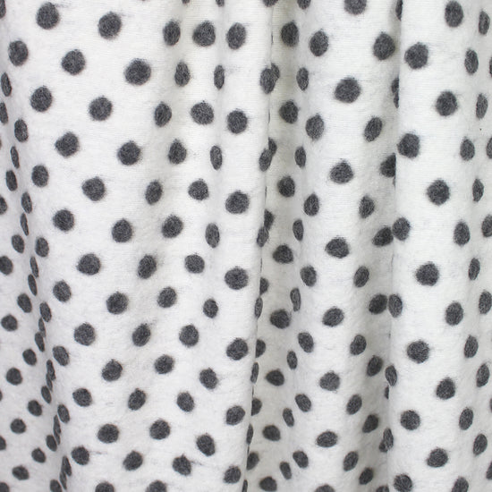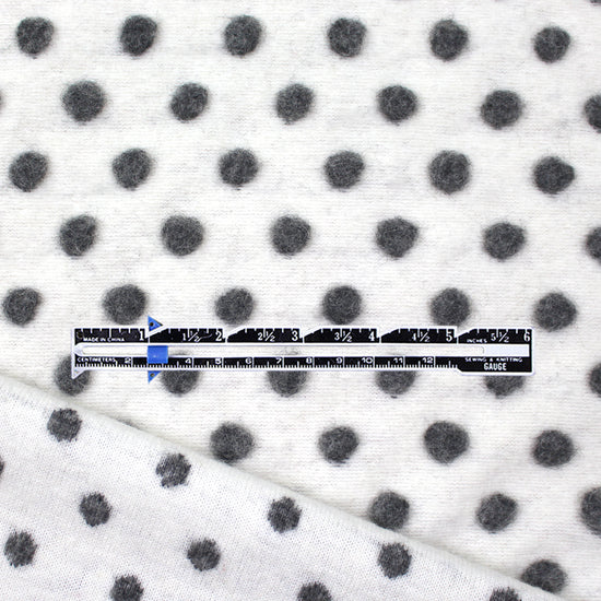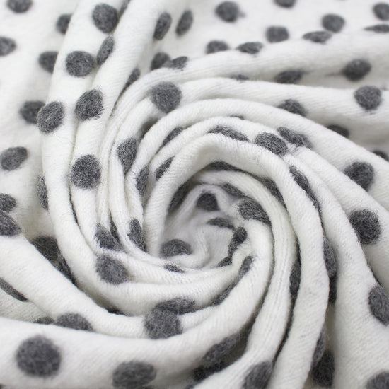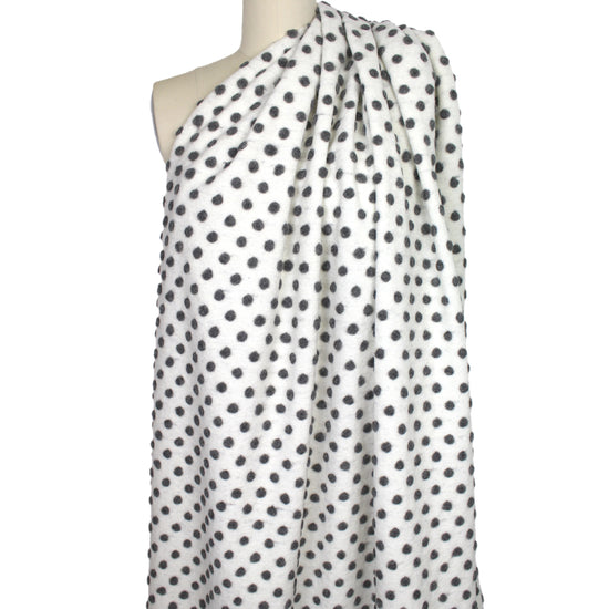 From designer deadstock and made in Italy, this is wonderful textured wool blend knit. This fabric is a soft and warm heavier sweater weight with a 3-dimensional dot design (1.75" repeat). It is opaque with body in the drape, and a lightly brushed effect on the face. The dots are knitted in a charcoal gray on a creamy white background (18-4005, 11-0602) and are raised on the face only (the reverse shows the same yarn-dyed dot pattern without dimension). Although it has about 10% stretch in the width, it is very stable, so it's a perfect choice for an unlined jacket or coat style (but it can also be lined, if you wish!). Gorgeous quality and perfect for fall topper coats and jackets, cardigans, stylish pullovers, scarves and hats, etc. Dry clean, or test first if you wish to try another method.