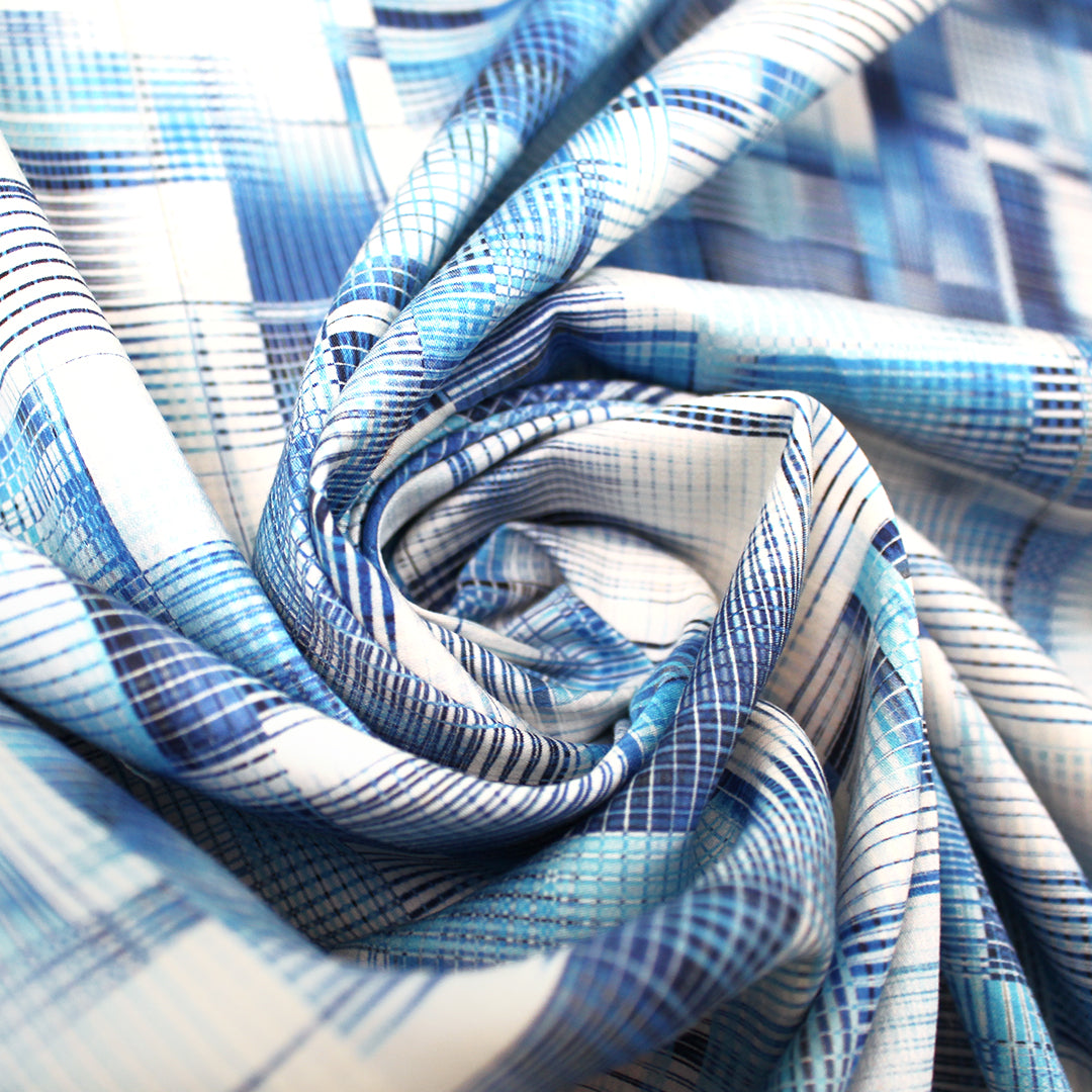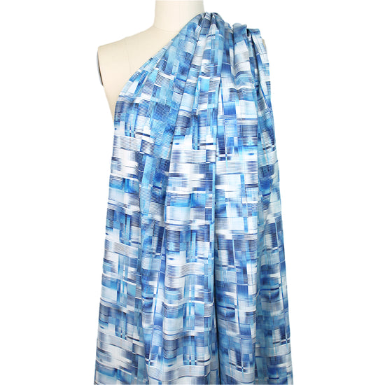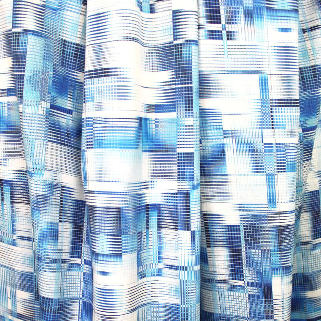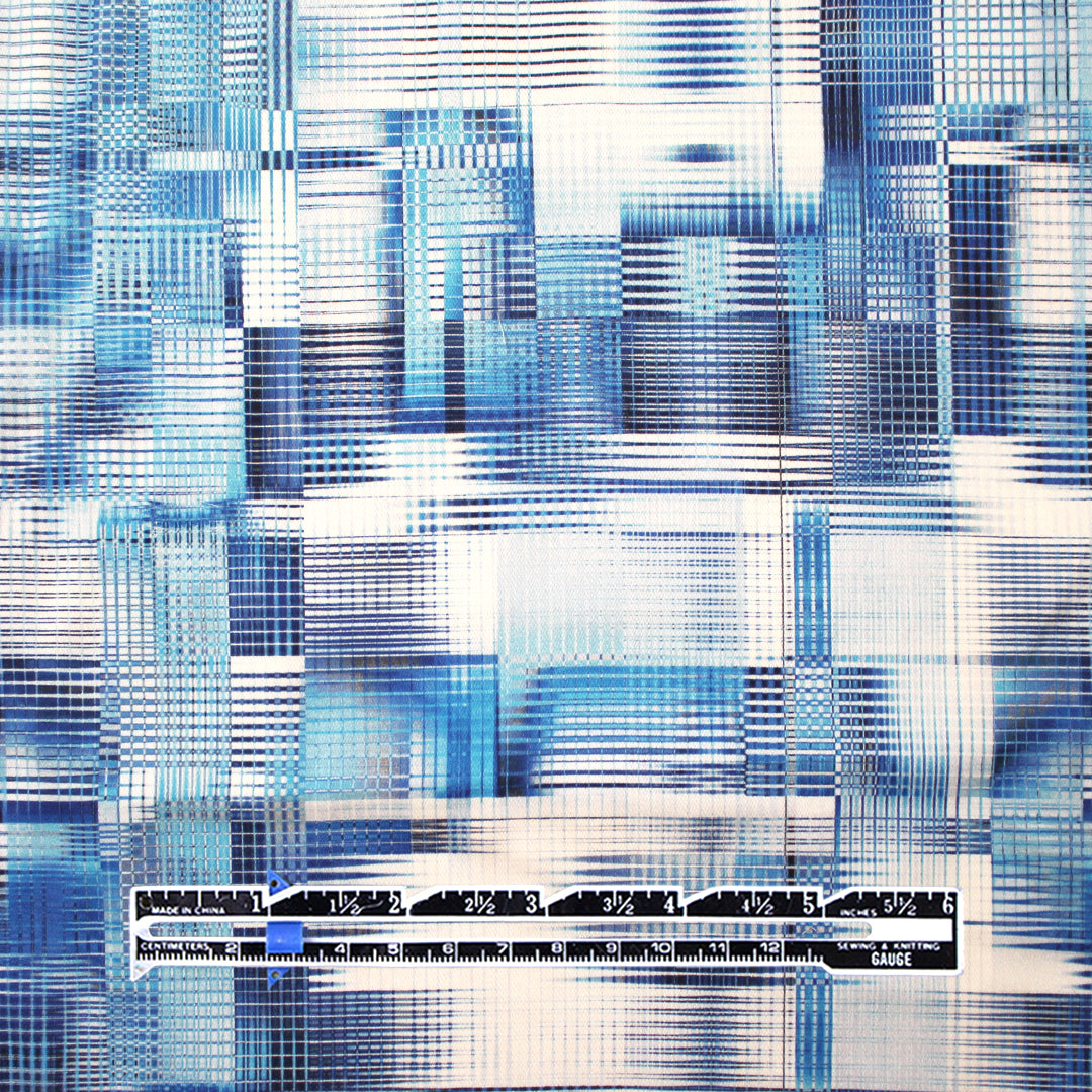This stretch cotton shirting is lightweight and opaque with a tight weave and about 10% stretch in the width. It is smooth and soft with a very slight sheen and a soft cottony drape. The "glass door" print has a 9" repeat and the colors are icy blue, navy, lake blue and soft white (PANTONE 14-4318, 19-4150, 19-3919). Perfect for a unisex shirt or a tunic, dress, skirt, etc. If you wish to hand or machine wash, please test first. Hang to dry. .625 yds.
