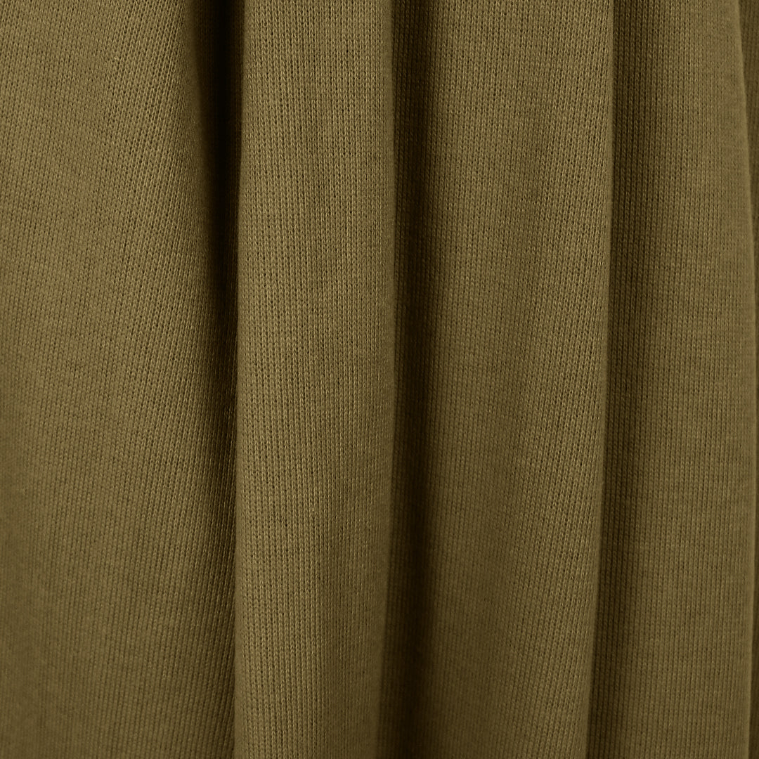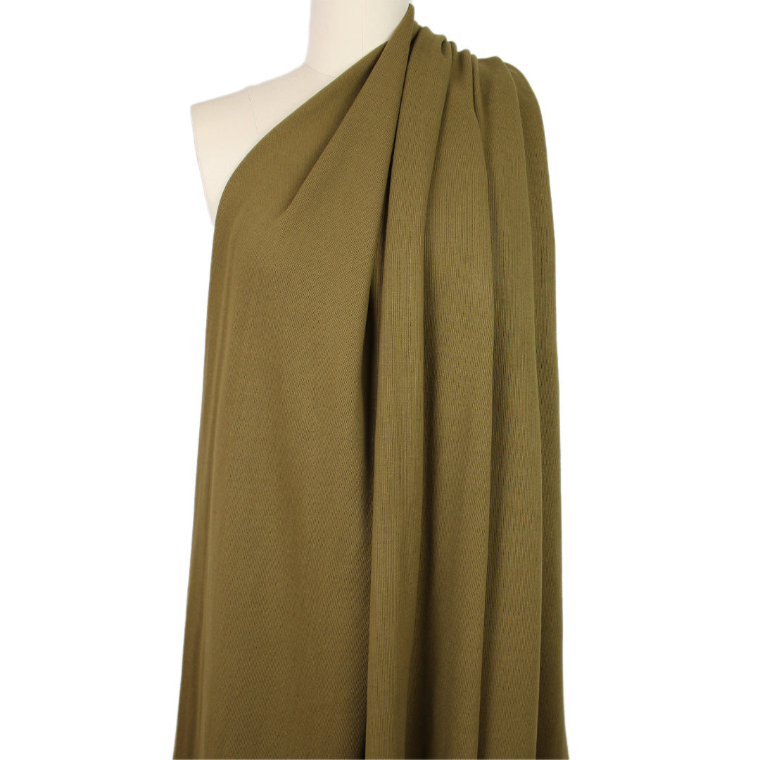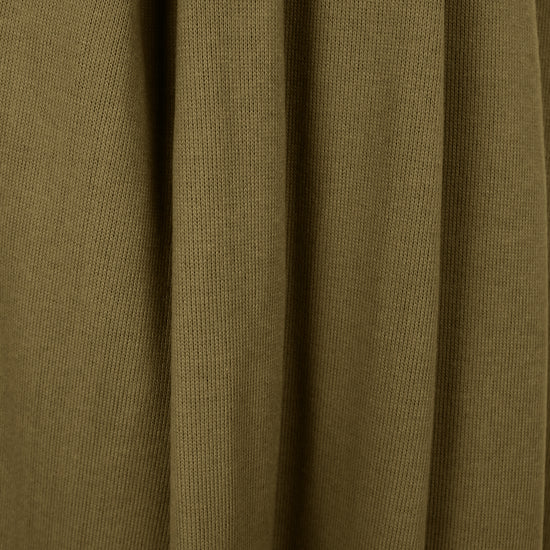 Sourced from Italy, this Lor0 Piana deadstock is an exceptional quality cotton blend doubleface with a different scale of knit stitch on each side. The right side is a 1x1 ribbed knit stitch, soft and smooth but visually rich with texture. The reverse is a very fine plain knit stitch. The two layers are knitted together and cannot be separated. This fabric has about 20% widthwise stretch with good recovery. It is opaque and medium weight with some body in the drape. It has a soft and dry, sweatery hand and while it is substantial, it is not dense or heavy. The color is kelp (PANTONE 17-0929) with a matte finish. Perfect for a cardigan, jacket, pullover, tunic, sweater dress or skirt, etc. Hand wash and lay flat to dry.