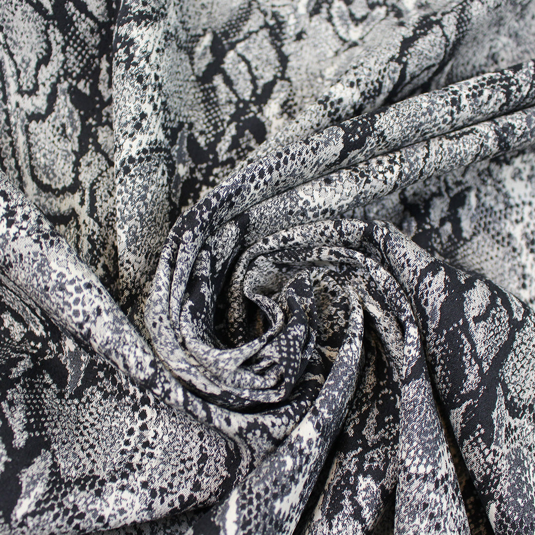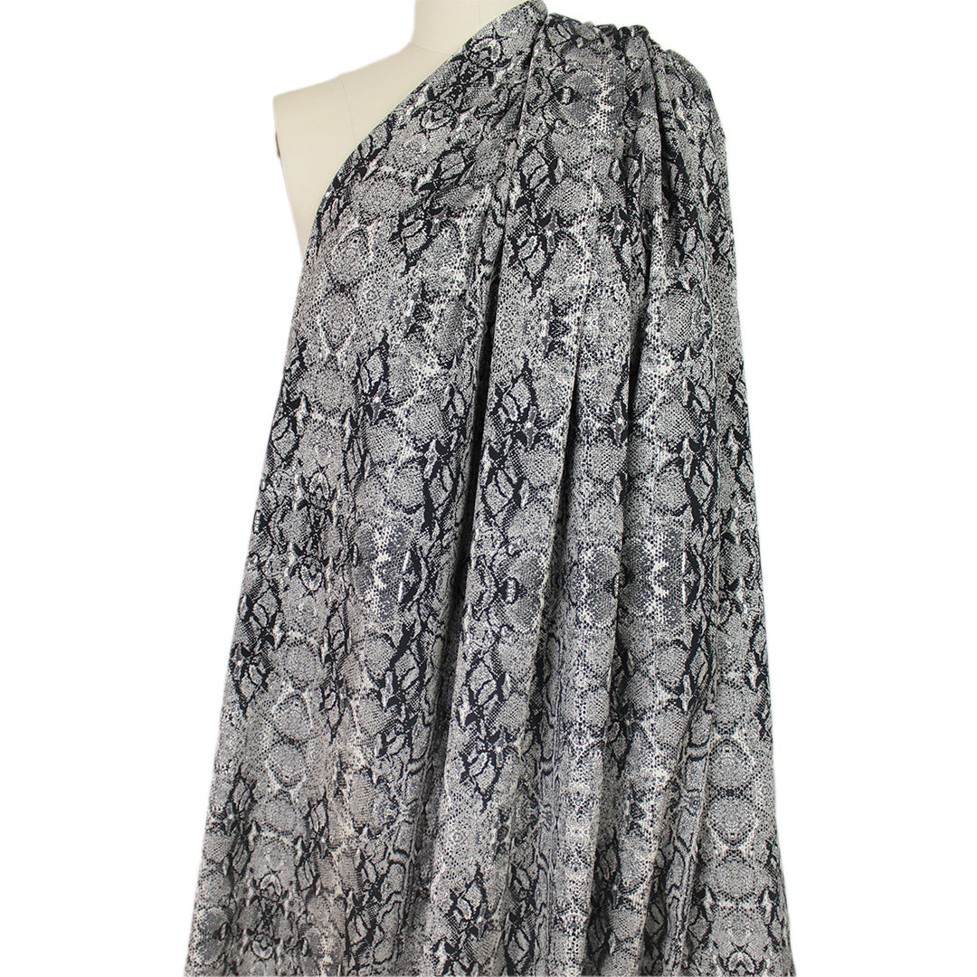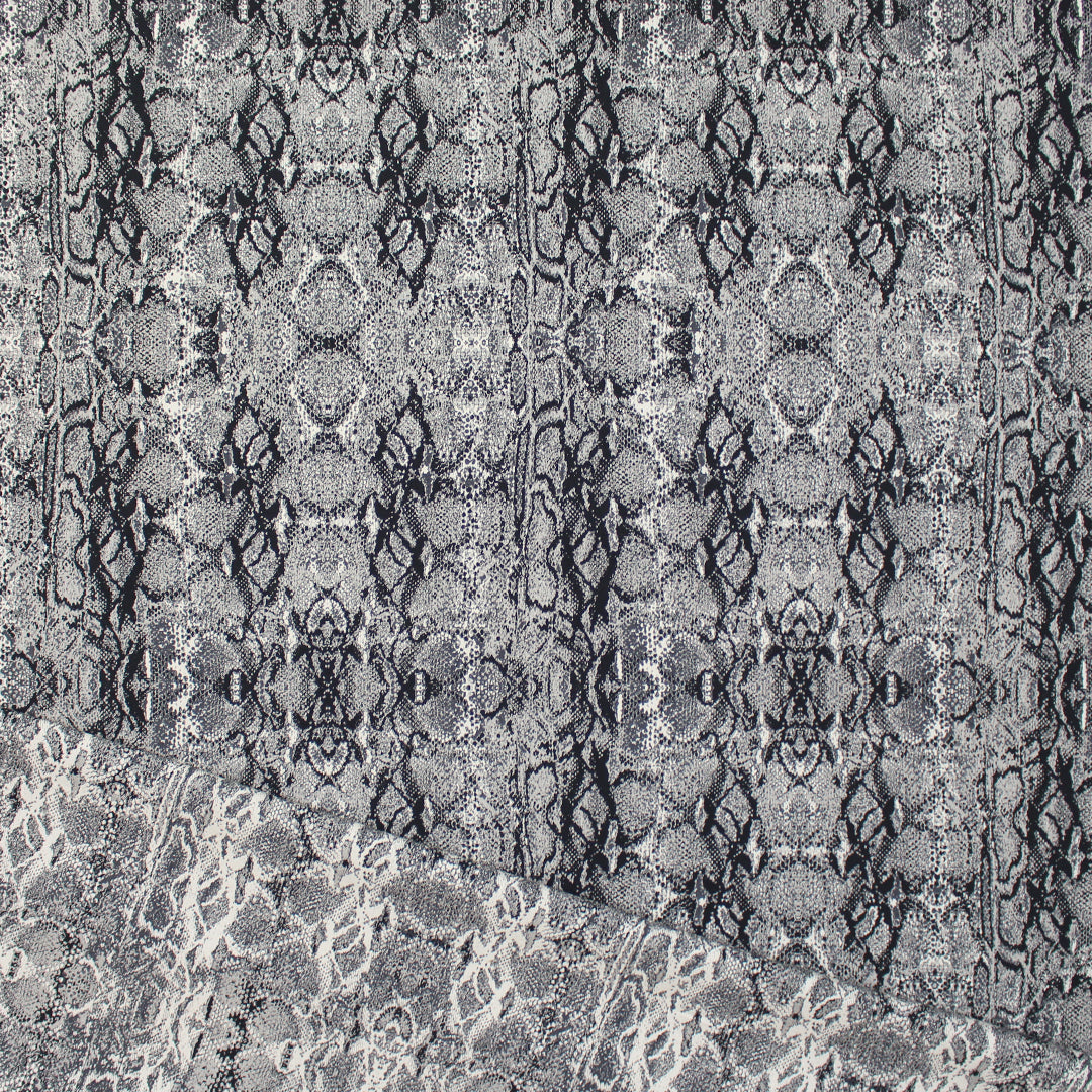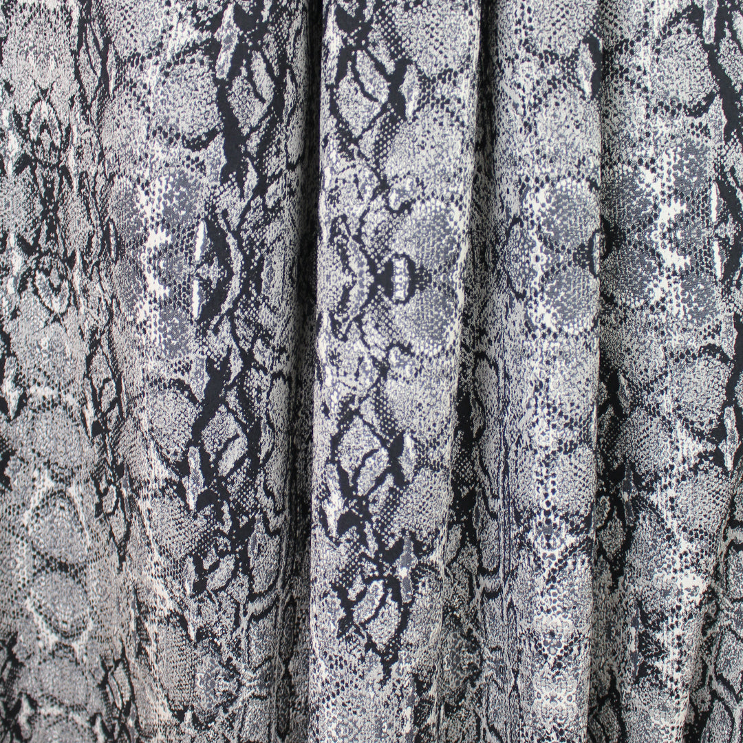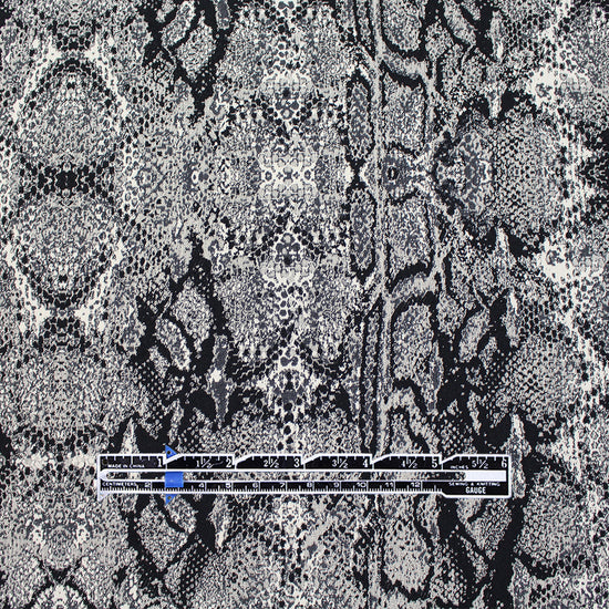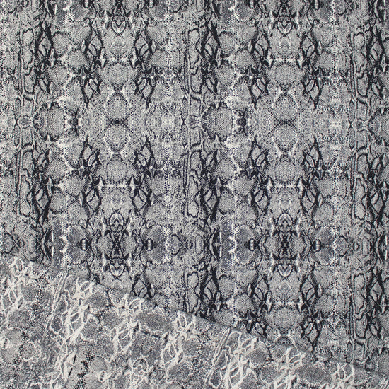 From Italian designer deadstock, this gorgeous stretch jacquard suiting is an opaque woven with a matte finish and about 10% stretch in the width only. It is malleable with cottony body in the drape and the weight is comparable to a lighter stretch denim. The yarn-dyed python design has a 16" repeat and is woven in winter white, charcoal gray and black (PANTONE 11-0602 is close, 18-0000, etc.). The reverse is an inversion of the same design with a lighter overall impression, and could be used as well but it shows some crossthreads. A stunning fabric that can be dressed up or down, and would make a fabulous topper coat or jacket, pencil skirt, cigarette pants, sheath dress, etc. Dry cleaning recommended. 1 yard.