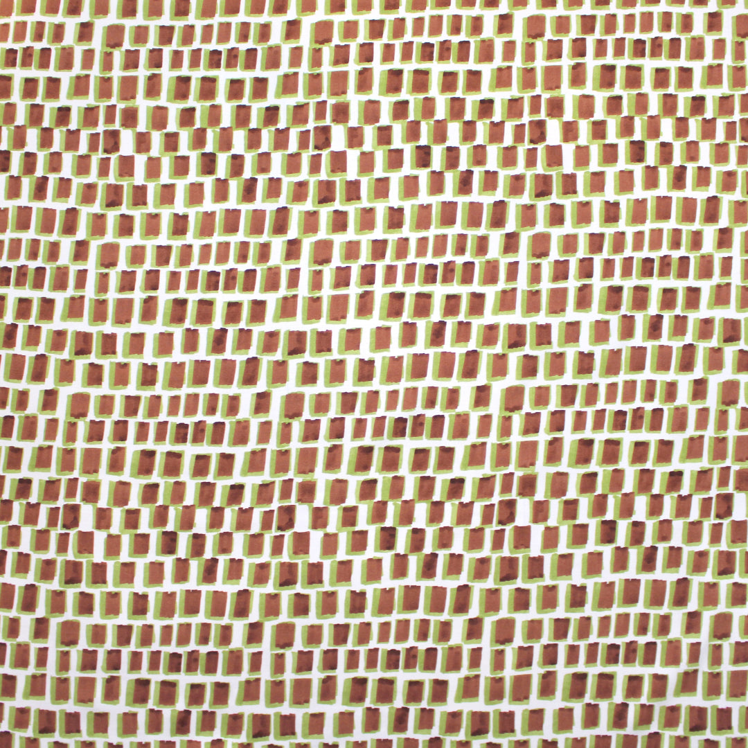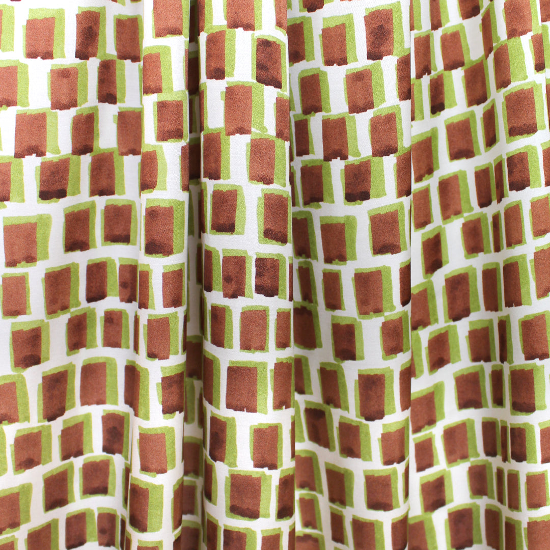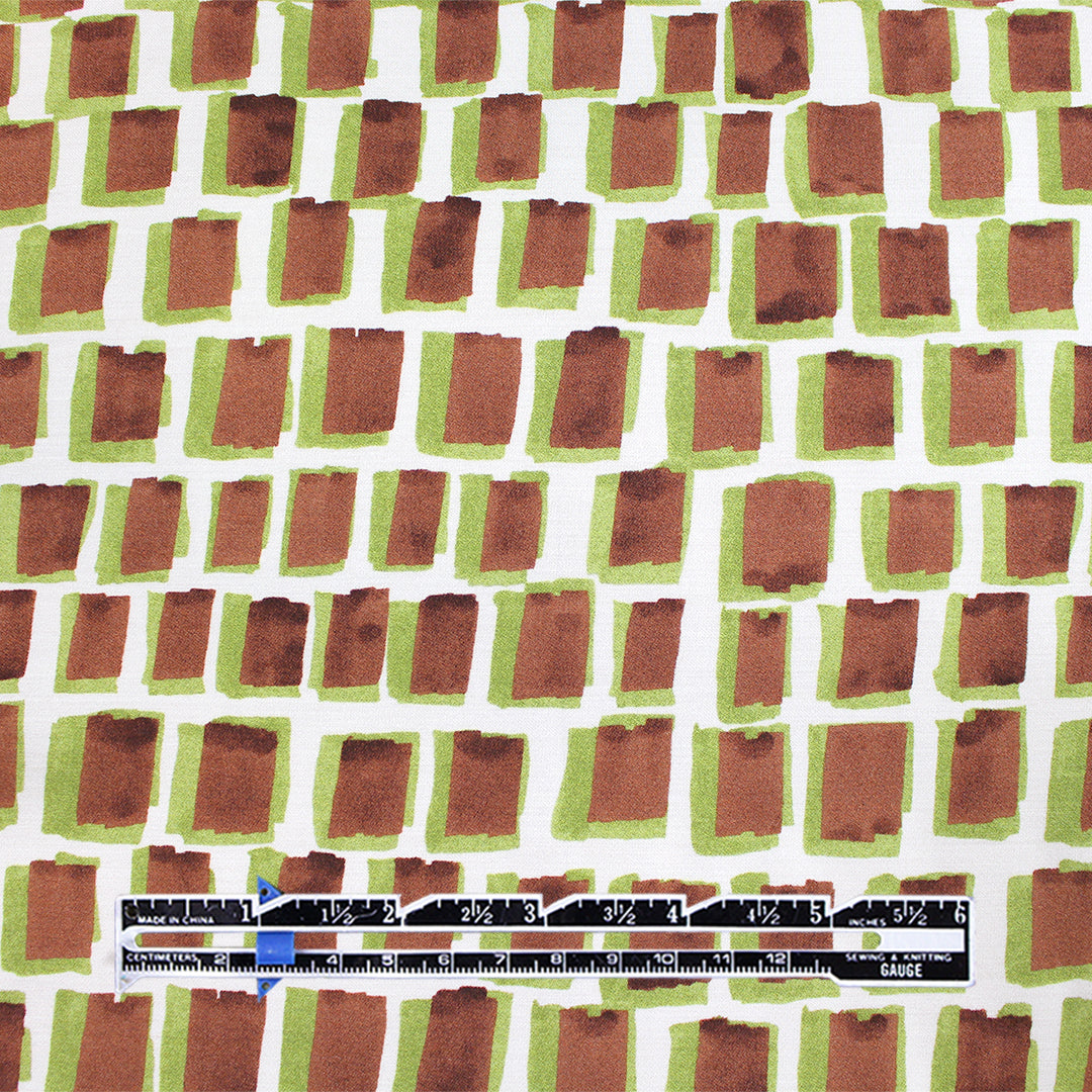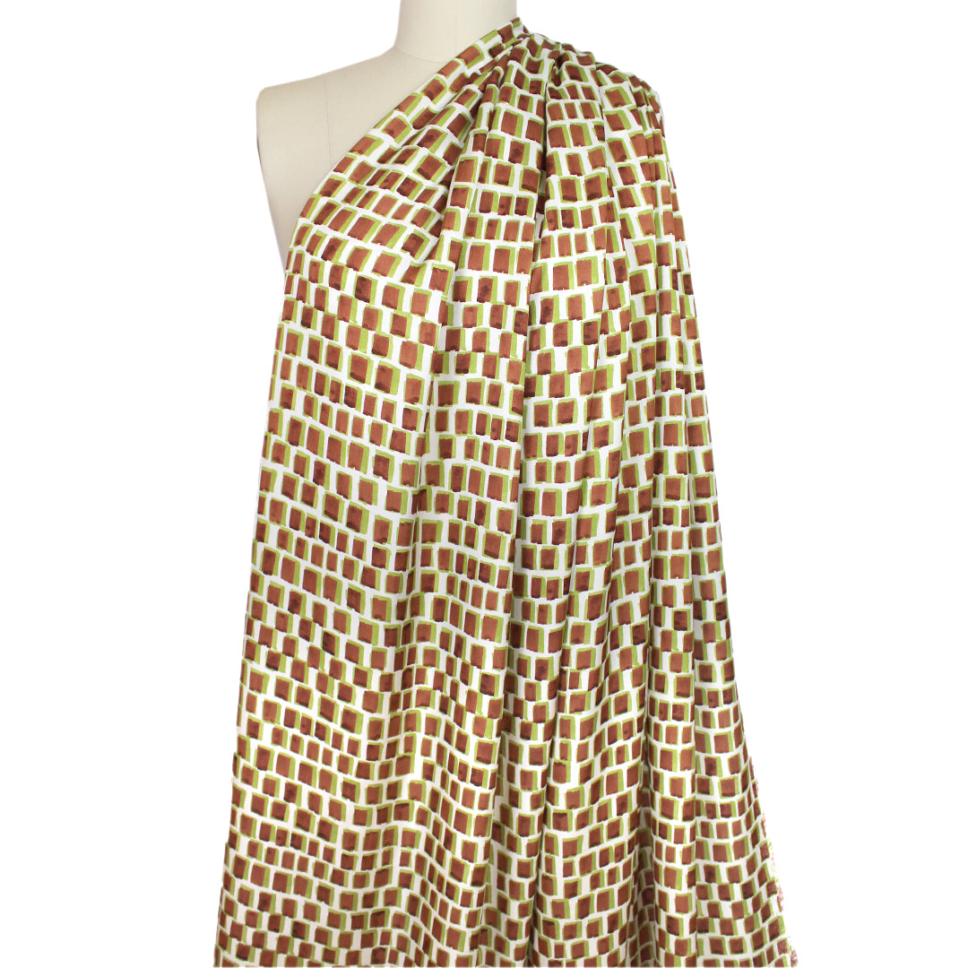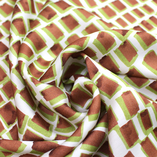 This is a gorgeous quality printed viscose satin woven, a light blouse weight that is nearly opaque with a flowing, soft drape. The wonderful "kiwi brush marks" print has a painterly geometric design with a 4.75" repeat and features kiwi green and sierra brown on a soft white background (PANTONE 18-1239, 16-0540, etc.). It has a slight satiny sheen (like silk) and no stretch. It is perfect for blouses, tunics, tops, dresses, skirts, etc! Some styles may need lining. Dry clean or test first if you wish to hand wash, and hang to dry. .625 yds.