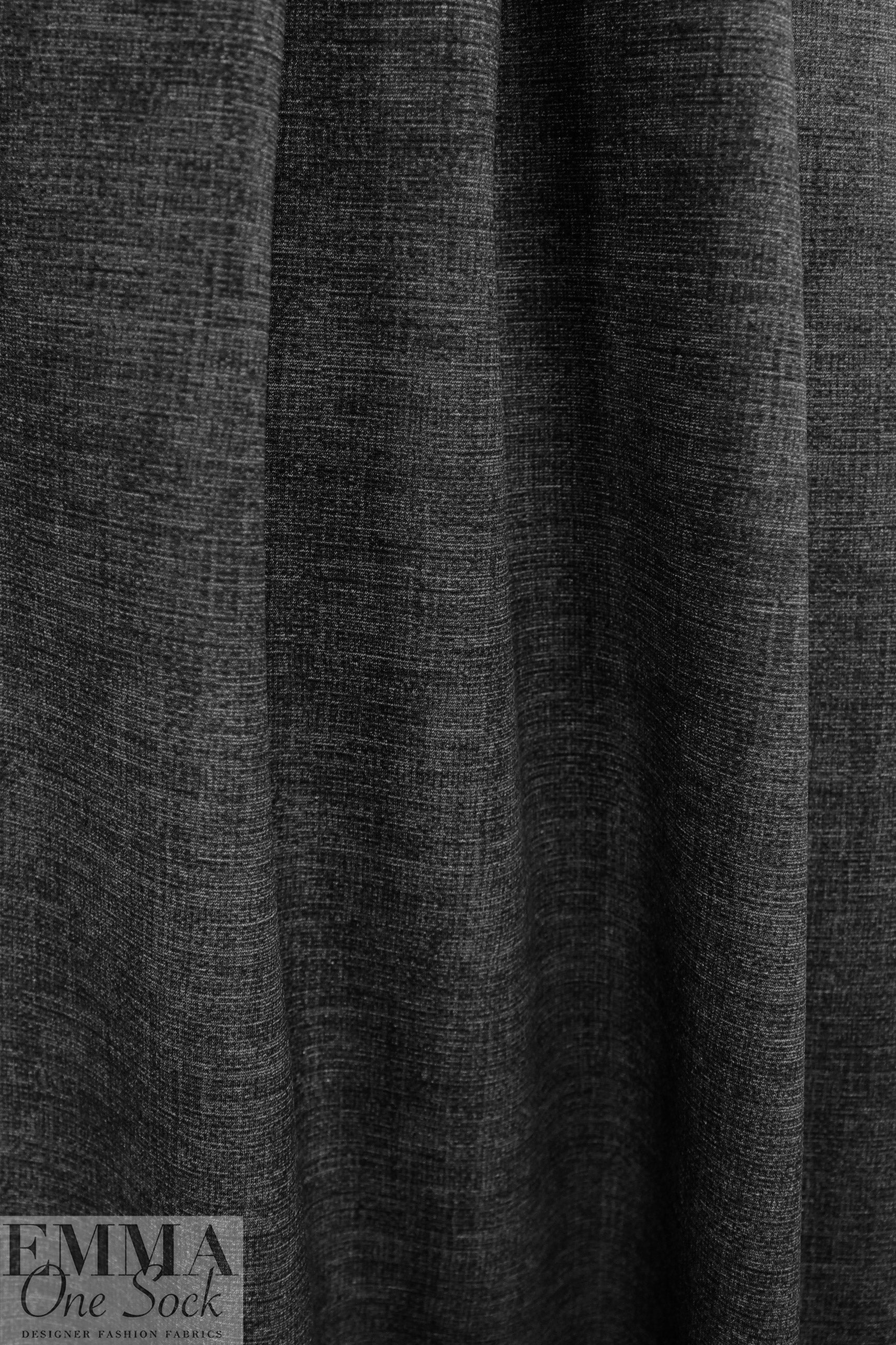 This beautiful quality printed ponte has an opaque black back side and "mottled hatch" print on the front featuring shades of light and dark grays and black for an overall impression of a dark neutral gray (PANTONE 19-4205 is close). The print is subdued, and will coordinate well with a great many fabrics. This perfect medium weight ponte has about 20% stretch in the width, 10% in the length, with great recovery. There's no bleed through to the reverse side, so the black reverse makes an excellent solid contrast color. This fabric has some drape with substance and body, perfect for fashion-forward skinny pants, body hugging knit dress, tunic, skirt, knit suit, fitted jacket, etc. Manufacturer recommends machine wash, tumble dry low, or dry clean. No bleach. .5 yds.