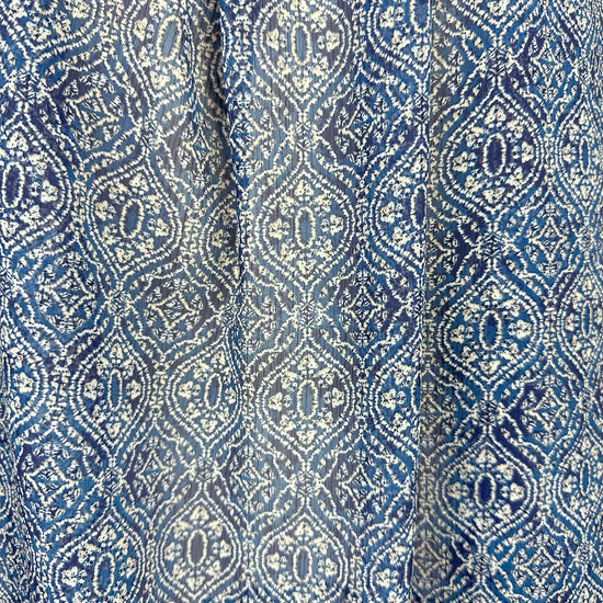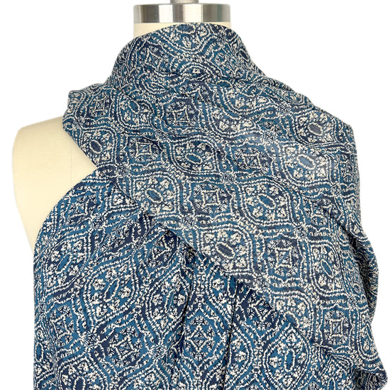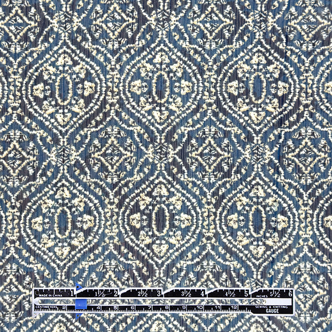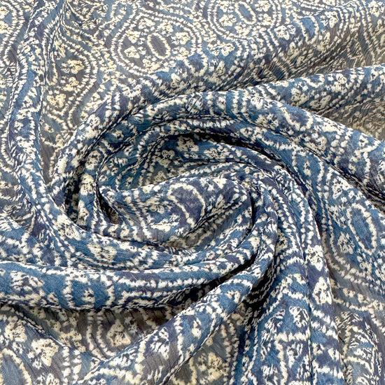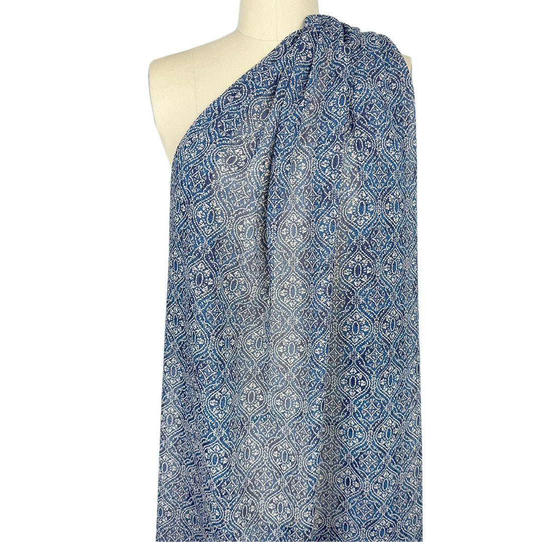 This is a wonderful crinkle-textured yoryu woven, light weight and semi-sheer with a soft drape. It is elegant, smooth to the touch and pairs perfectly with our lightweight jersey in the same print (see coordinates, pictured together in last image). The "blue medallion" design (3.5" repeat) features navy, ocean blue, vanilla bean and white (PANTONE 19-4324, 14-1108, 19-3920), and is equally saturated on both sides. It is stable in both directions, though it has some give in the width due to the crinkle texture. Make wonderful, drapey separates, a lined skirt or dress, tops and bottoms that can go from day to evening, a pretty scarf, etc. Dry clean or test first if you wish to hand wash, lay flat to dry and iron on low only. END OF ROLL, 1.5 yds.