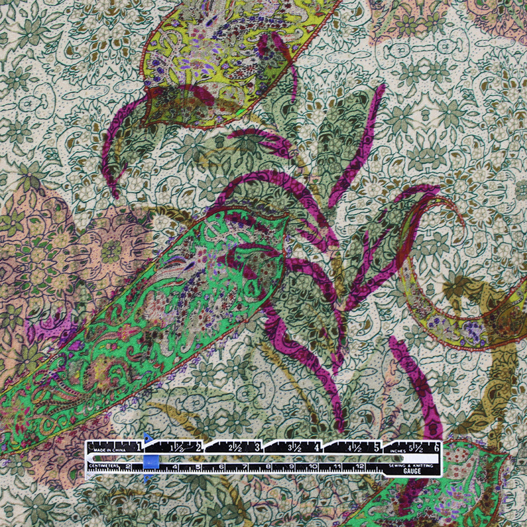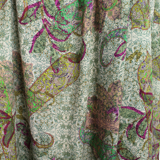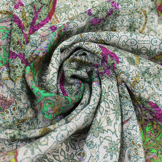 From Italian designer deadstock, this is a very beautiful semi-sheer viscose crepe woven, super light weight with a soft and floaty drape, and a very slight grainy crepe texture. The "intricate paisley" design (23" repeat) features shades of olive green, yellow olive, bay leaf, magenta, dusky apricot, light kelly green, etc. on a light taupe background (PANTONE 16-1220, 11-0806, 17-1019, 17-6153, 19-2434, etc.). Perfect for a blouse, top, tunic, overshirt, dress, skirt, etc. Some styles will need lining or layering. Hand or machine wash gentle (please test first), and hang to dry, or dry clean. 1.5 yds.