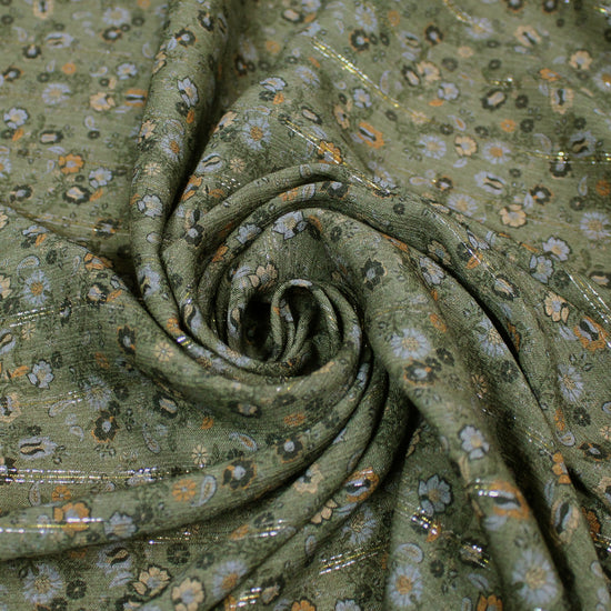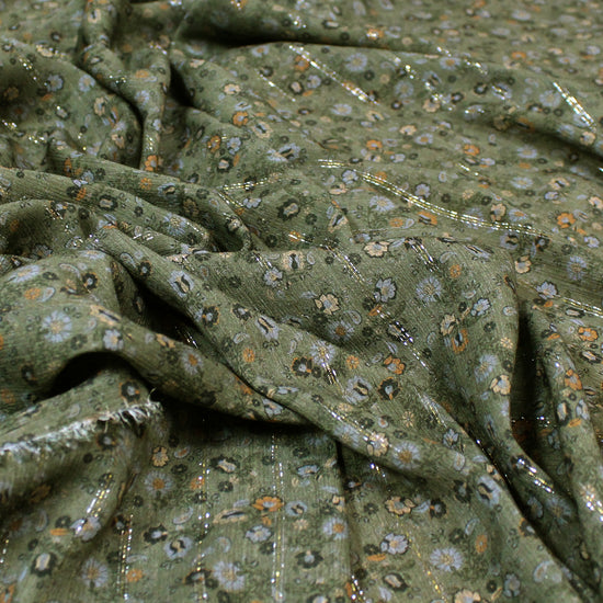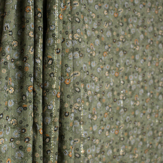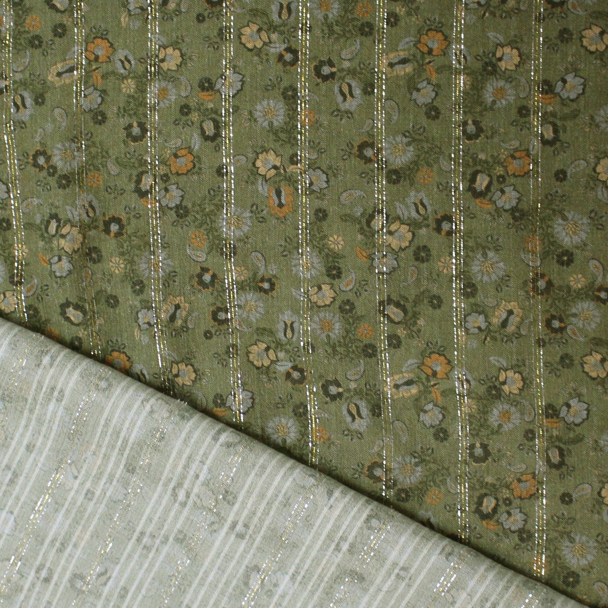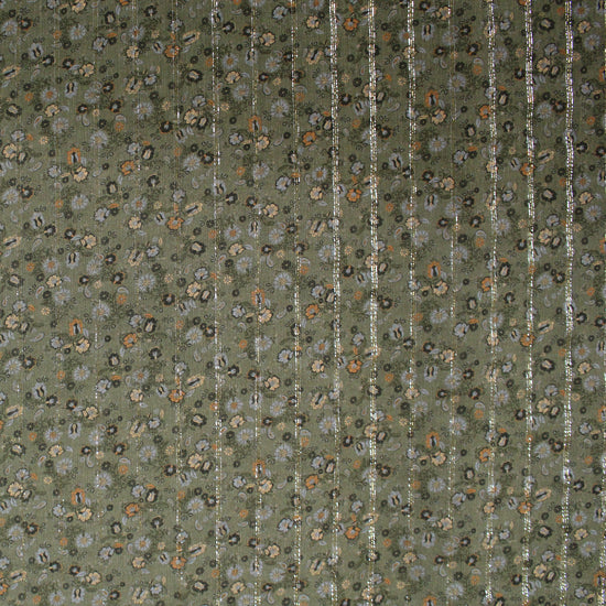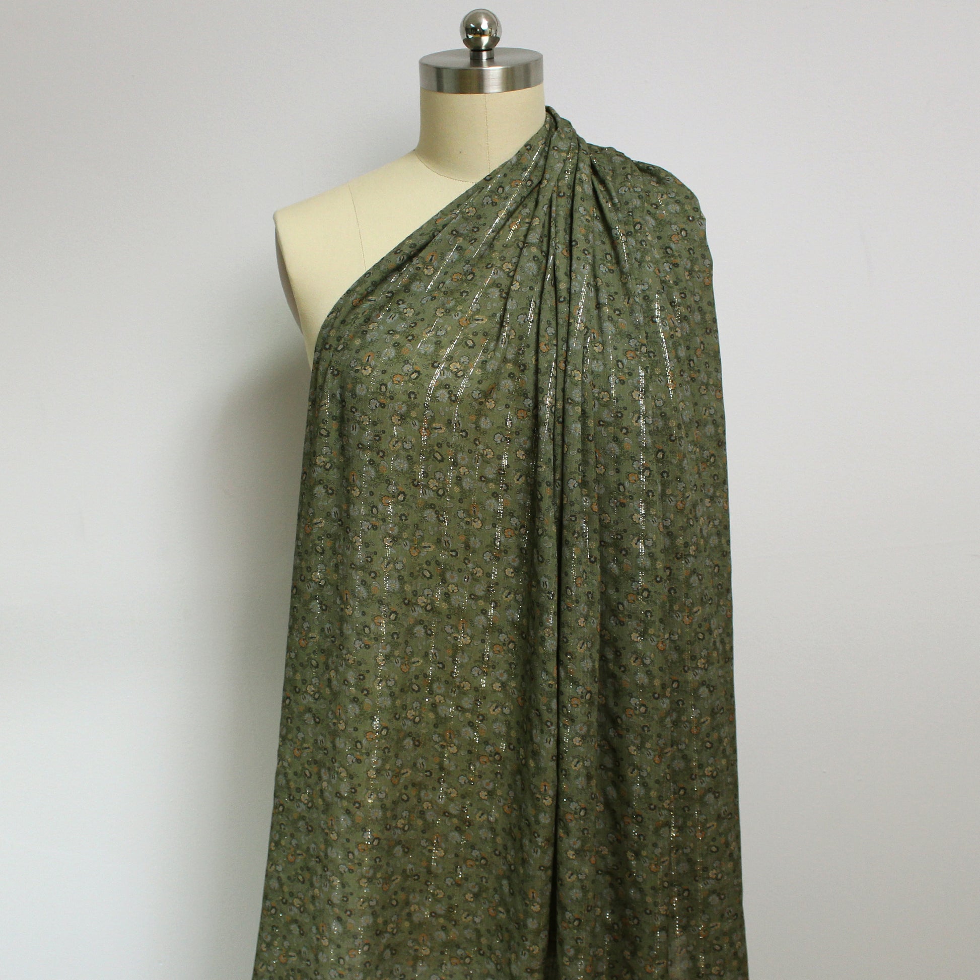 This is an understated yet fantastically beautiful rayon woven with a crepe texture, a lightweight woven that is just about opaque with the softest hand and flowing drape. The "glisten in the garden" design has an 4" vertical repeat with a pinstripe in metallic gold and silver running vertically every 1", The print is somehow neutral, whimsical, and luxe all at once, using a mix of soft and muted earthtones. The touch of metallic elevates the elegance factor while the florals are soft and organic. A perfect choice for a casual top, blouse, tunic, dress or skirt, resort or loungewear, even a lightweight scarf. Hand or machine wash, hang to dry.