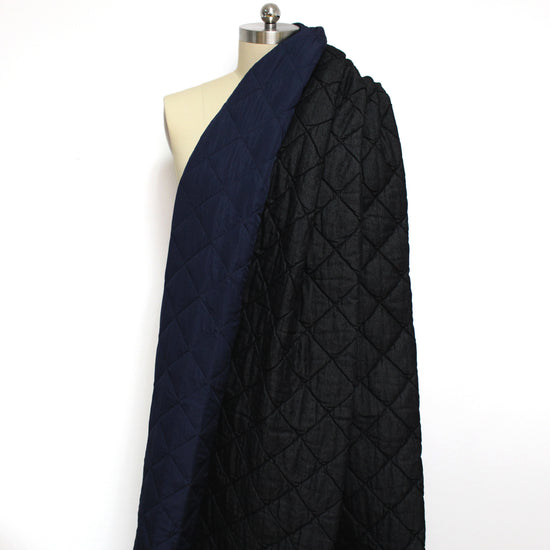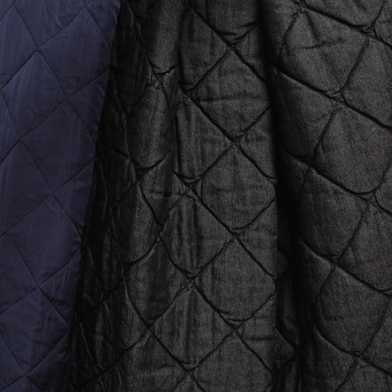 From the Netherlands, this amazing quilted jacketwear has a denimy cotton face and polyester lining with one layer of batting in between. This Oeko-Tex certified fabric is quilted in a diamond pattern with a 3.5" repeat. It is cozy, but not dense feeling and measures about 1/4" thick. The face is woven in black with soft white cross threads for an overall impression of soft black, and the reverse is a marine blue. It is soft and warm with a dry hand and the reversible design offers exciting possibilities! Make a mid-weight jacket, vest or coat. Some styles will pair well with ribbing for cuffs, waist and collar. Hand wash cold or dry clean and iron on low.