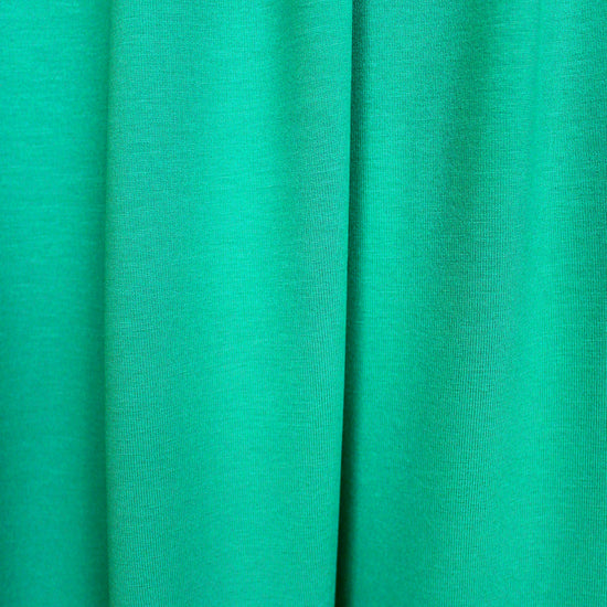 (PANTONE 17-5126) A beautiful 11 oz. rayon/spandex single knit jersey in a vivid and bright jade. Rayon/spandex is cool, comfortable, incredibly soft and drapey. It has about 60% stretch in both directions with great recovery, and is great for trendy tops and tees, tunics, dress, flowing skirt. Not at all sheer but it still lightweight. Machine wash gentle, hang to dry.