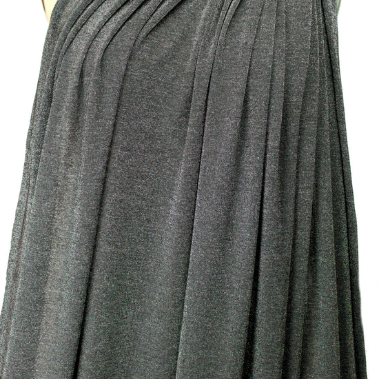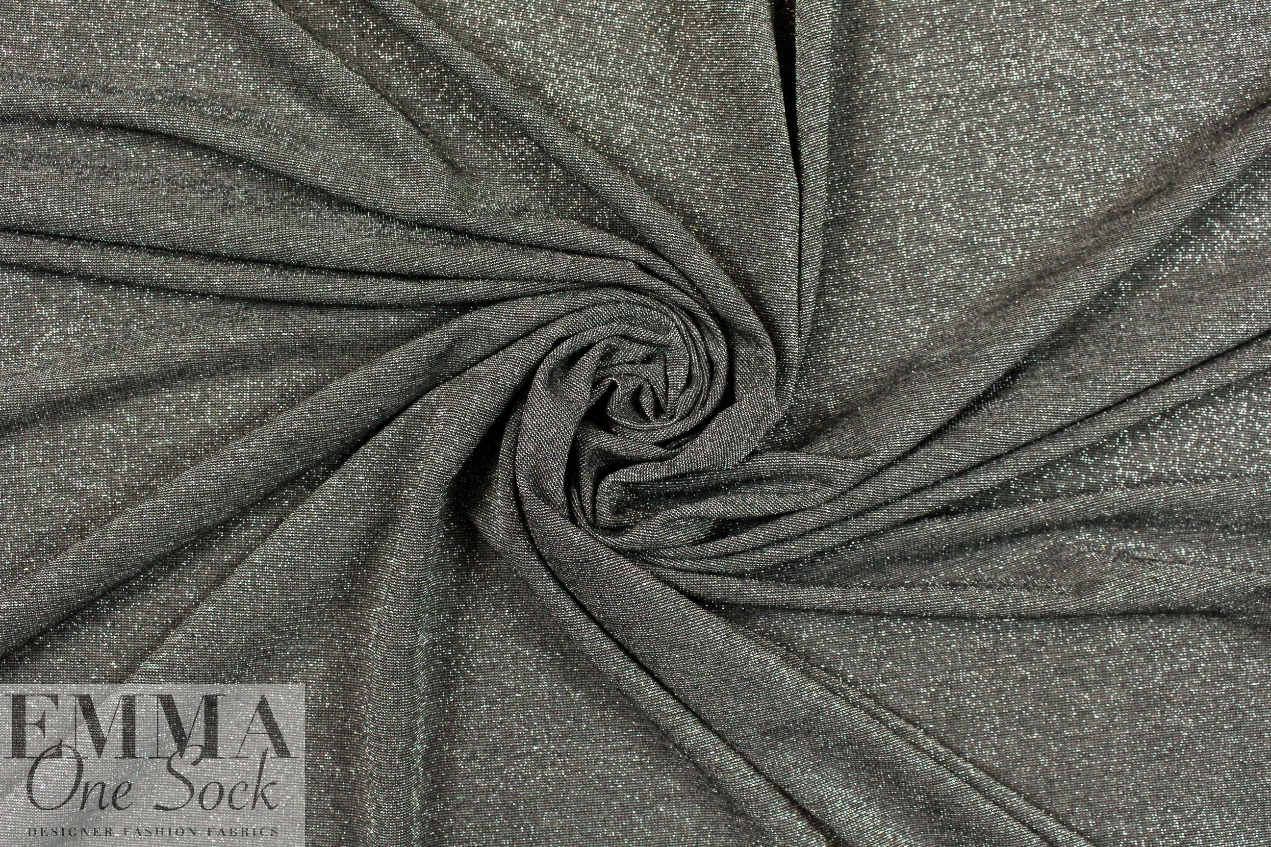 A beautiful 11 oz. jersey mixing black and silver metallic. This jersey is smooth, drapey, cool, comfortable, has great recovery, and the 11 oz. weight is fabulous for trendy tops and tees, slinky dresses, etc. 80 % stretch in both directions with great recovery. Hand wash in cold water, hang to dry.