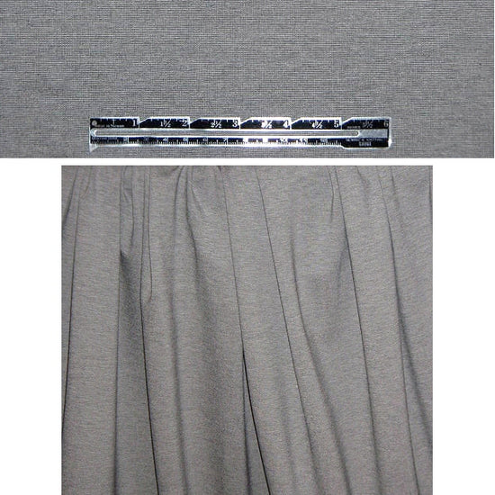 This high-percentage spandex blend ponte 4-way stretch knit is a fantastic basic and a top-seller for EOS! The color is medium gray, actually a micro stripe mix of black and white, it's opaque, substantial, and the extra spandex provides super strength and recovery. It has a nice drape but is firm and stable. Top quality, and perfect for any type of skinny pants, body-hugging dresses, skirts, etc. About 15% stretch in both directions. Hand or machine wash cool, hang to dry.
