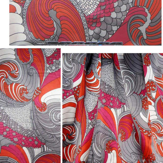 A stunning silk charmeuse fabric made in Italy, drapey, substantial and opaque with a pleasing surface sheen. The print is just exquisite: a "mod" decorative plume design in black, silver, hot pink, spicy coral and white (PANTONE 17-2127, 16-1349, 14-4103-ish, etc.), with a 28.5" repeat. Perfect for a blouse, dress, gown, tunic, top, elegant lining for a jacket, etc. Dry clean, or test first if you wish to try hand-washing. LAST PIECE, 2.33 yds.
