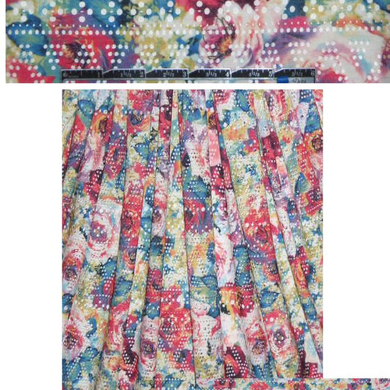 This is a fabulous "perforated" jersey knit, drapey and lightweight with 20% widthwise, 10% lengthwise stretch and perfect recovery. The perforated knit is overprinted with a lovely floral rose design (21" repeat) in tones of flamingo, denim, lemon, white, pink, etc. (PANTONE 17-1930, 12-0736, etc.). Please test first, but it's probably fine to machine or hand wash gentle, hang or lay flat to dry. 1.4 yds.