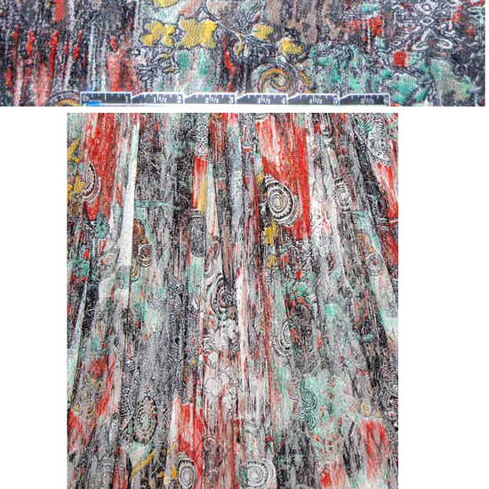 This is a poly/lycra stretch lace knit with 30% widthwise stretch and perfect recovery. It has lots of drape, and it's very lightweight and semi sheer. The print is a fun and summery abstract with poppy-red, golden yellow, aqua, black and white (PANTONE 18-1763, 14-0760, 14-5413, etc.). I've photographed it both black and white backgrounds to show the print and the sheerness. Perfect for tops, tees, tunic, etc. Some styles will need lining or layering. Hand wash, hang to dry. LAST PIECE, 1.125 yds.