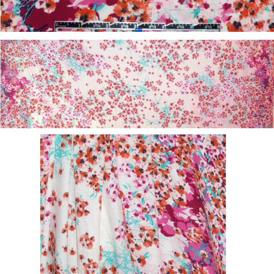 A lovely vintage floral border print on a drapey and lightweight viscose woven, this features flowery clusters in shades of hot pink, fuschia, light jade, tangerine and soft white (PANTONE 17-2230, 19-2434, 16-5127, etc.). Make a drapey and flowing blouse, top, tunic, or line for a dress or skirt. If you wish to wash at home, please test first.