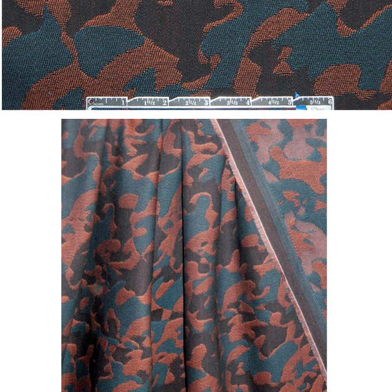 This is an Italian cotton stretch jacquard tapestry weave brocade, a heavier suiting weight with about 20% widthwise stretch. The design featured interlocking organic shapes in tones of cedar, teal and black (PANTONE 17-1525, 19-4316). It has a more firm drape and is perfect for a sophisticated jacket, coat, tapestry bag, or even winter season skinny pants. Dry cleaning recommended.