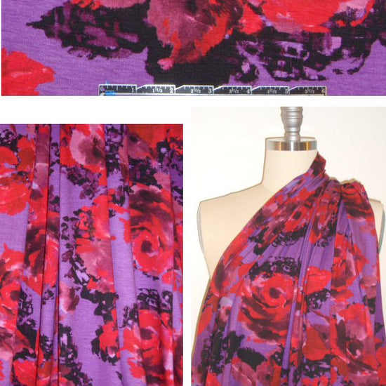 From Karen Kane, this is a beautiful rayon/lycra 4-way stretch knit, lightweight, with lovely drape, and the print is a fabulous large floral in shades of violet, poppy, black, and shadings thereof (PANTONE 18-3531, 18-1762, etc.). 30% stretch in the width, 15% in the length, with great recovery. Drapey, opaque, and great for tees, tops, tunics, dresses, etc. Test first if you would like to hand or machine wash, cold, hang to dry.