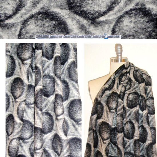 JUST IN with a new shipment from Italy, this amazing boiled wool fleece is just right for a fabulous cozy cardigan, sweater jacket, cape, etc. The design is knitted in (not a print) and is seen as a flat weave on the reverse. The "peas in pod" design is a mix of black and shades of gray (PANTONE 14-4501, etc.). The fabric has a knit construction but its brushed and fleecy texture make it quite stable with just 15% stretch in the width only. It's not super thick but has a lot of body in the drape so it's best for fitted or very simple styles. Dry cleaning recommended. 1.625 yds.