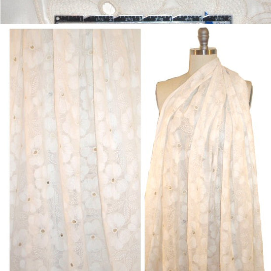 This is a beautiful embroidered eyelet crepey sheer from a CA designer, an ivory-toned poly sheer with ivory cotton floral embroidery and eyelets in the center of each flower (PANTONE 11-0602). The selvages are embroidered with a scalloped edging. It has a lovely drape, with a bit more substance and body because of the embroidery. It's a perfect overlay for a blouse, top, tunic, dress, skirt, maxi-dress, etc. Dry clean, or test first if you wish to hand wash and hang to dry.