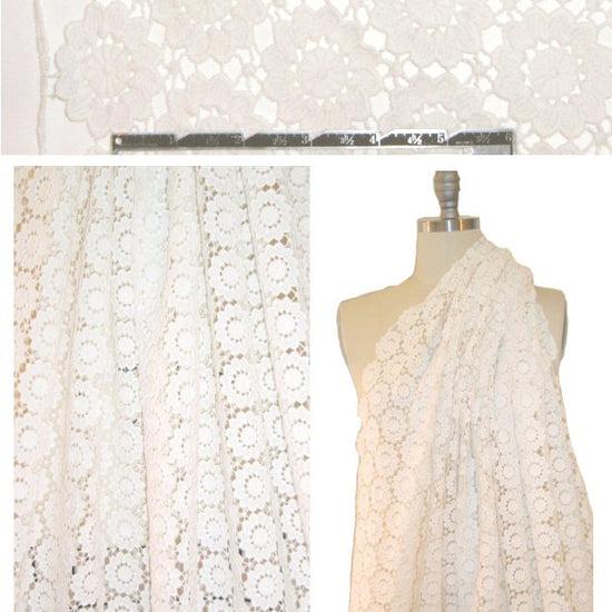 From The0ry, this cotton guipure lace is so lovely! The flowery graphic design in a soft, creamy white has lots of texture and interest. This lace is photographed on a white background, as well as on the dress form which shows the open weave. The flower pattern goes all the way out to the selvages which have a thin strand connecting the scallops, but that should be cut away to show the shaped selvages on both sides. Use for any project calling for guipure lace or any type of fancy, stable lace. Dry cleaning recommended.